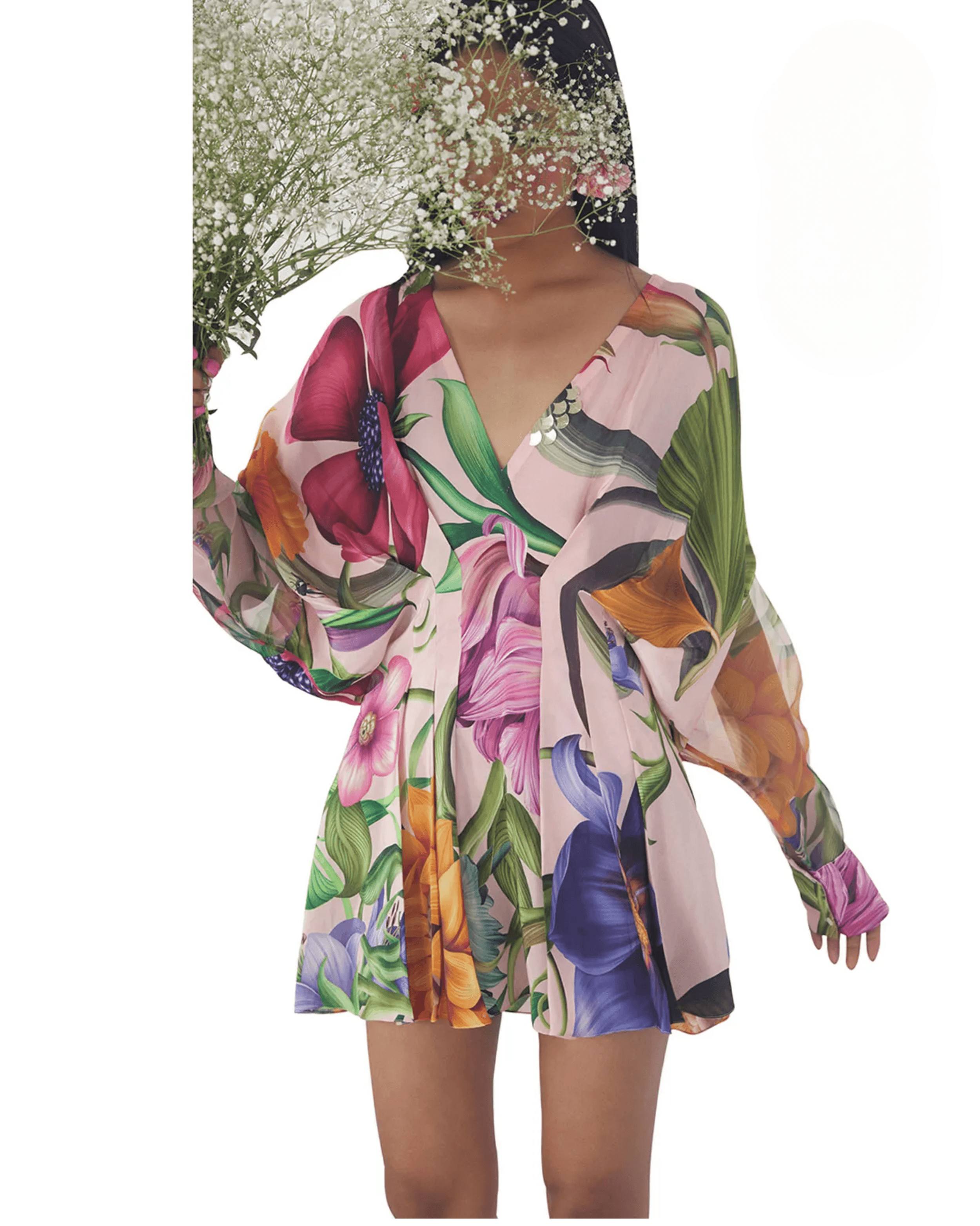 Crafted from luxe crepe, this draped dress comes with gold detailing along the neckline and draped sheer sleeves. The print on the dress is inspired by statement mughal floral motifs.