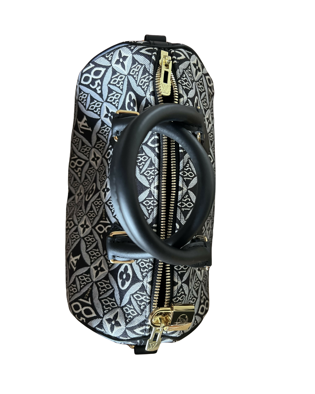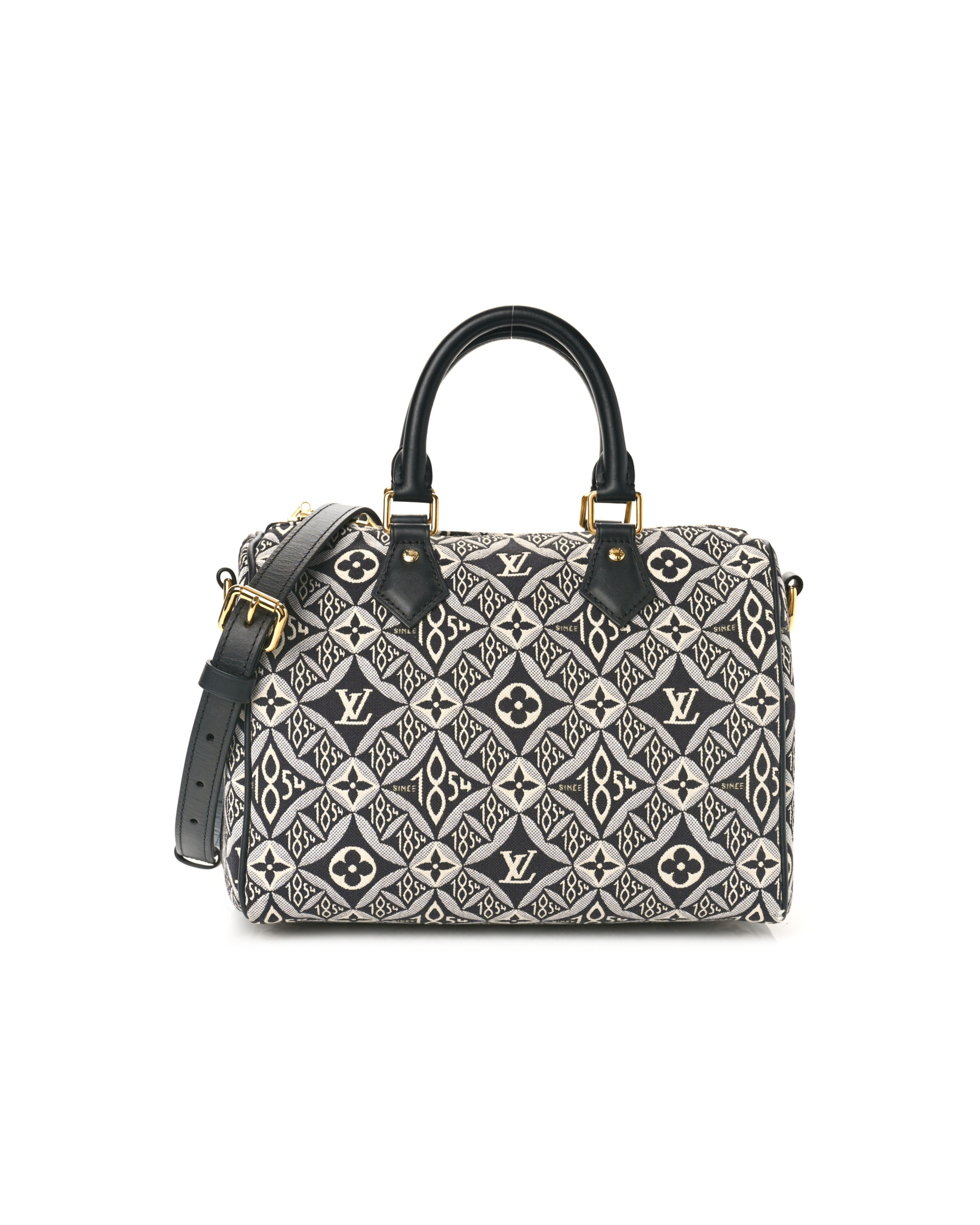 This is the Louis Vuitton Since 1854 Speedy Bandouliere 25 handbag, featuring the brand's iconic monogram in a jacquard textile pattern. The design showcases a refined black and white color palette with a repeated motif that blends the LV initials, fleur-de-lis, and "1854" the year Louis Vuitton was founded all woven into the fabric. The bag includes black leather trim, gold-tone hardware, dual rolled leather handles, and a top zip closure with a signature LV padlock. Timeless yet modern, this piece reflects the heritage and elegance of the Louis Vuitton Maison.