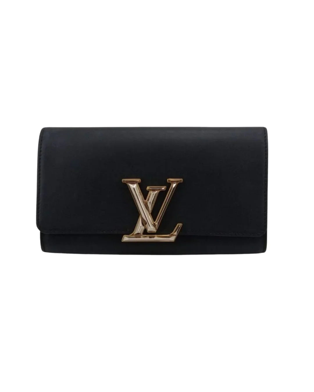 Elegance meets timeless luxury in the Louis Vuitton Pochette Louise. Crafted from smooth black leather, this sleek evening clutch features the iconic LV initials in a polished, gold-tone metal as the central focal point. The structured silhouette and refined flap closure make it a sophisticated choice for formal occasions or elevated everyday wear. With a compact yet practical interior, it offers enough space for essentials while maintaining an effortlessly chic appearance.