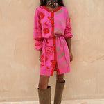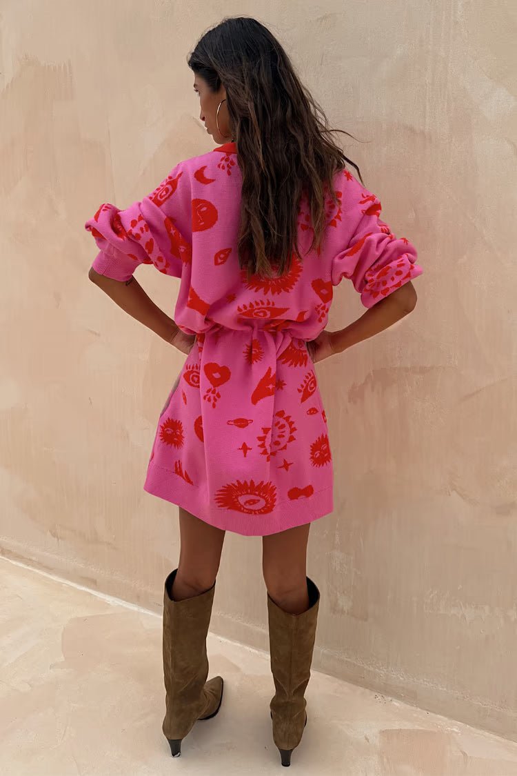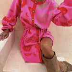We're channelling some of classic NFD prints this season with an elevated twist! Featuring some of our iconic motifs such as, our hand, heart and eye motifs on a bright pink base that brings feel good dressing straight to your wardrobe! The drawstring tie creates a cinched waist that shows off your silhouette while the button up front fastening allows you to style in a multitude of ways!