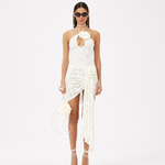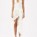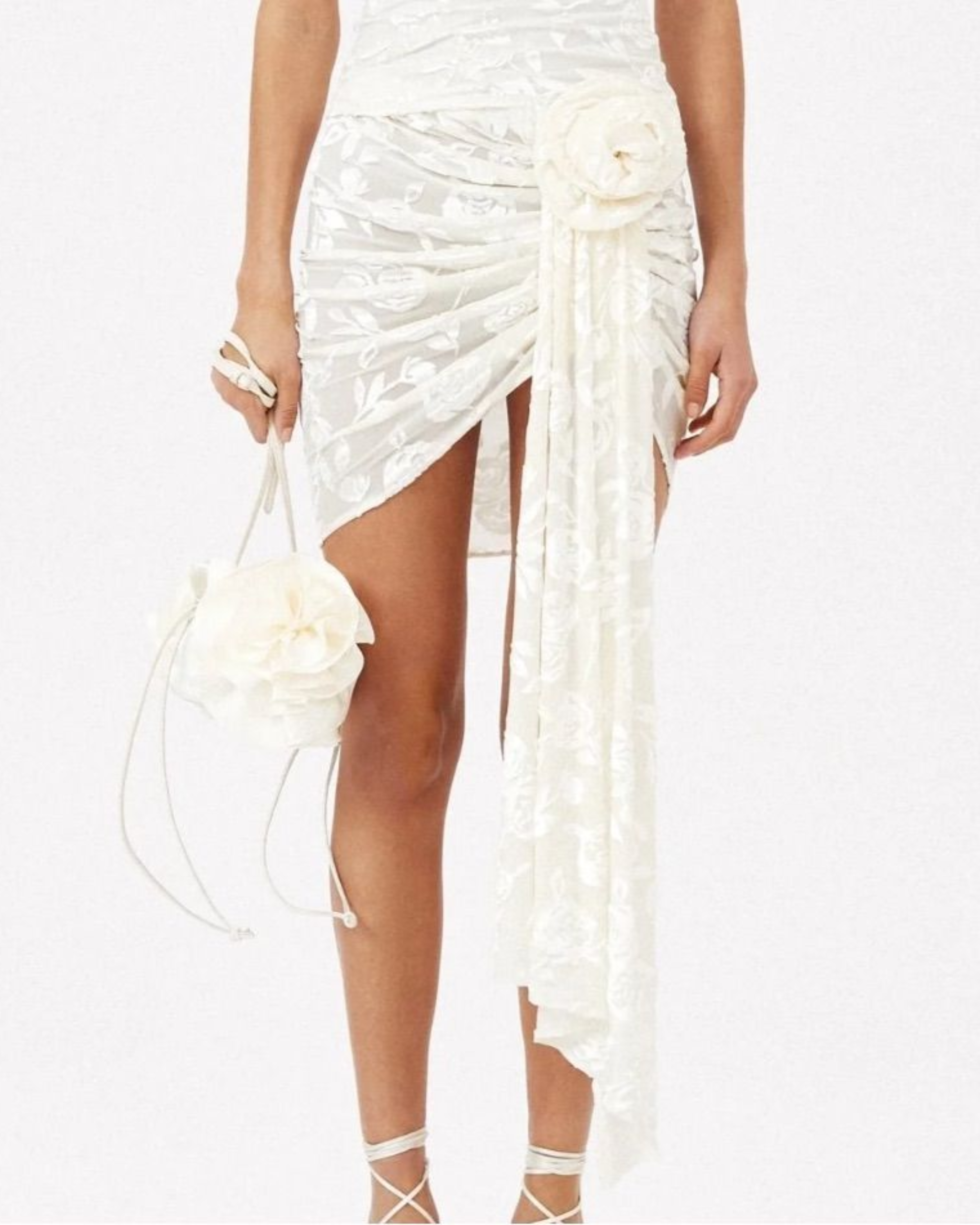 A statement two-piece from Magda Butrym featuring the brand’s signature floral detailing. The halter-neck top is cut with a front keyhole and finished with an oversized rose appliqué, while the matching mini skirt is draped and ruched with a cascading sash and coordinating floral detail. Crafted in ivory jacquard with a subtle floral motif, this set balances feminine romance with modern edge.