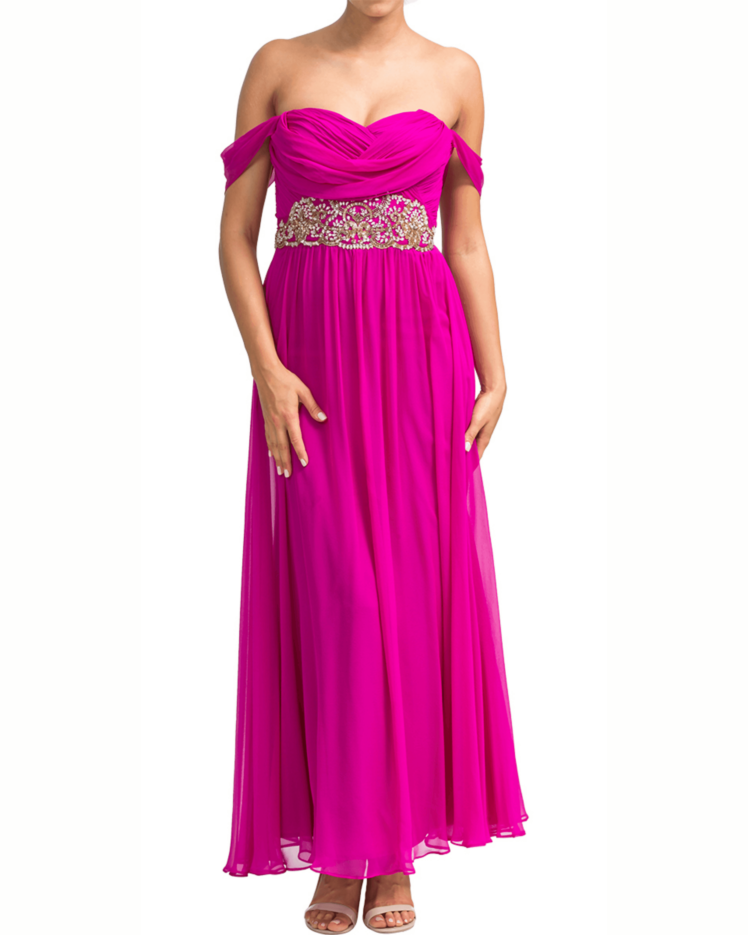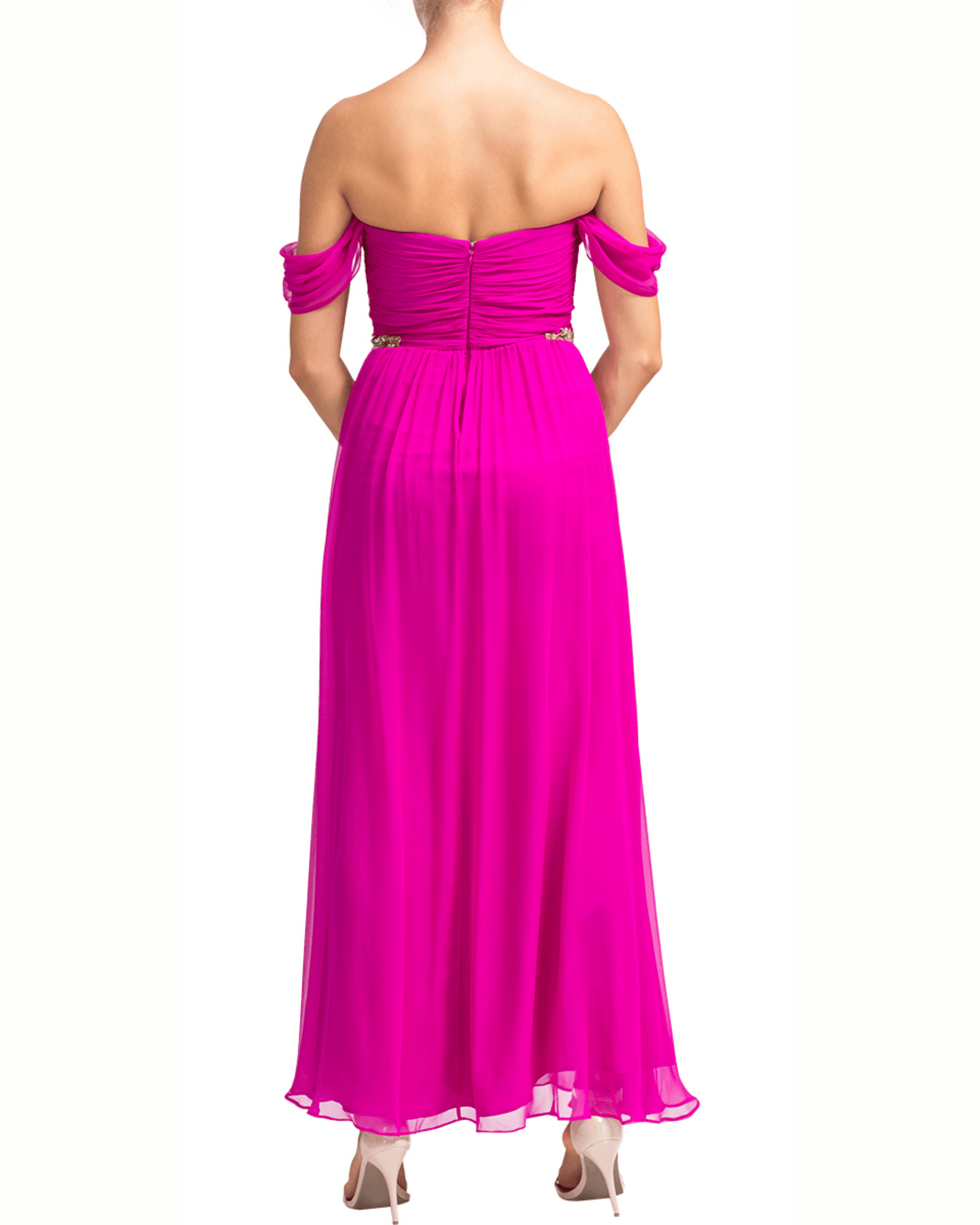 An apt choice for black-tie events and cocktail parties, this Grecian gown from Notte By Marchesa features a draped style bodice accented with pressed creases running down to a fluid chiffon bottom. The beautifully embellished waistline is the highlight of this outfit which is finished with a zip closure at the rear and thin shoulder straps
