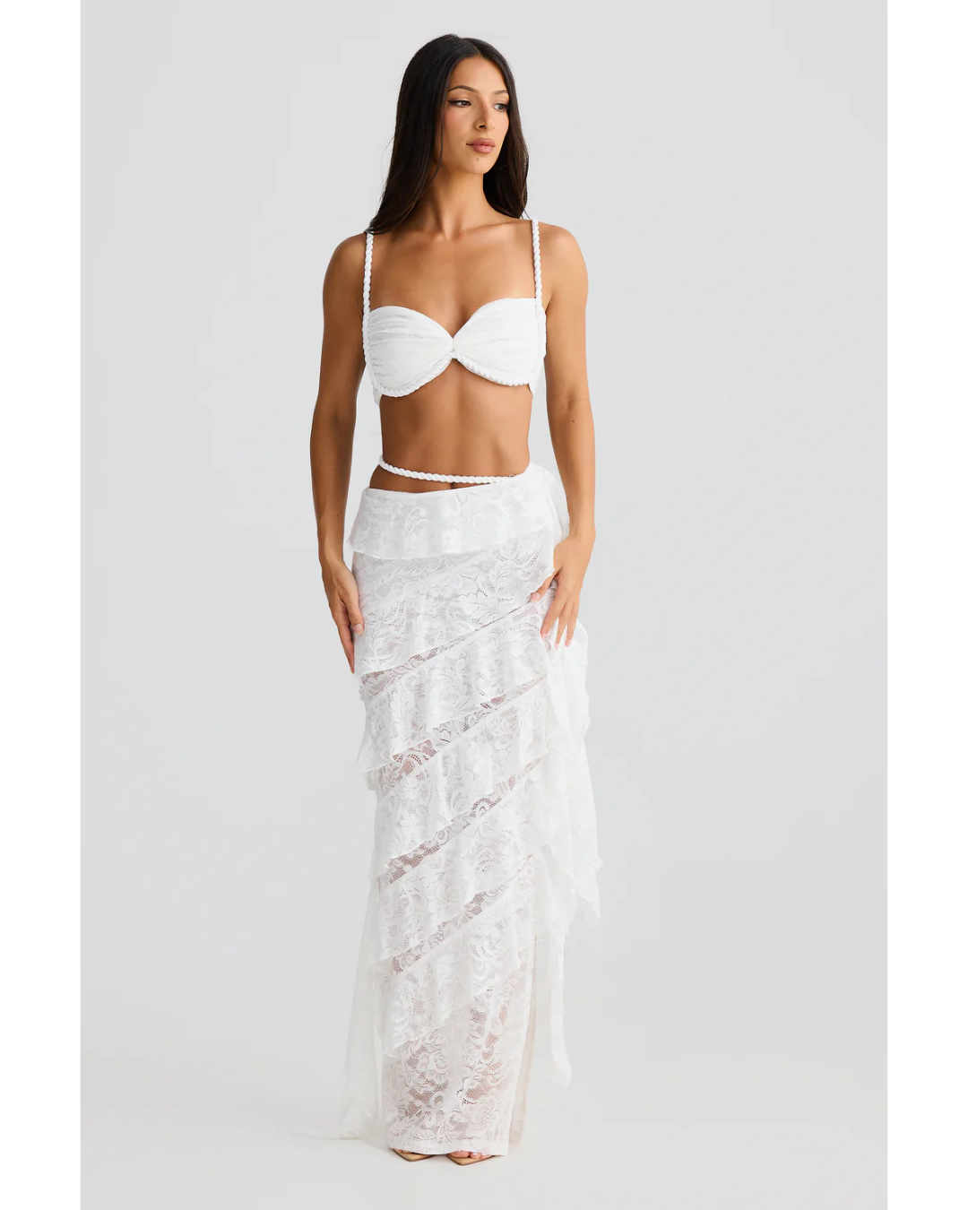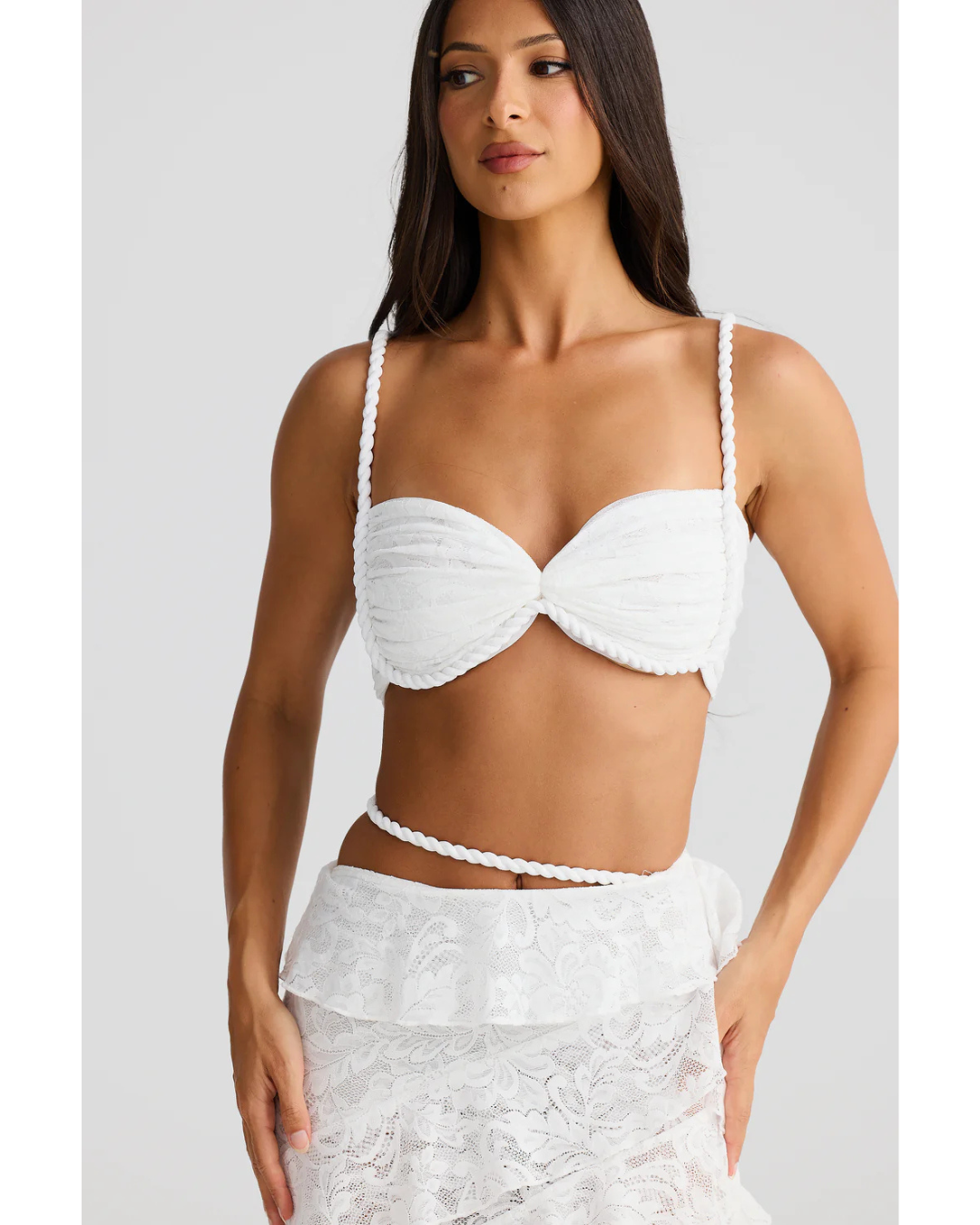 The perfect vacay piece, AHRIA features a sweetheart neckline, gold metal back closure, and signature hand-crafted rope detailing. Paired with a stretch lace skirt finished with soft ruffles and a MELANI twist, this set blends elegance with effortless resort style.