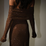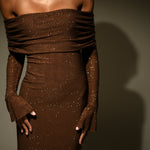 The MARCEL is a fitted maxi dress with a straight skirt and long sleeves. The off-shoulder neckline pairs perfectly with the fabric overlay over the bust, while the long sleeves have been designed to cinch to your arms before transitioning into flared hems around the wrist and palm. Adorned with rhinestones, Marcel's stretchable material promises both comfort and shimmer.