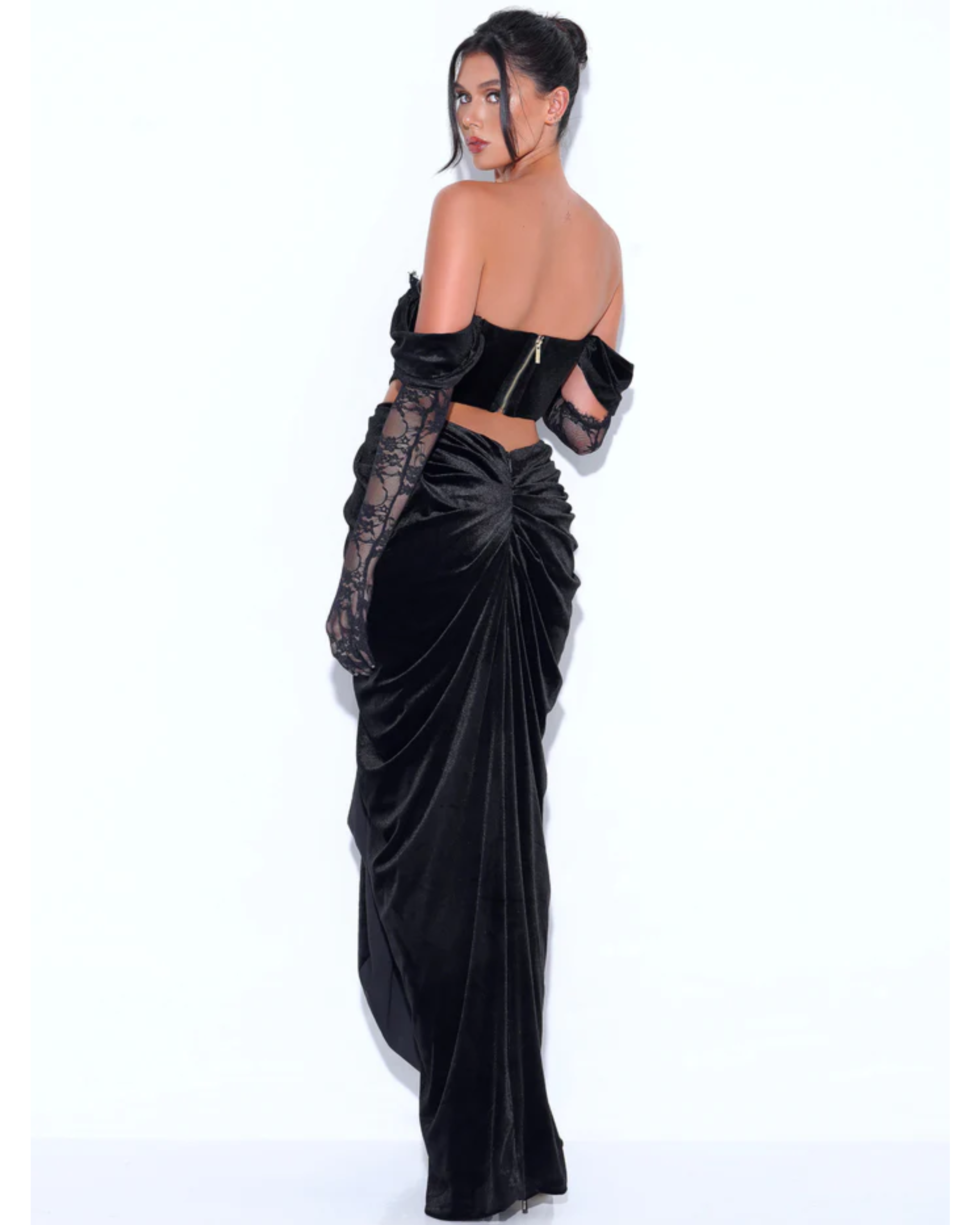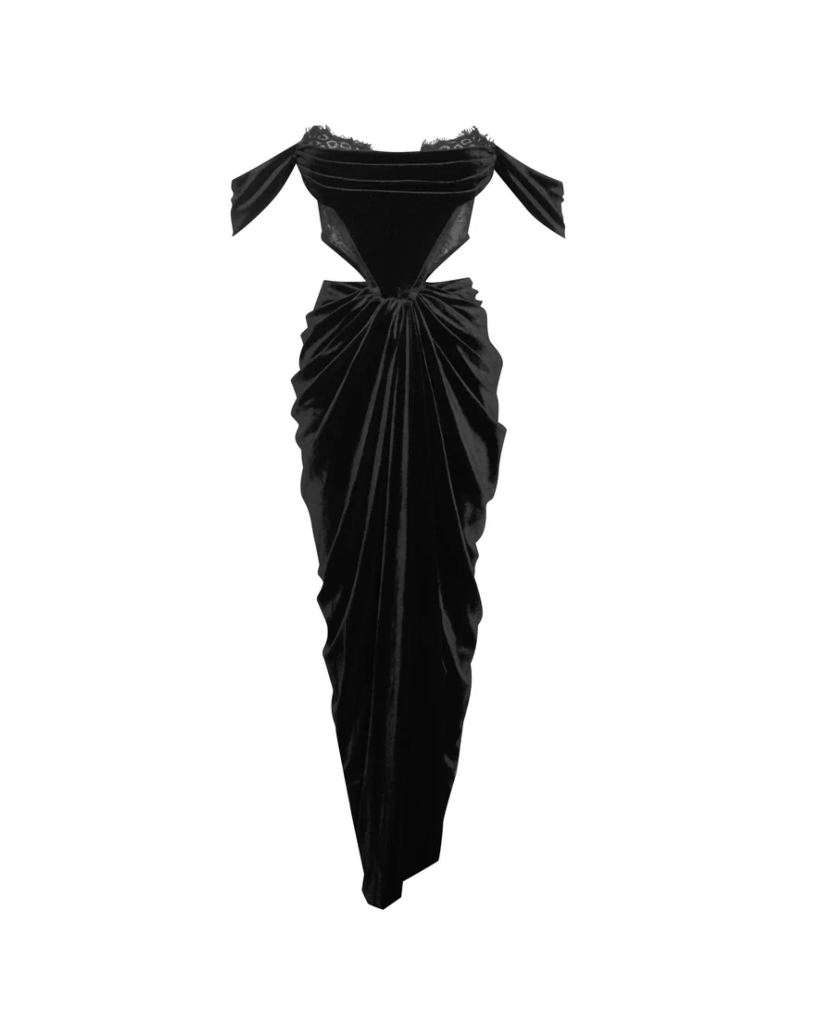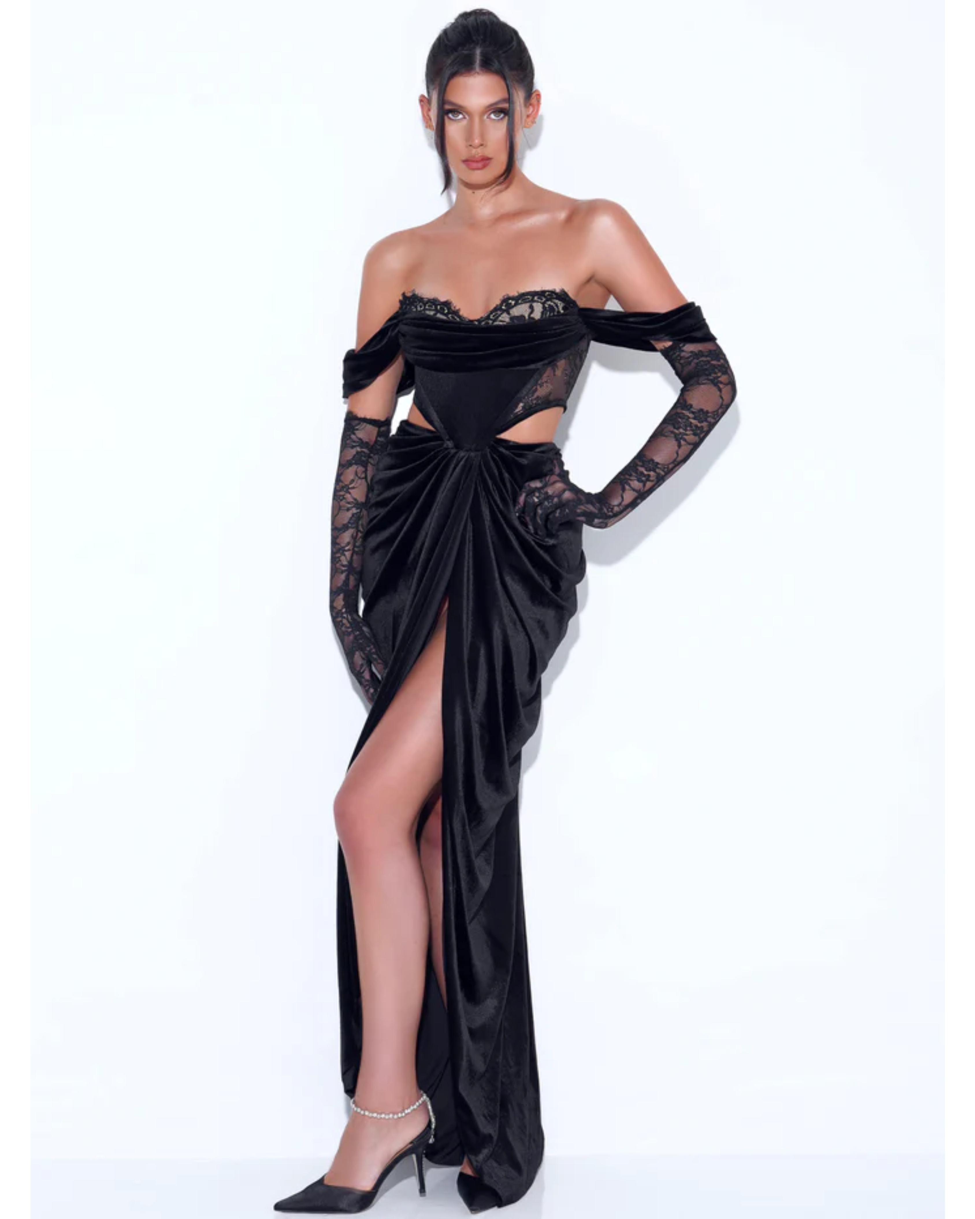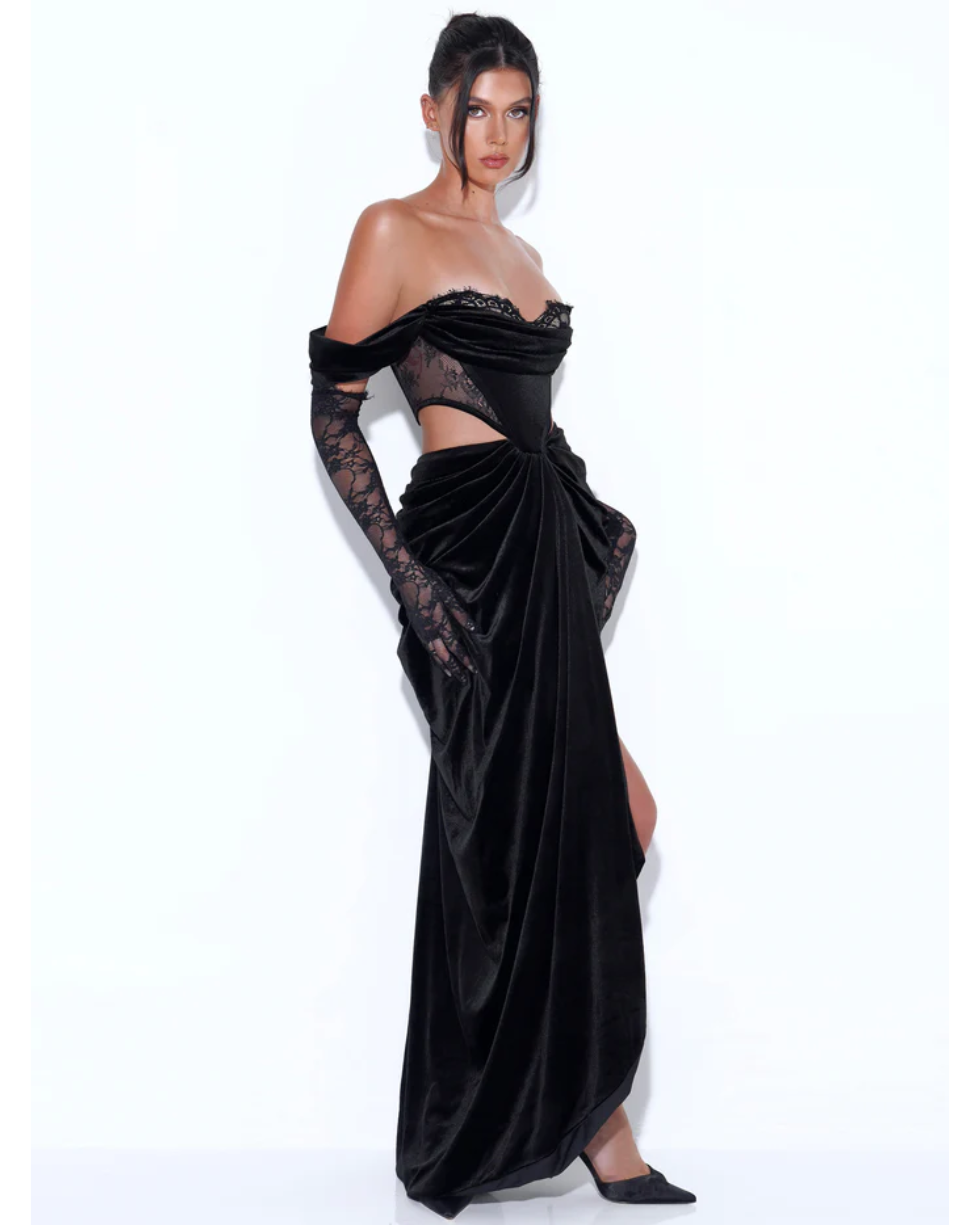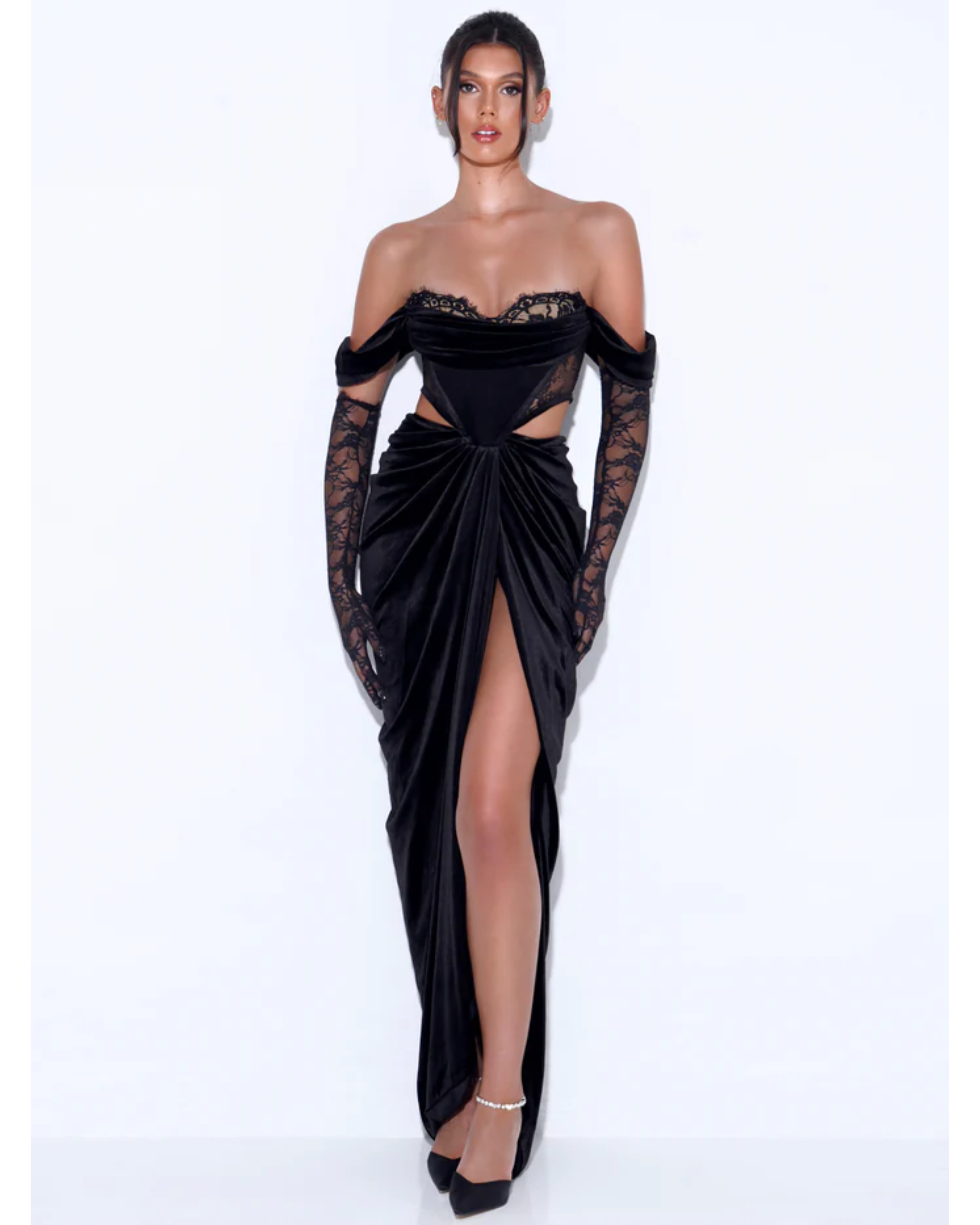 Quintessa Black Lace Velvet Corset Off Shoulder Gown