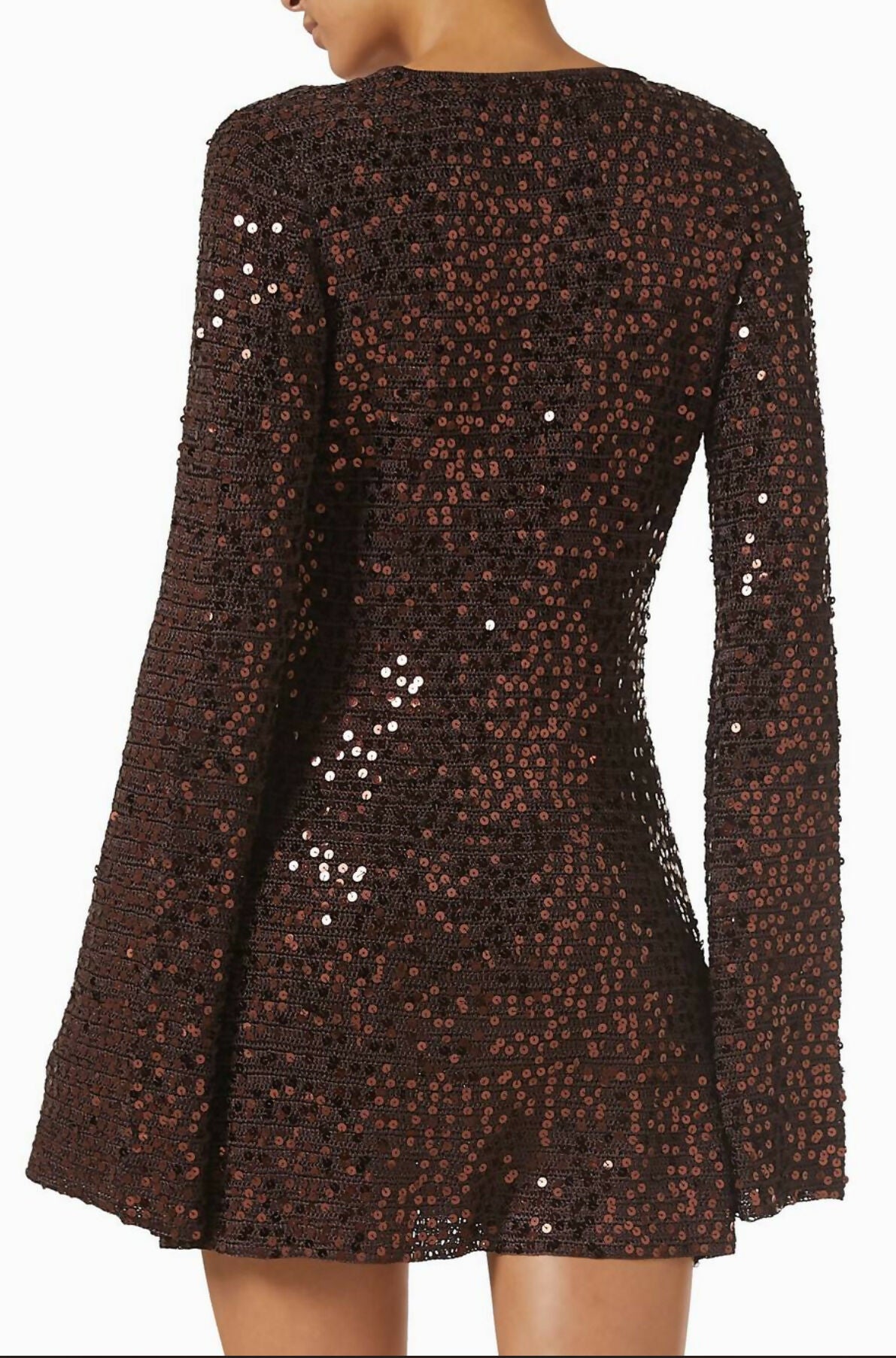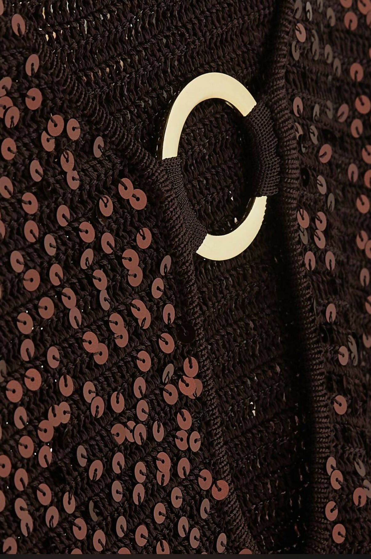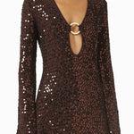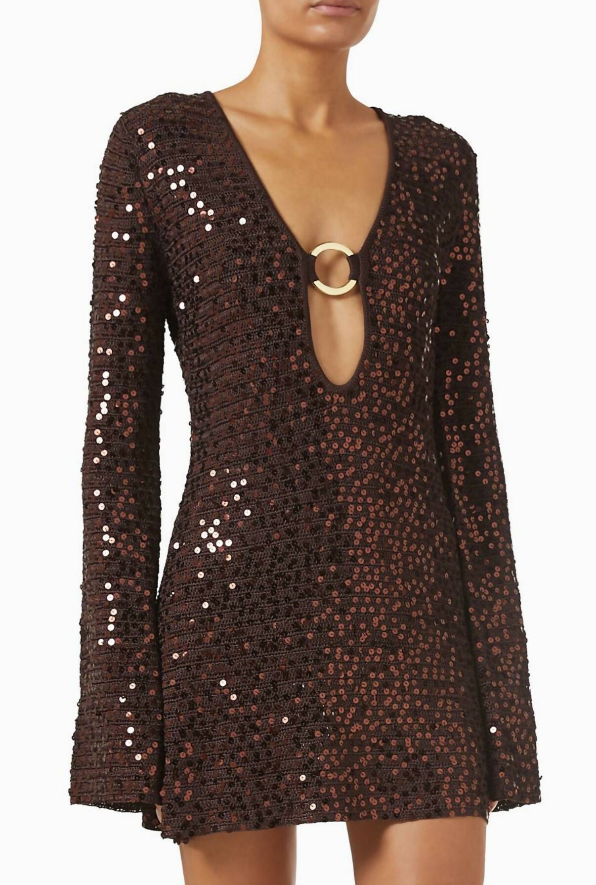 A sheer brown knit dress embellished with sequins and finished with a gold-tone ring detail at the plunging neckline. Designed unlined for a lightweight drape and crafted in a rayon blend with subtle shimmer.