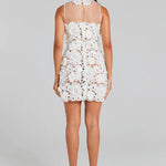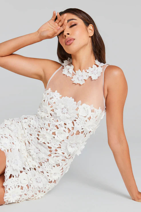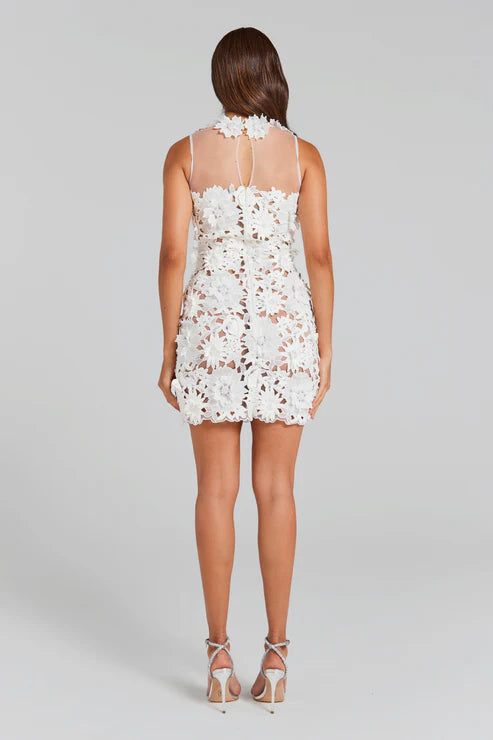 MILLIE is designed to be sheer. We recommend wearing a tonal nude slip or underwear underneath for extra coverage.From daytime dining to celebrations at sunset in MILLIE. A statement piece for an unforgettable moment. The sleeveless white high-neck 3D floral appliqu©d embellished mini dress features bespoke handcrafted lace appliqu©d flowers with hand sewn pearl detailing that cascade down the dress to create a delicate display of beauty and elegance. Featuring hand-cut appliqu©d flowers placed along the neckline, a keyhole button fastening behind the neck for support accompanied by a pearl button, and a sheer mesh yoke panel that separates the intricate floral neckline from the bust. The floral pattern continues down the bodice to the hem which is cut to shape. Finished with an invisible zipper for a sleek finish. - 3D floral appliqu©s