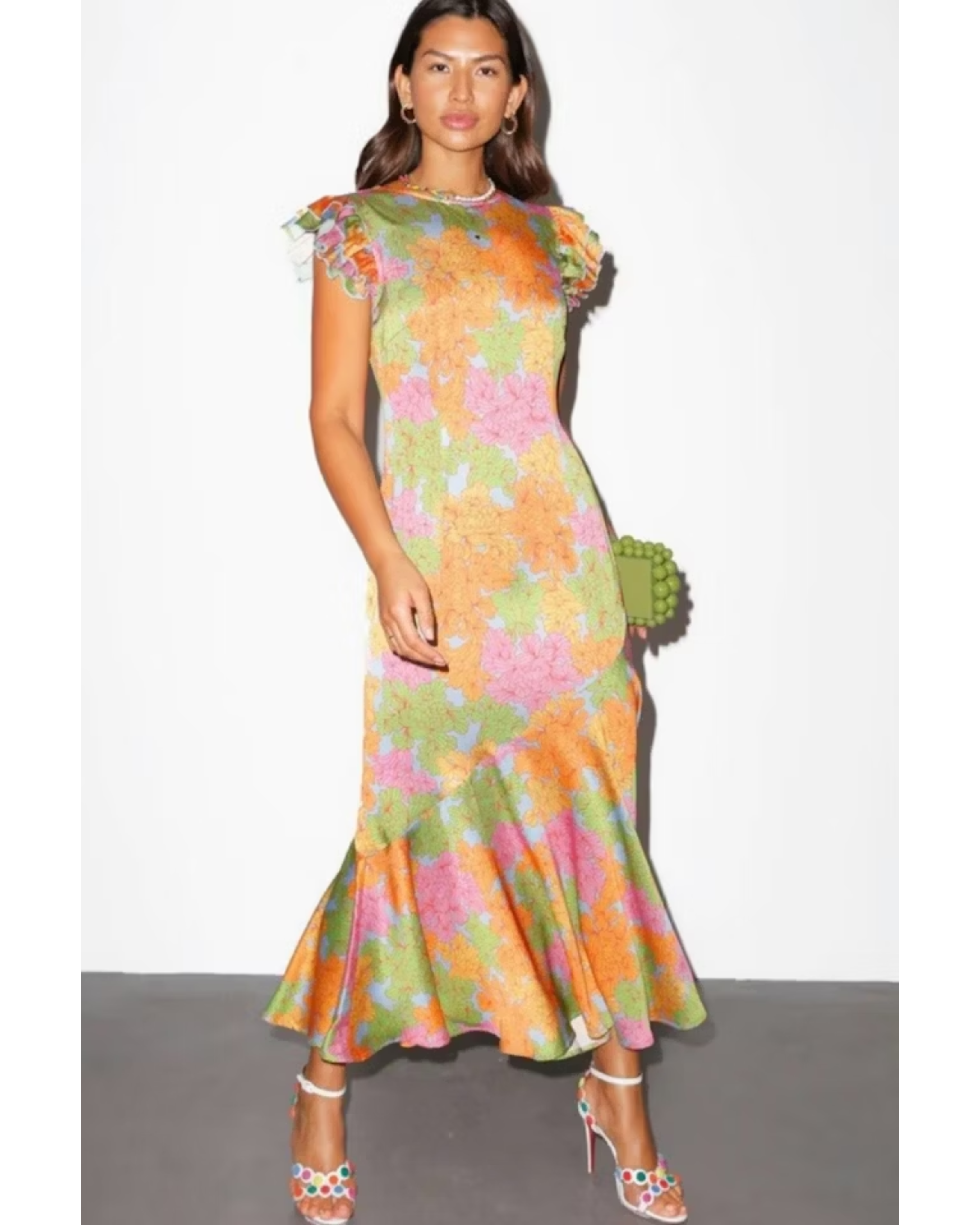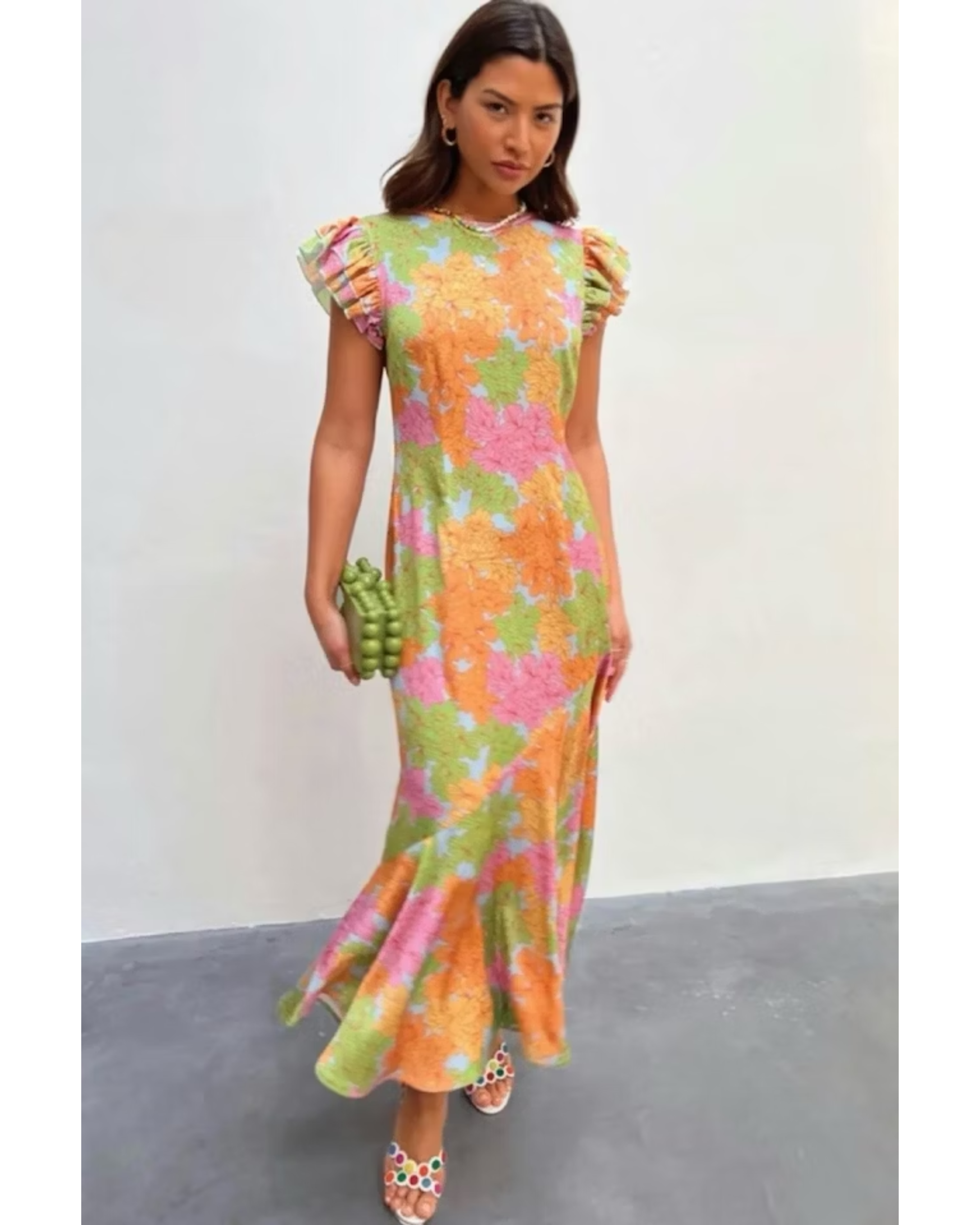 Beautiful silky dress, bold and unique pattern. Bias cut hem and ruffle sleeves make this super flattering!