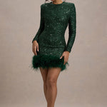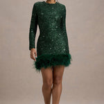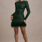 Claudia Bottle Sequin High Neck Feather Hem Mini Dress
