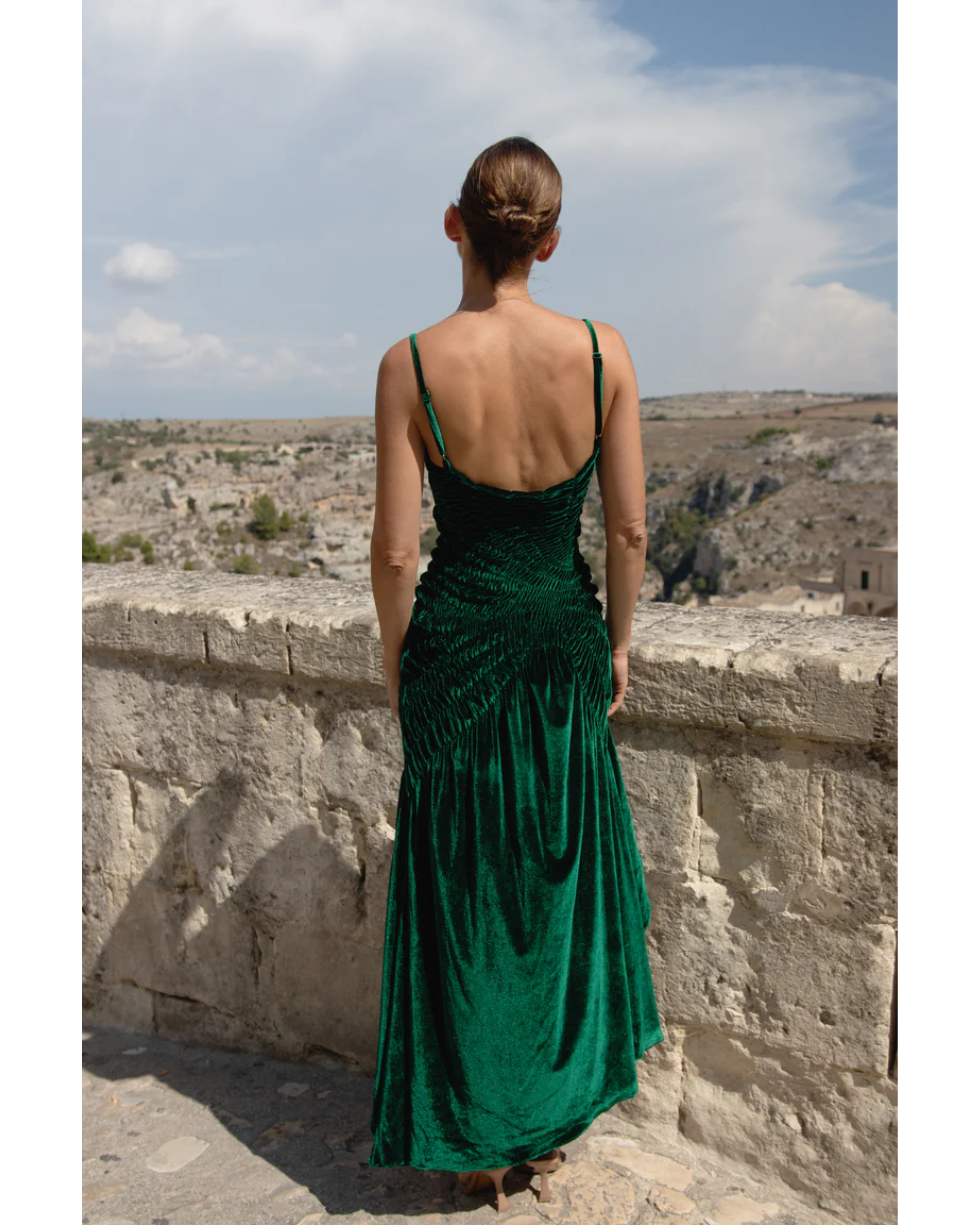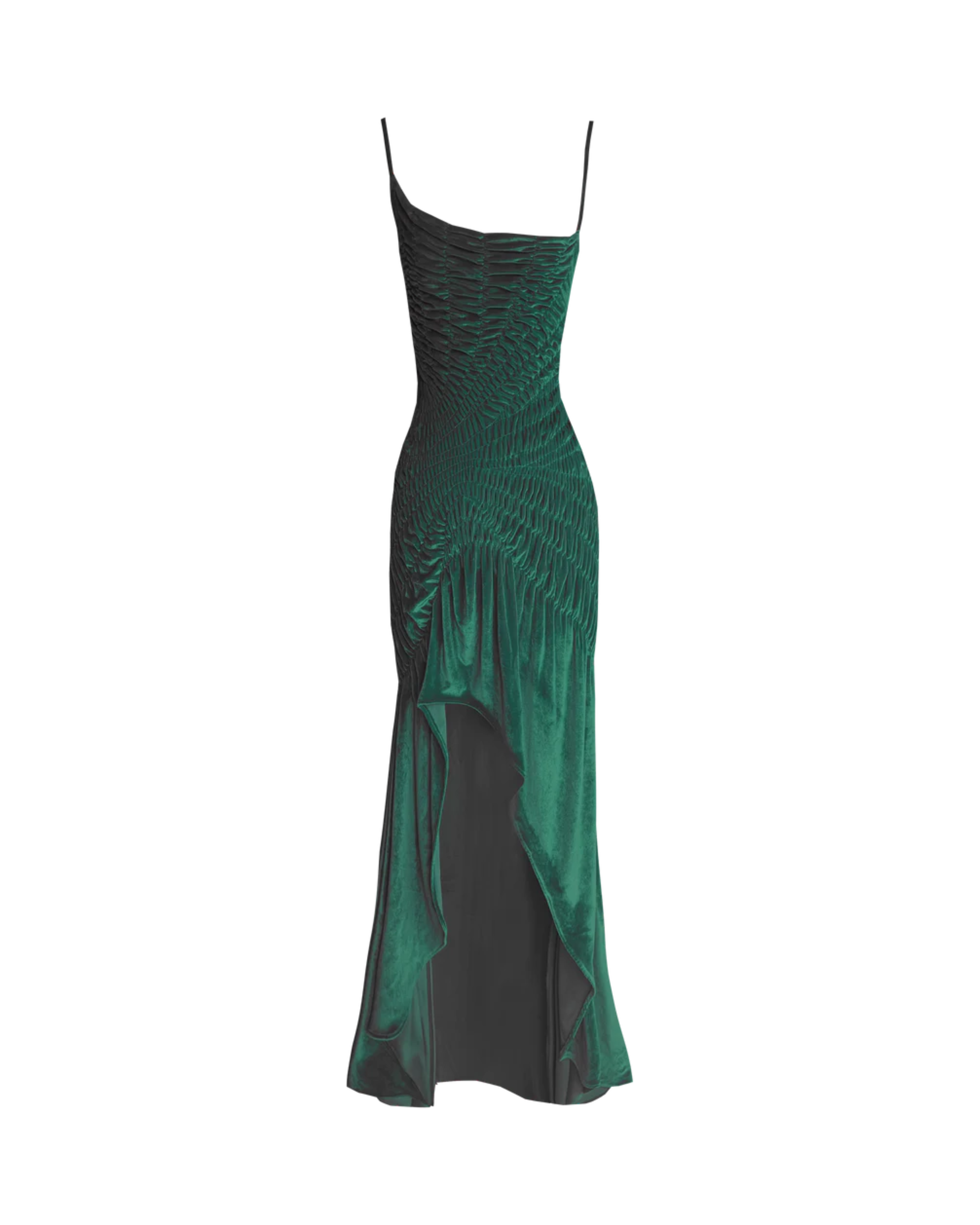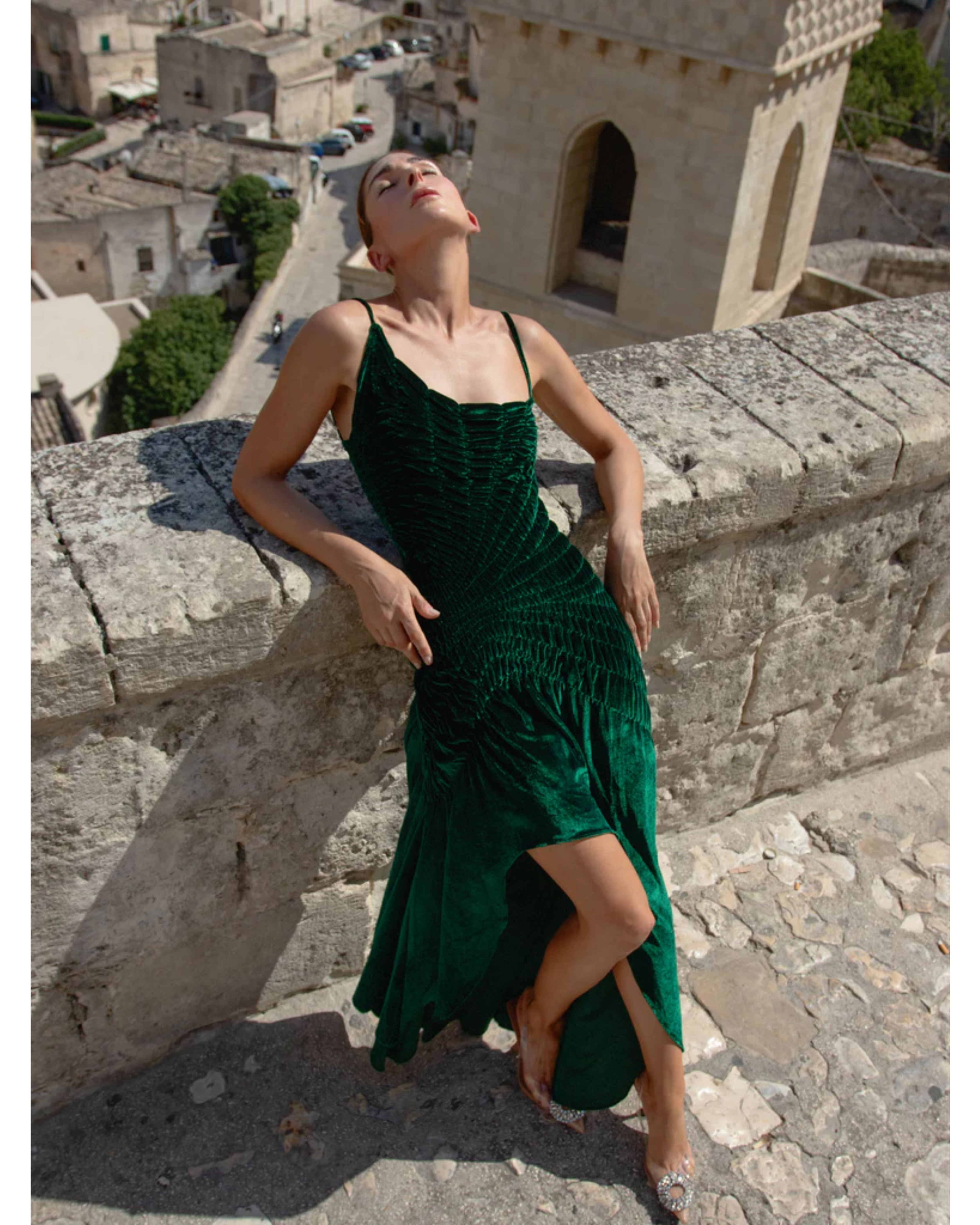 It's crafted from a soft plush velvet, that gives a slight lustre as it drapes into an asymmetric mid length dress with a raised hem in front. The perfect dress for a glamorous occasion.