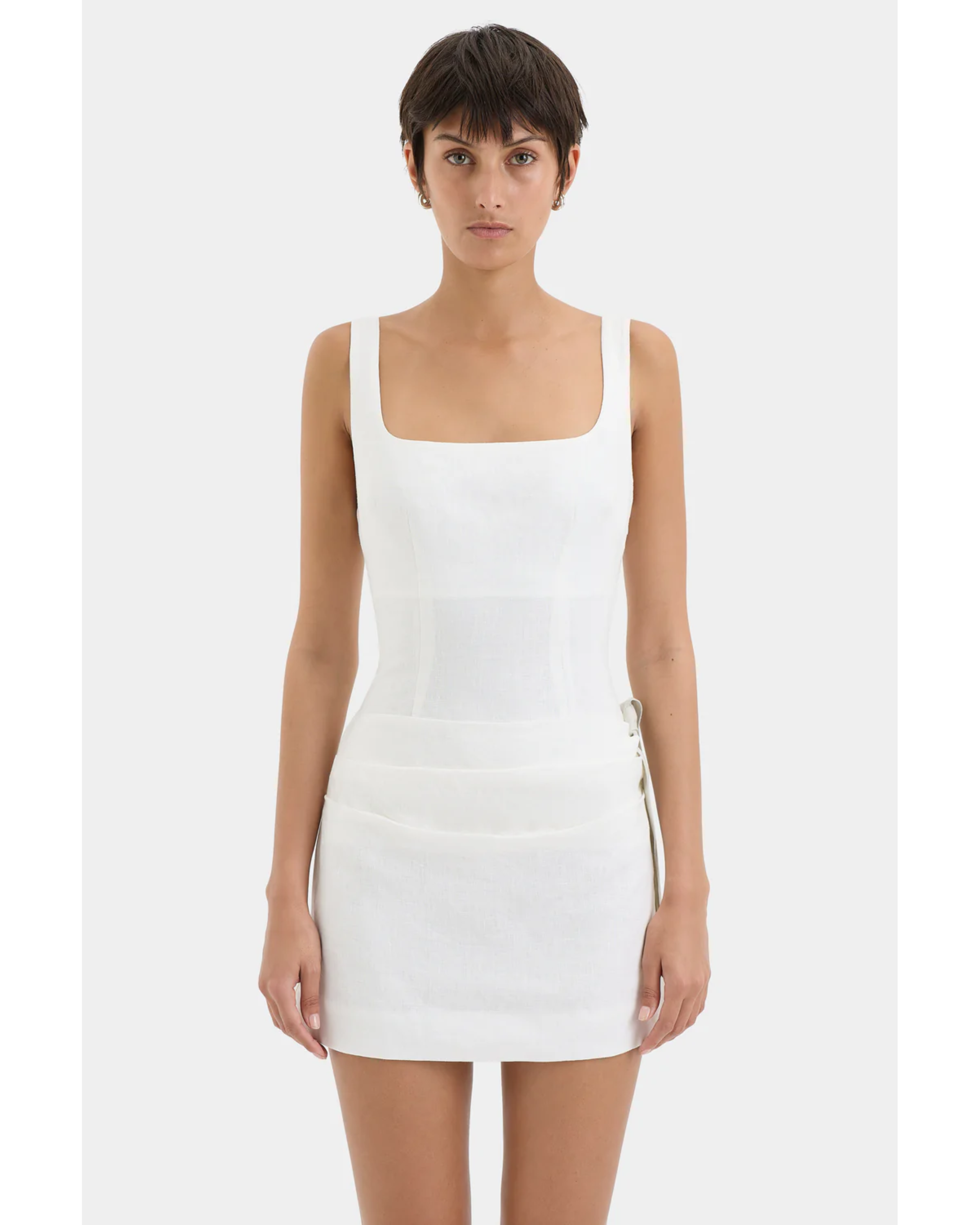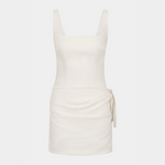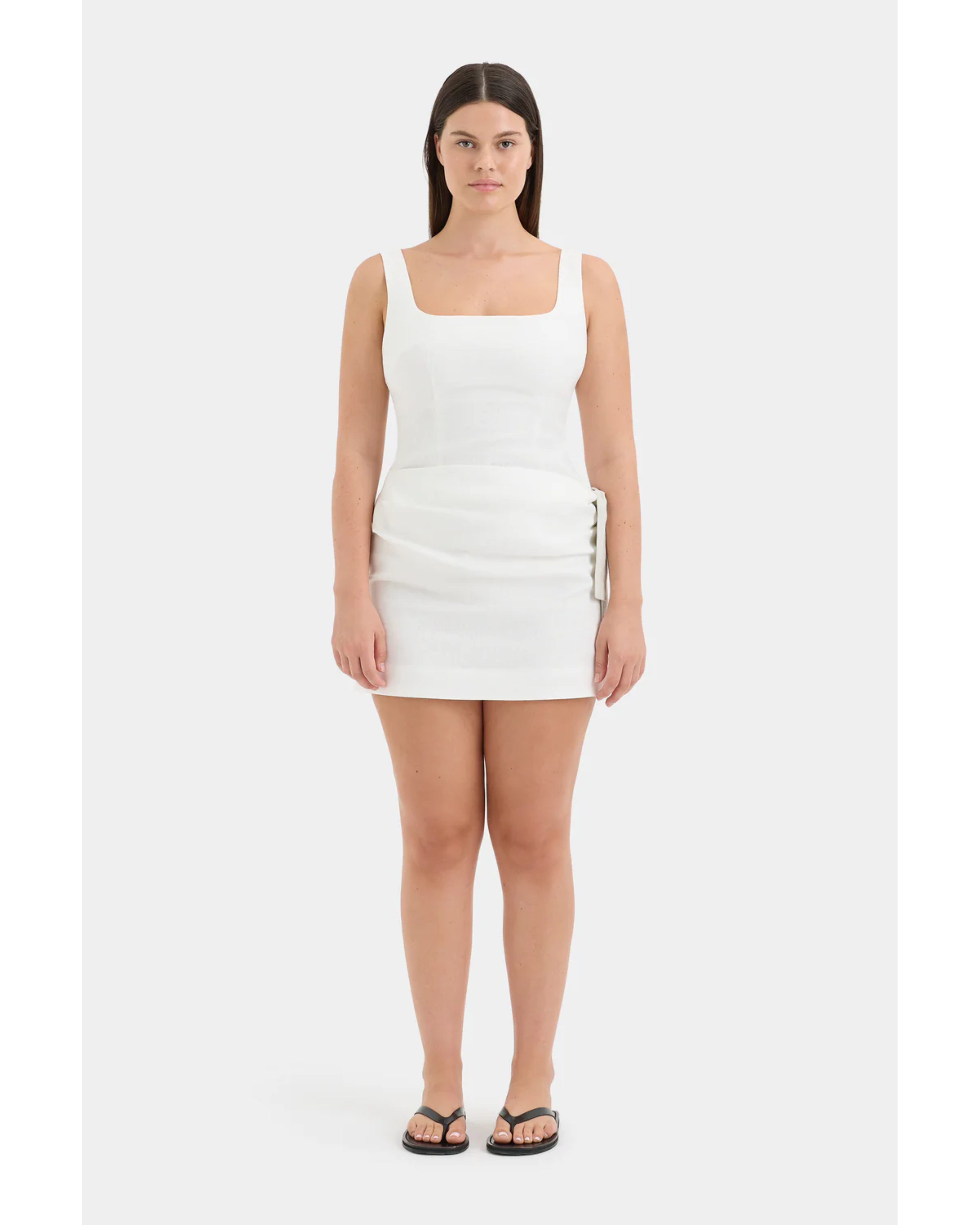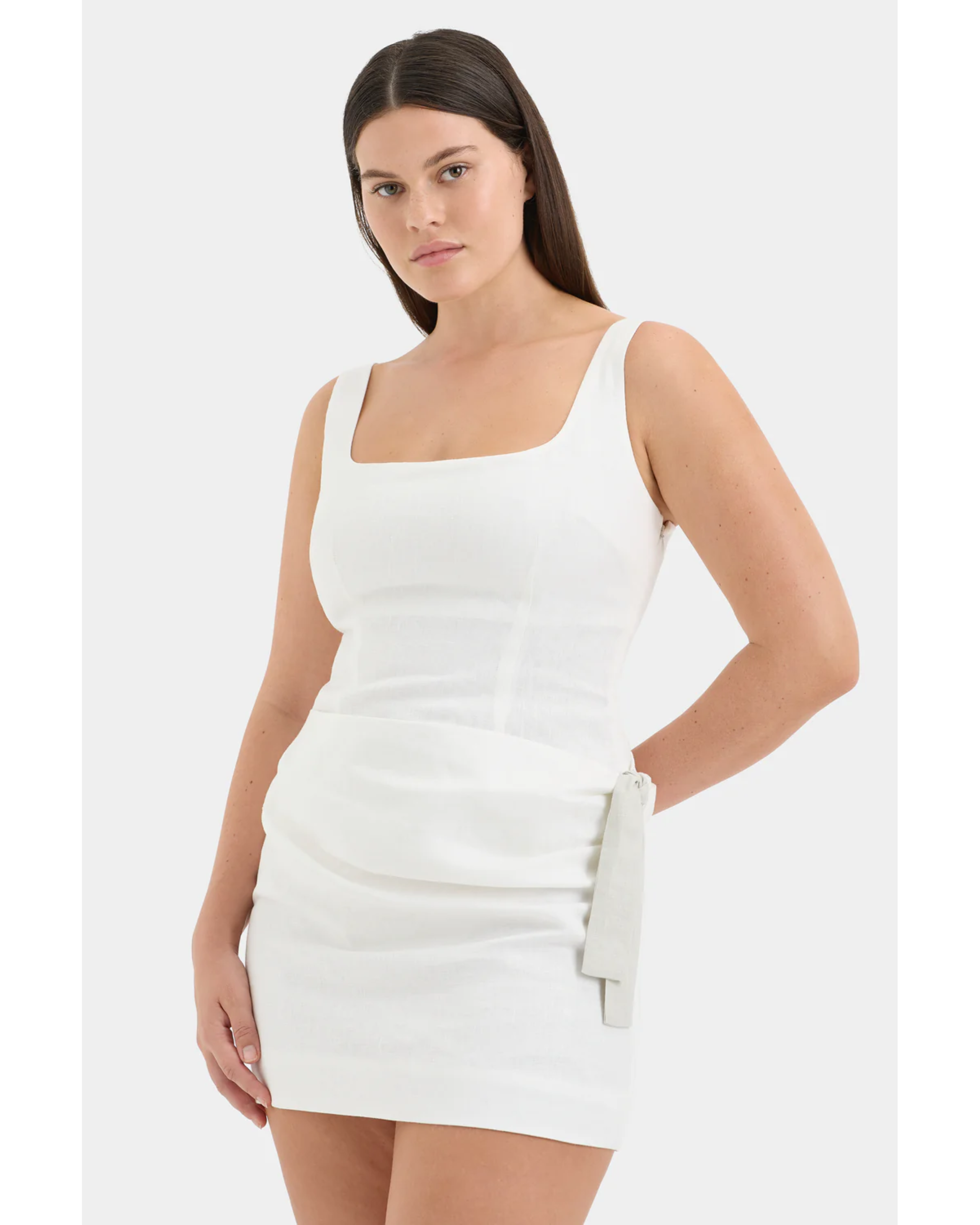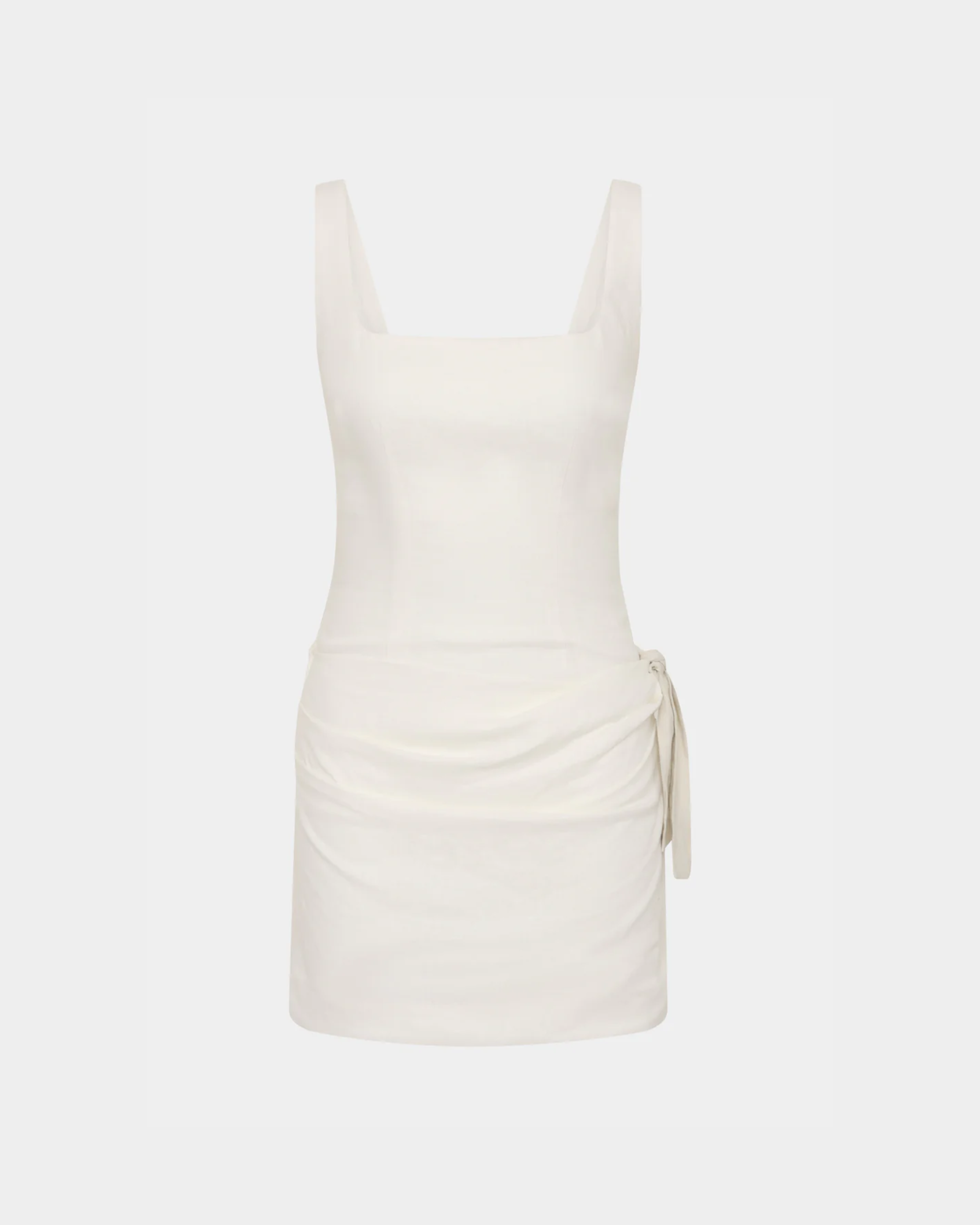 The Jessamine Tie Mini Dress in Ivory is a feminine silhouette, crafted from our signature midweight linen fabrication. It features a square neckline, tucks through the hips for a layered effect and contrast grey ties at the side.