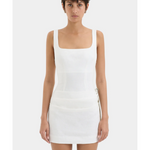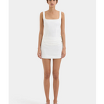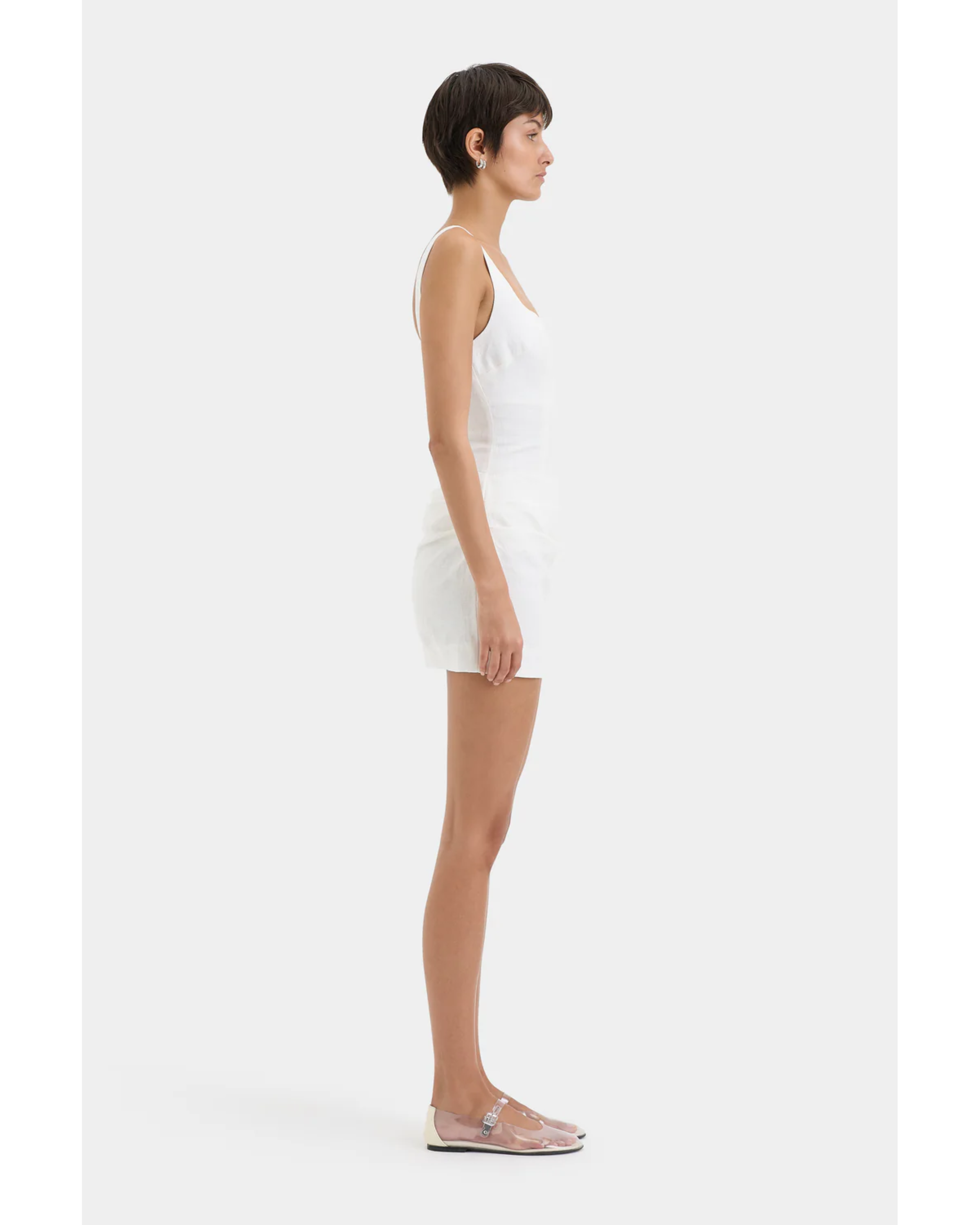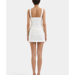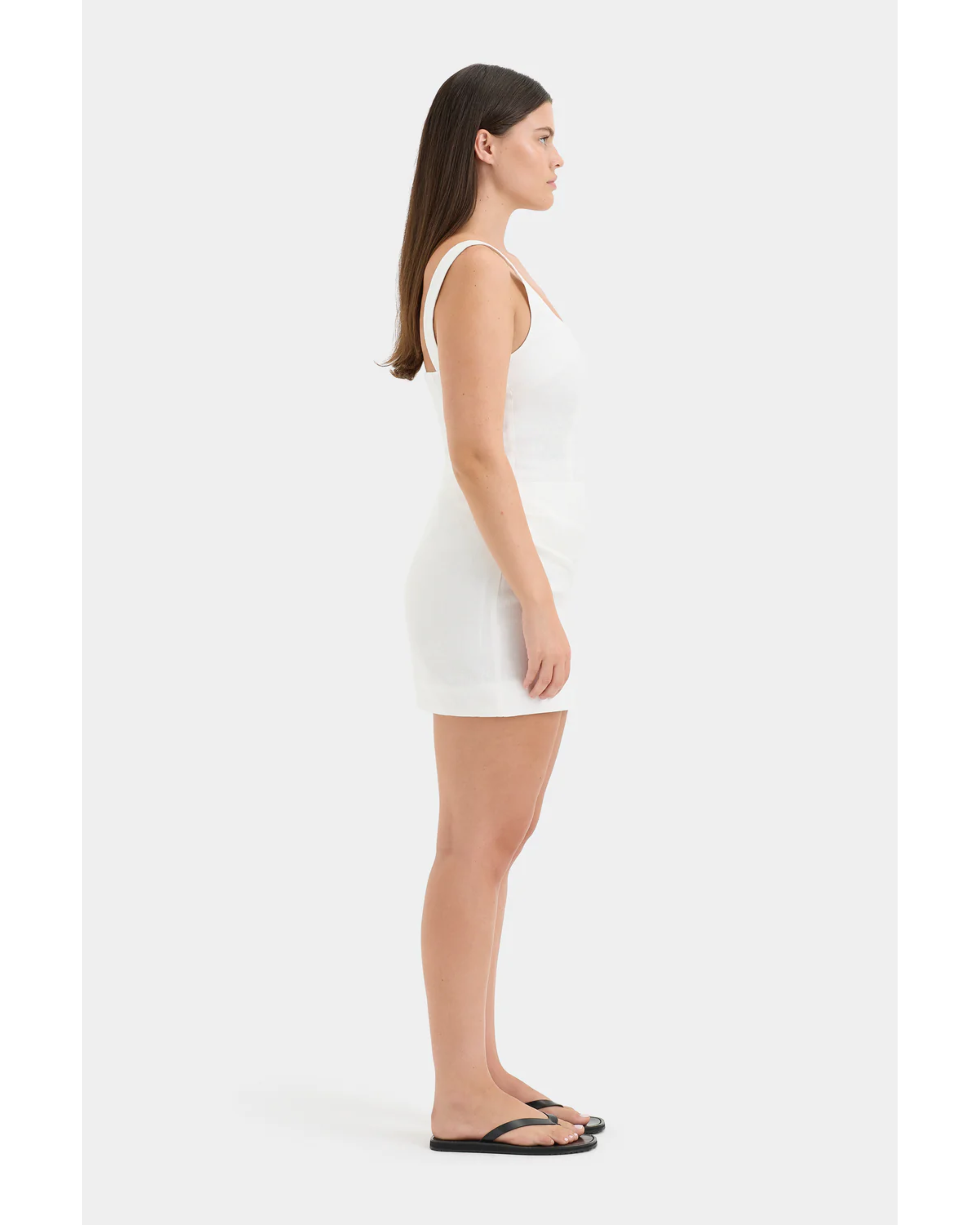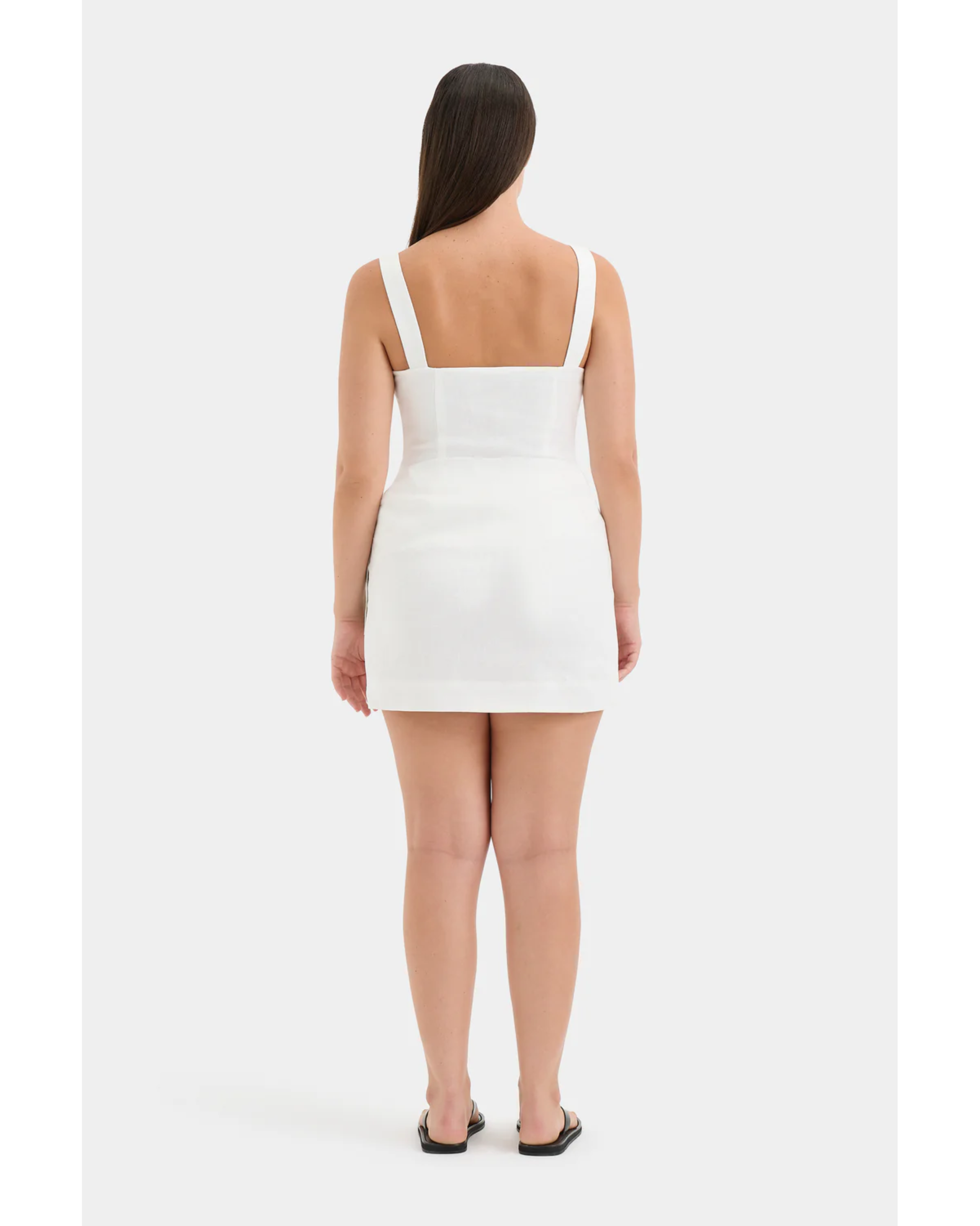 The Jessamine Tie Mini Dress in Ivory is a feminine silhouette, crafted from our signature midweight linen fabrication. It features a square neckline, tucks through the hips for a layered effect and contrast grey ties at the side.