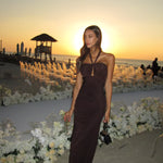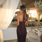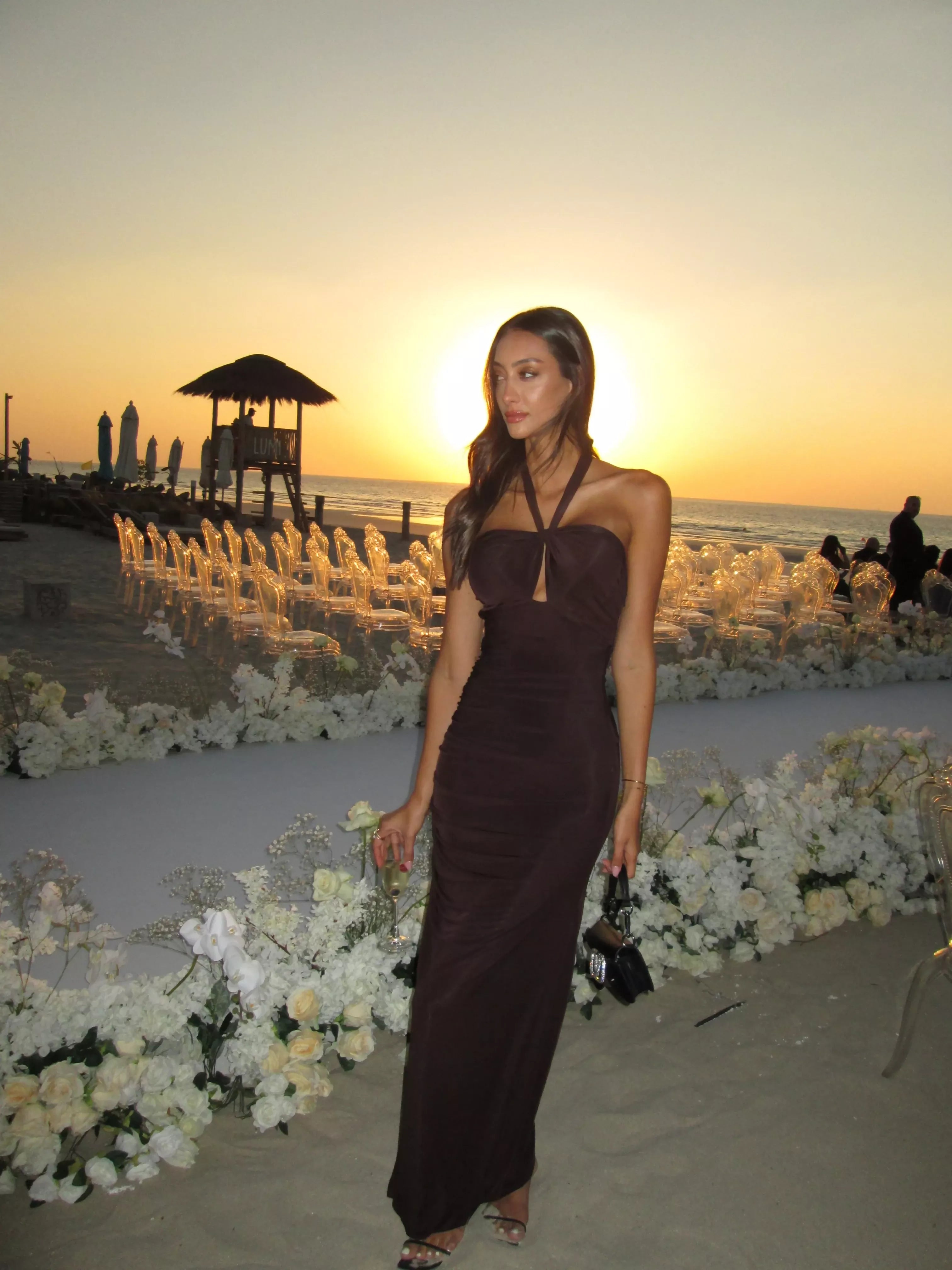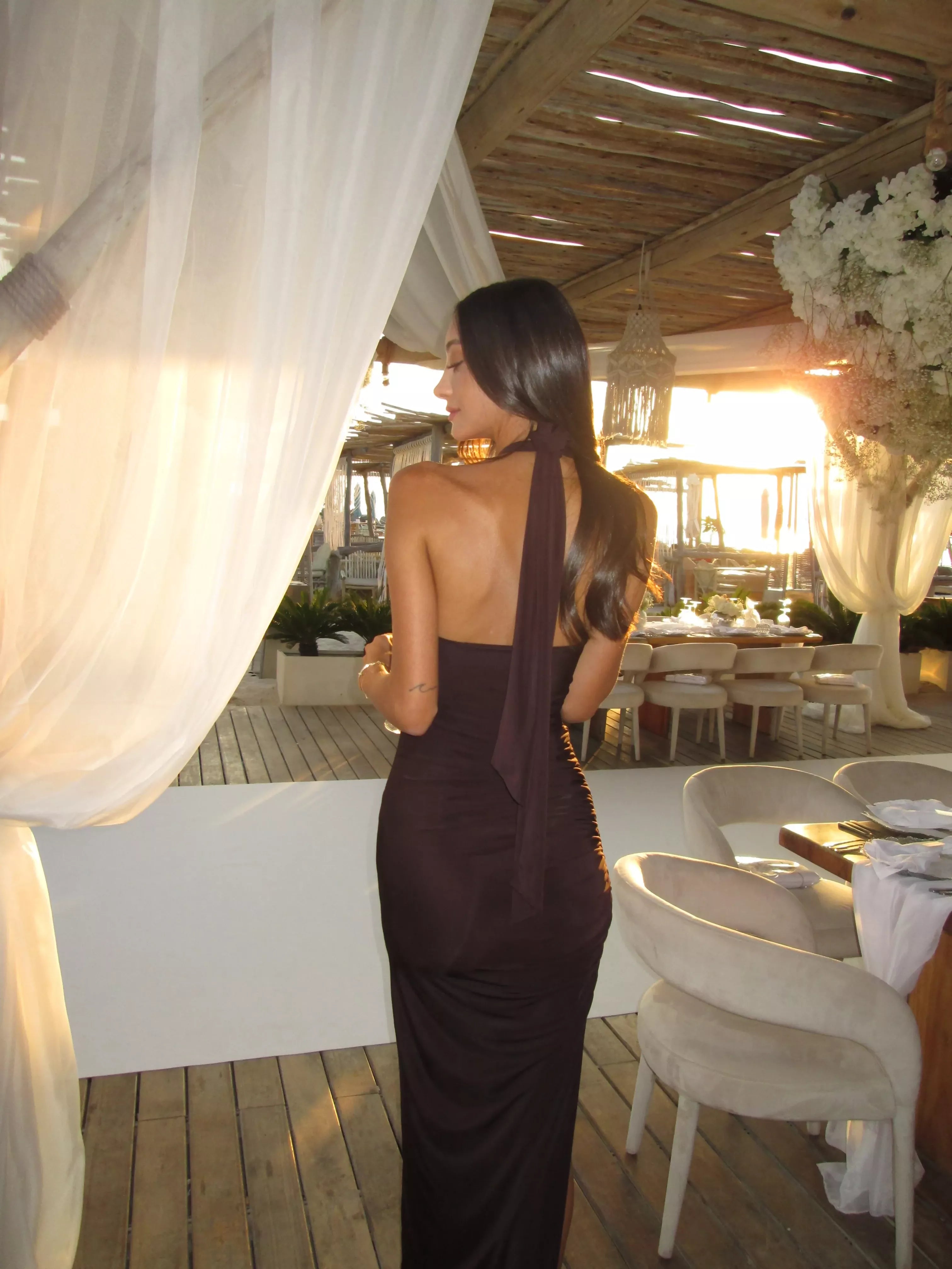 Designed and made in Dubai, the Nora Maxi Dress is crafted from luxurious stretch jersey to flatter every curve. Featuring delicate hand-sewn ruching, an adjustable tie-neck, side split, and floor-length silhouette, this double-lined gown combines elegance with comfort. Perfect for a special evening or event, style it with gold jewelry and strappy heels for a refined finish.