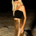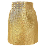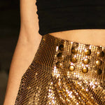 - High-waisted chainmail wrap-style skirt, handwoven from recycled aluminum.