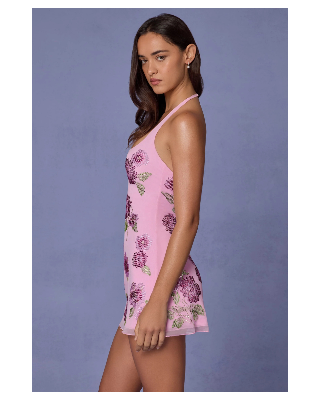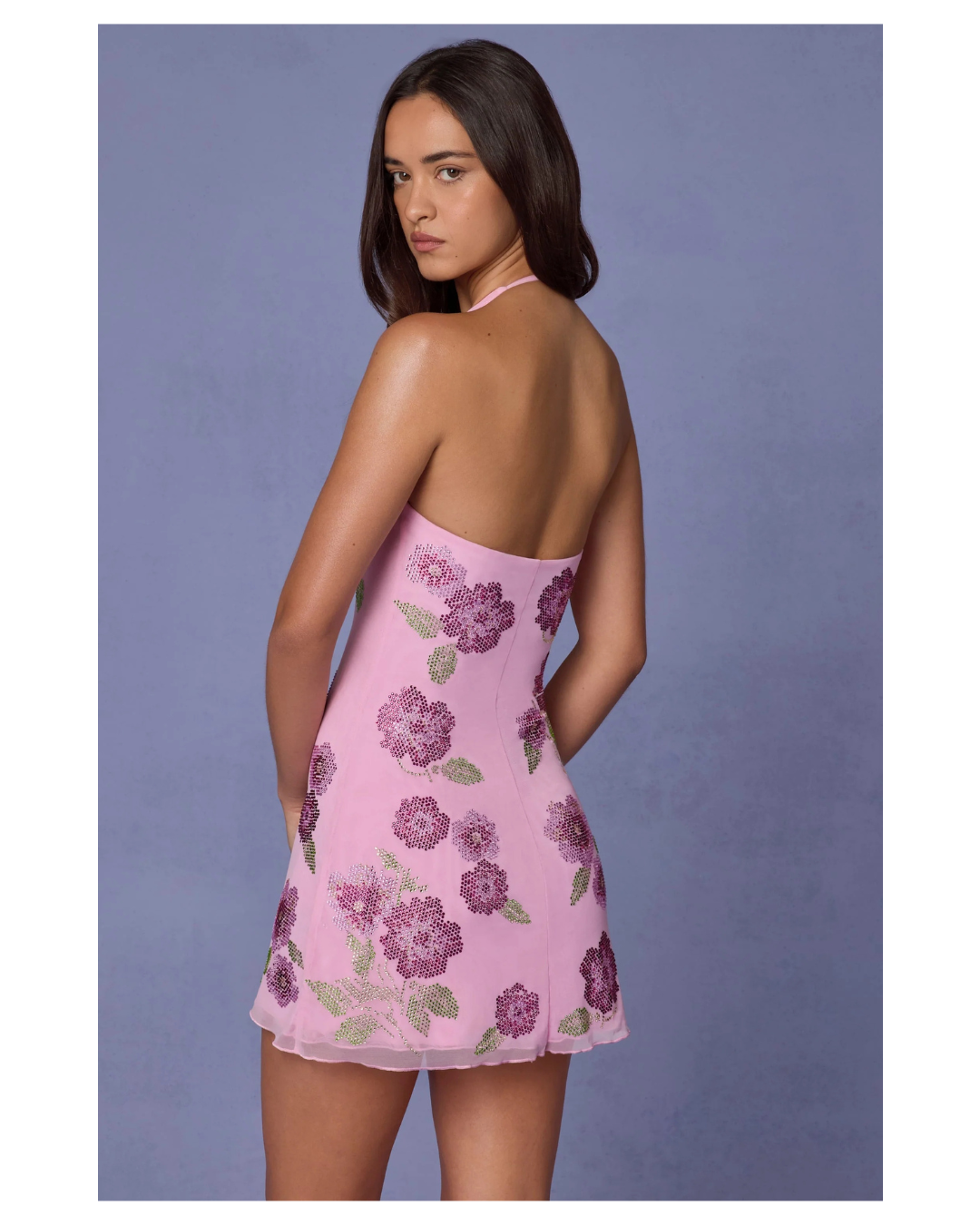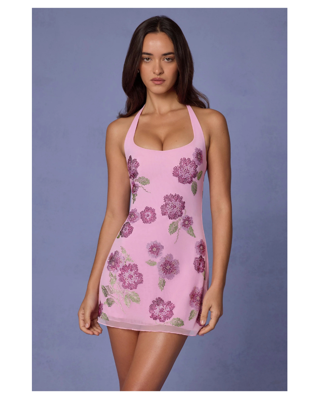 Built to turn heads when it counts, our Galene mini dress is all about making a statement. Crafted from premium mesh with all-over floral HOTFIX embellishments that shimmer with every step, this halterneck design turns to reveal a striking low open back. Bold yet refined, it’s your go-to for nights that demand attention.