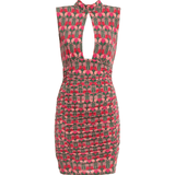 Short,sleeveless dress in stretch viscose jersey embellished with liberty-inspired floral print.Slim-fitting garment with small stand-up collar,keyhole opening on the front and back,and small buttons on the back of the collar.Mini skirt with gathering.