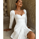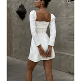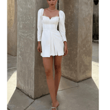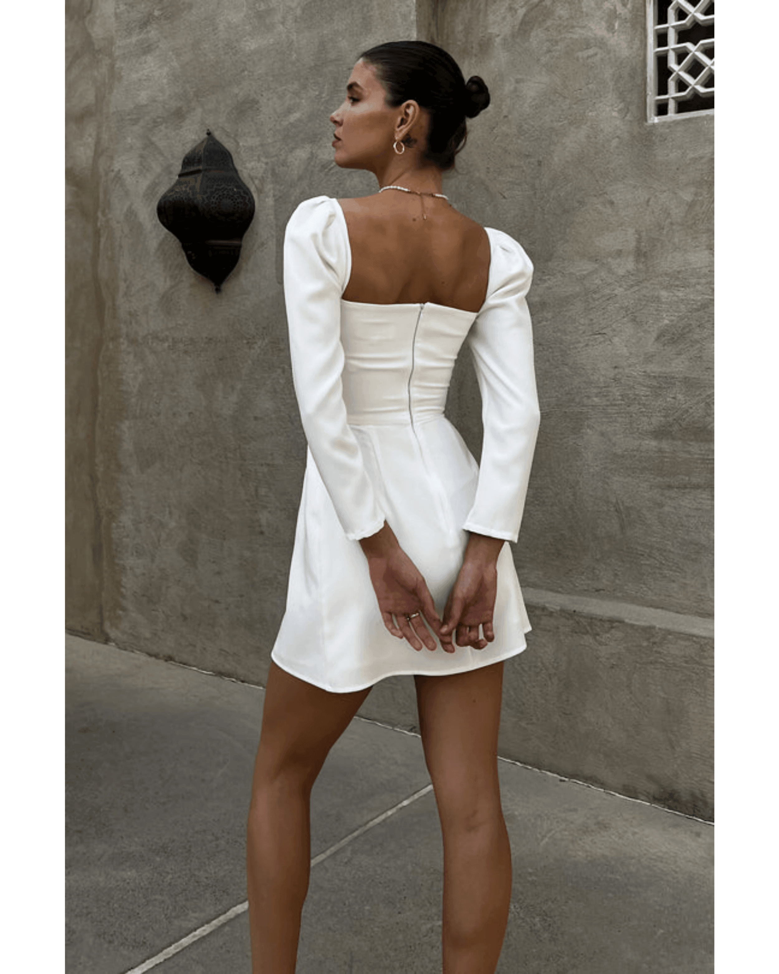 Be playful and joyful in our long sleeve mini dress in milky color. A V-shaped neckline accentuates our curves and gives more femininity to the look, and visually elongates the neckline. The fitted silhouette will perfectly emphasize your body lines. The slit in the front and loose skirt will add some playfulness.
