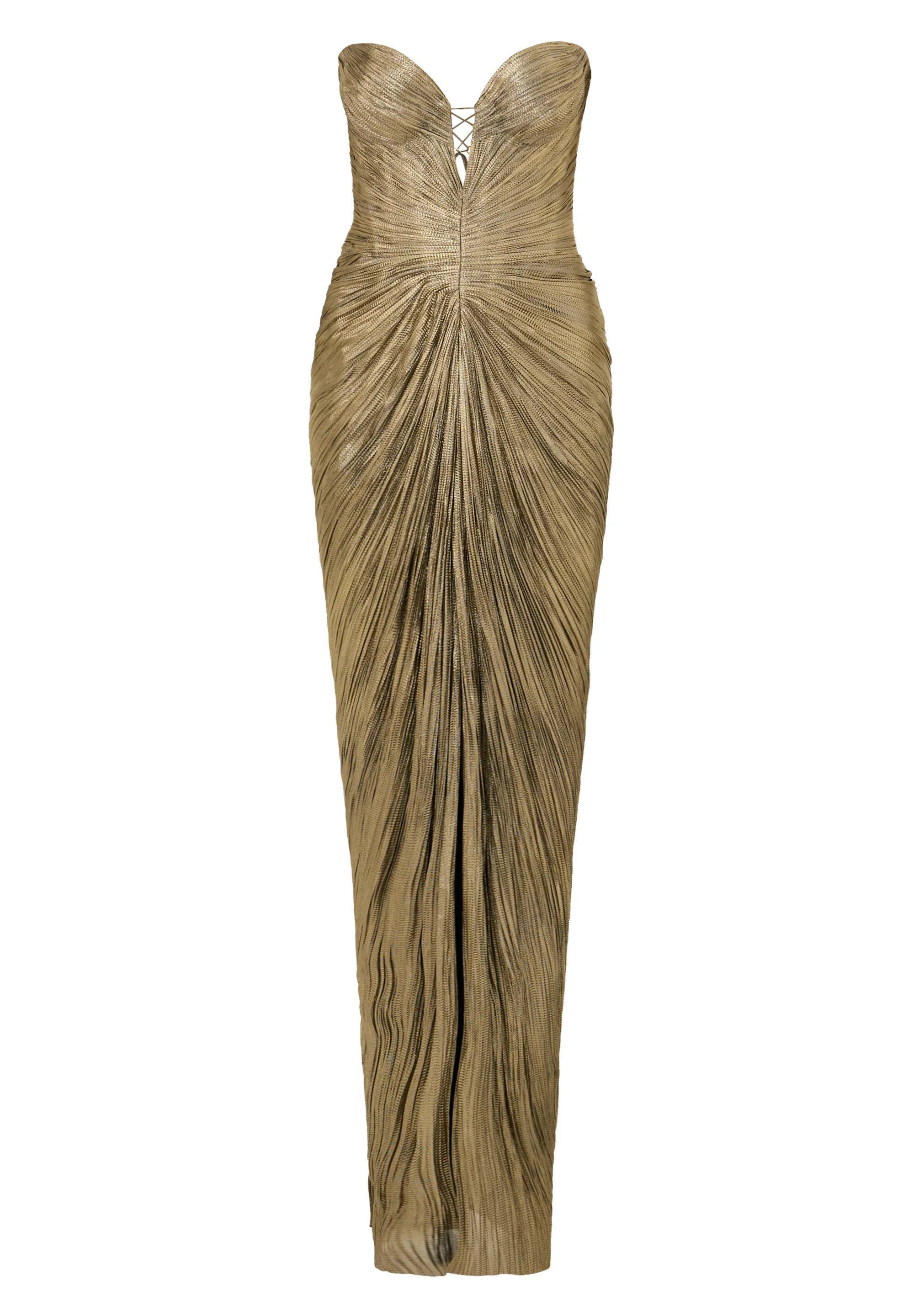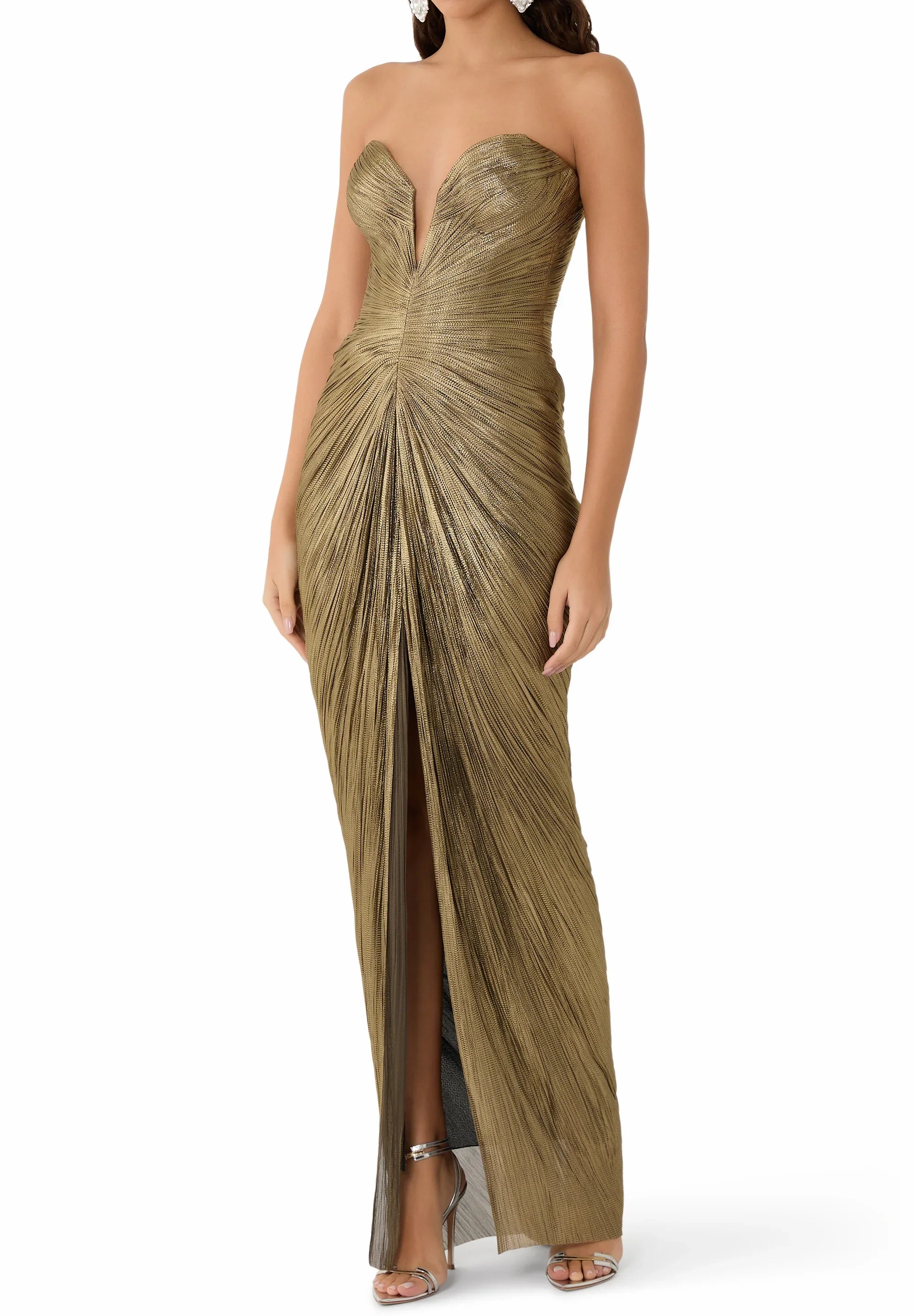This item is listed as available to rent so it may be pre-loved. This Maria Lucia Hohan Alessandra Gown isn't just in perfect conditionit's a magnet for admiration. Every golden silk fold gleams like it was made for you, every seam and stitch flawless, ready to hug your body and command every gaze in the room. The structured bustier and sculpted silhouette ensure you move with confidence, while the thigh-high slit adds a whisper of daring elegance. No signs of wear. No imperfections. Only pure, runway-ready glamour. Slip into this gown, and watch as heads turn, eyes linger, and admiration follows your every step. Renting this gown is not just an outfit choiceit's your ticket to being unforgettable, adored, and utterly luminous.