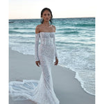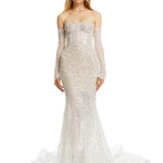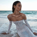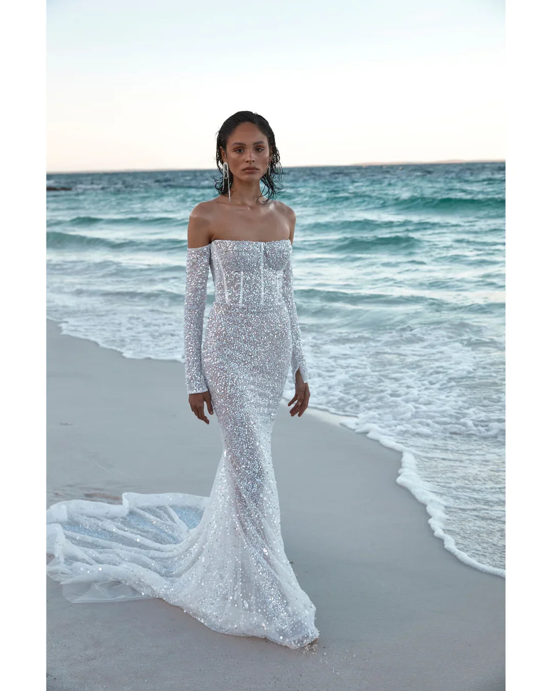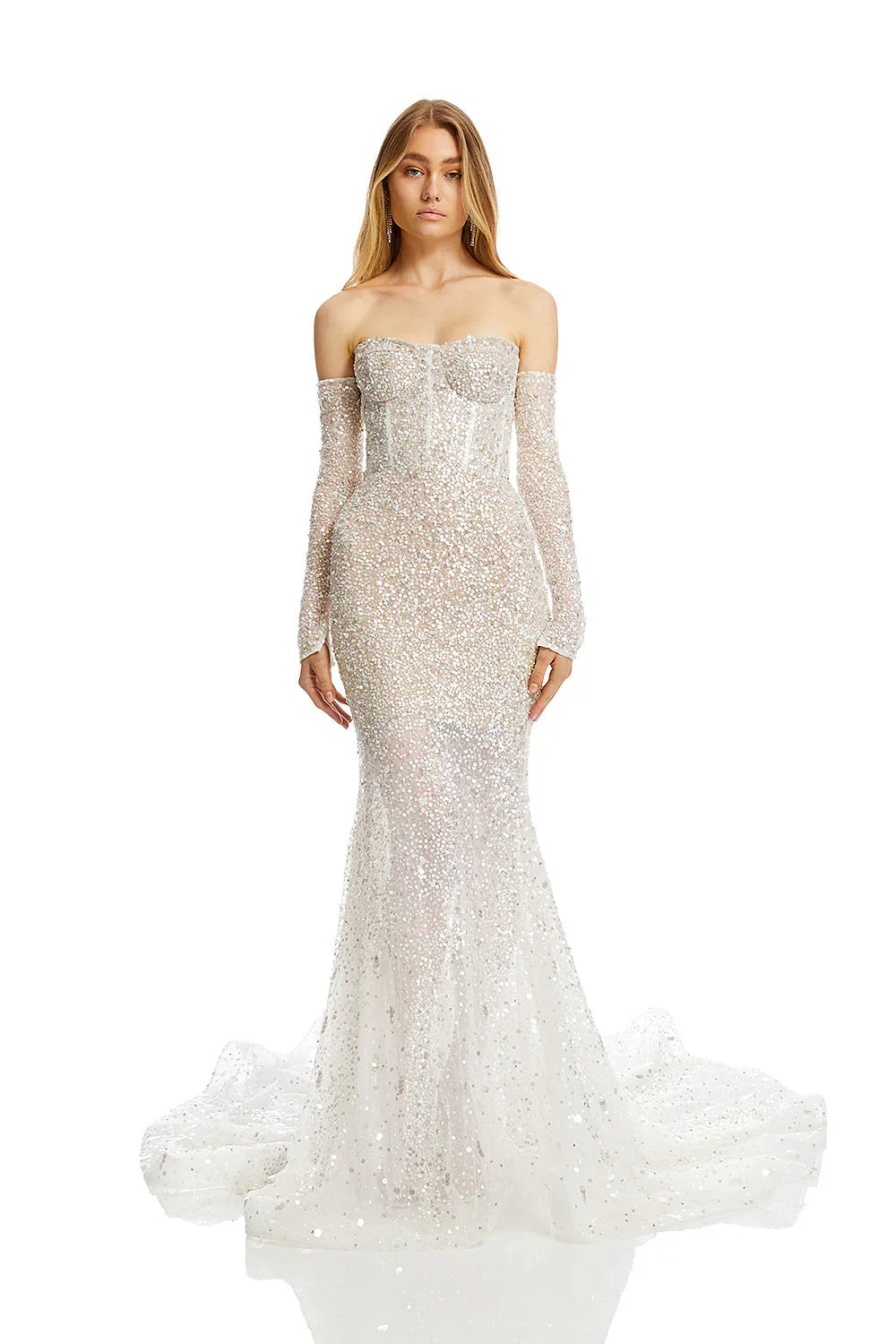 Elegance meets high octane glamour in the Alina. Crafted in Chosen by KYHA's exclusive new beading, Alina features a cupped, structured bodice, detachable off shoulder sleeves and a show stopping fit and flare skirt.