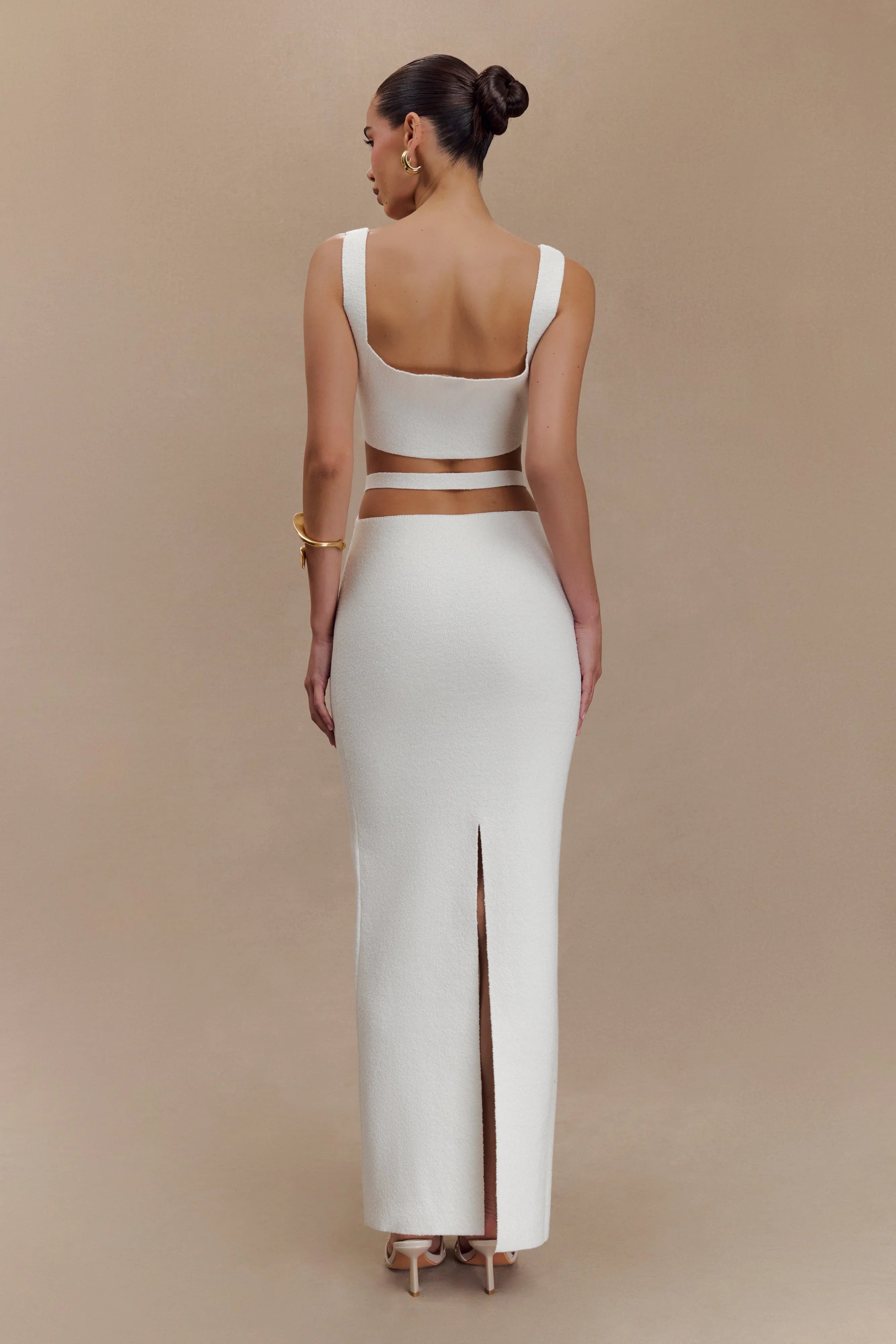 Introducing the ALYSANNE Cut Out Knit Maxi Dress, a stunning blend of elegance and modern design. This dress features a striking square neckline that beautifully frames the collarbone, while the back cutout adds a bold yet sophisticated detail. A secure back waist strap enhances your silhouette, complemented by a charming button detail at the waist that elevates the overall look. The centre back leg split introduces a hint of allure, while the straight skirt shape maintains a timeless appeal. Unlined for a lightweight feel, this dress is versatile enough for any occasion, from daytime events to evening gatherings.