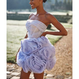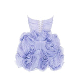Lavender mini dress, made from lustrous organza, it's appliqued with oversized organza roses on the skirt. Features a semi-transparent bodice decorated with tulle fabric on the neckline and lace-up closure.