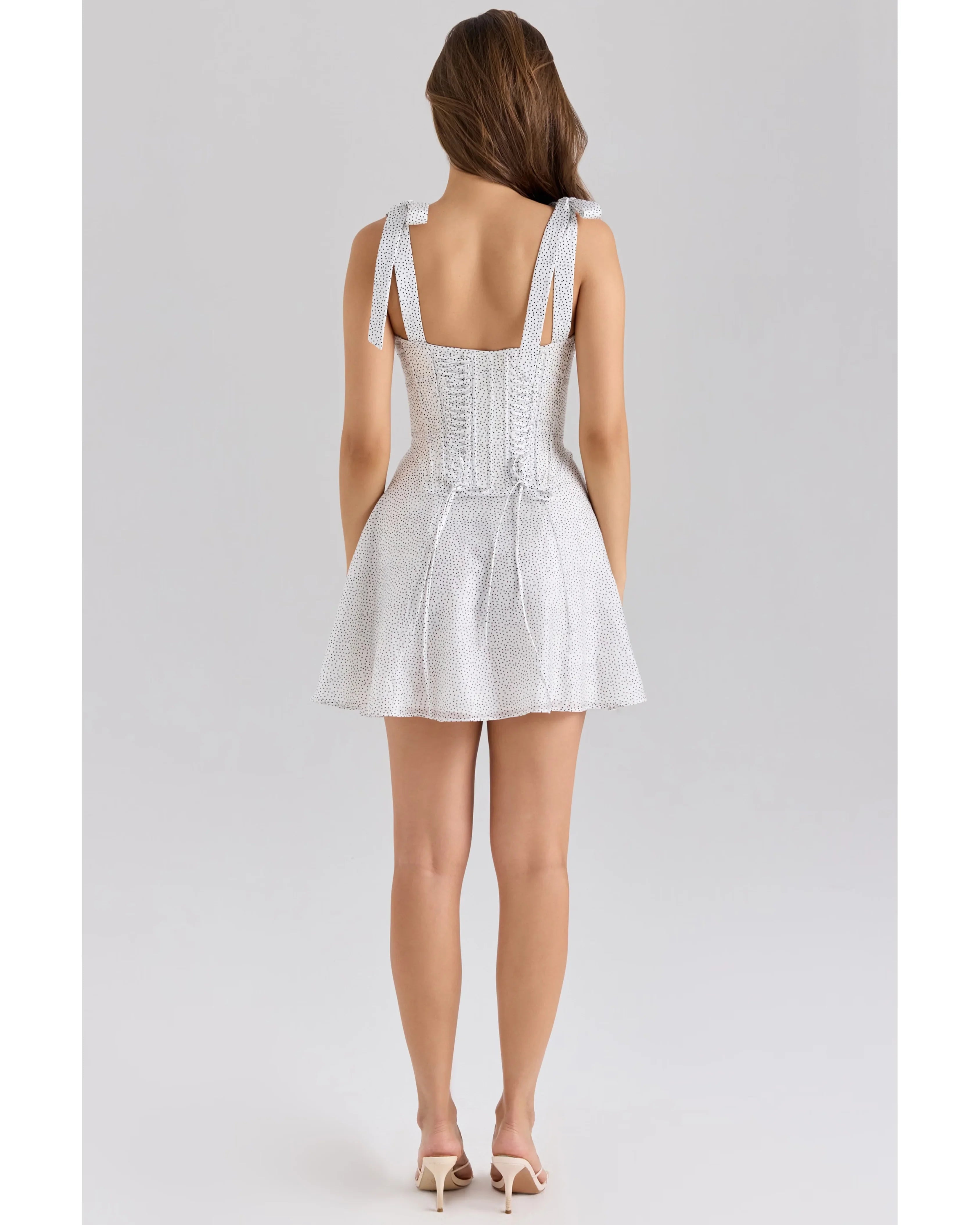For soft structuring that goes with the flow, we just love 'Ariella', the cutest mini dress with the most adorable details. Made from floaty chiffon with an all over dotty print, 'Ariella' is cut to a mini silhouette with an underwired bust and slim-fitting corseted waist that laces up at the back. The straps can be adjusted with bow ties, and we've added a side zip for easy on. And to complete the silhouette? The skirt skims over the hips for a floaty finish. We love the 'Ariella' for its soft and sweet finish that works for any spring occasion.