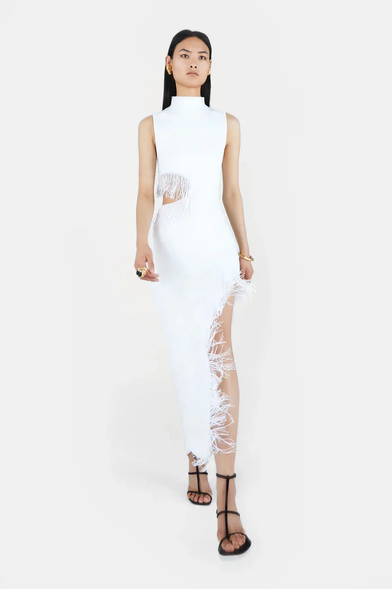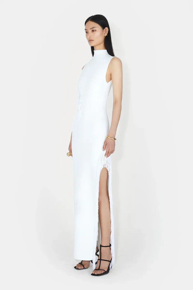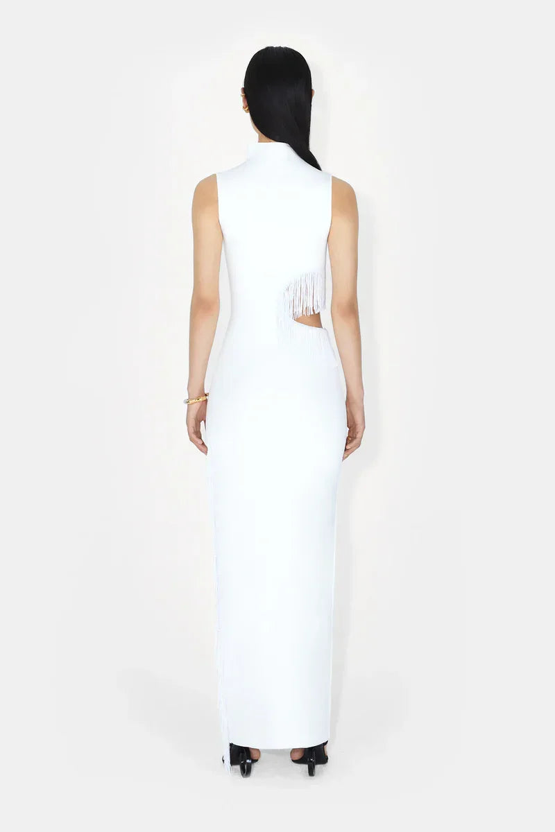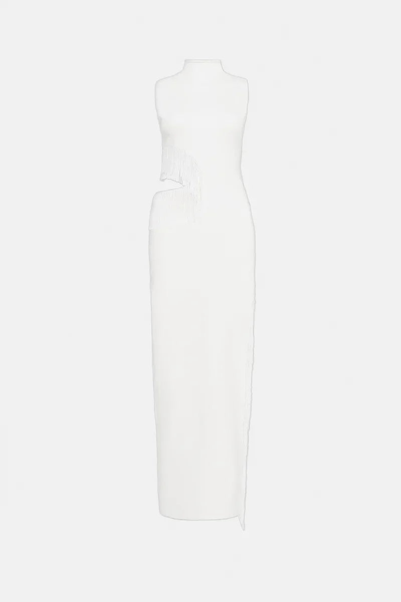 The Beaded Nova dress is primed for special occasions. It has an asymmetric midriff cutout and fun high side slit, decorated with tonal beadwork and spirited fringing.