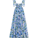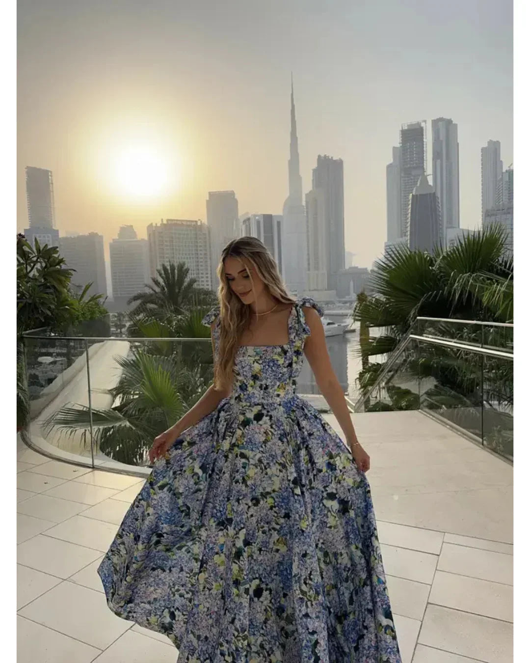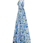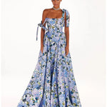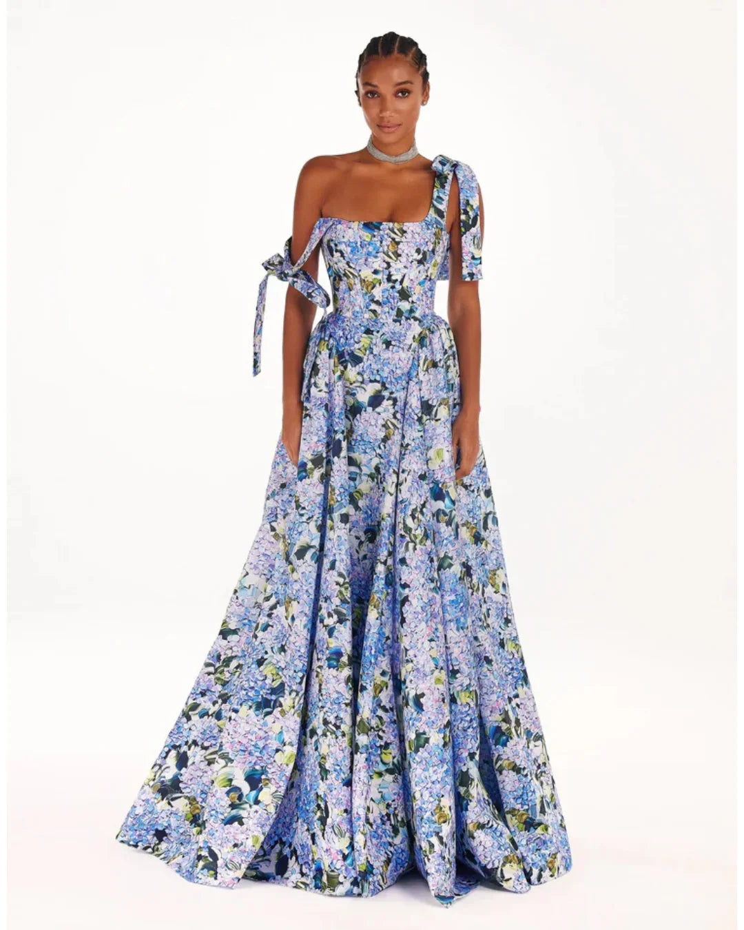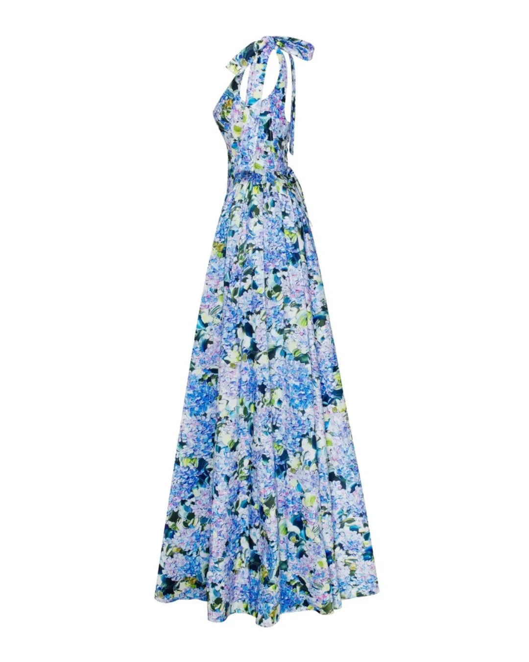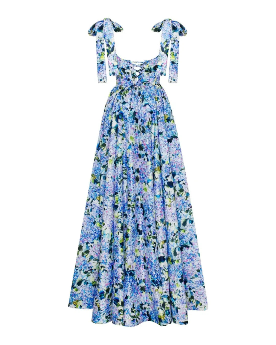 Blue Hydrangea tender tie-strap maxi dress is made of taffeta. Featuring a maxi full skirt, fitted bodice with bow straps, and lace-up closure. The gown is created in a blue floral print.