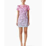 Step into elegance with the Elle Mini Dress, a dreamy fusion of soft pink, purple, and blue hues in an enchanting ombre design. This mini shift dress is crafted from exclusive 3D floral lace fabrication, creating a delicate yet striking aesthetic. The boat neckline enhances its refined silhouette, while the short sleeves, adorned with intricate floral trims, add a touch of romantic charm.