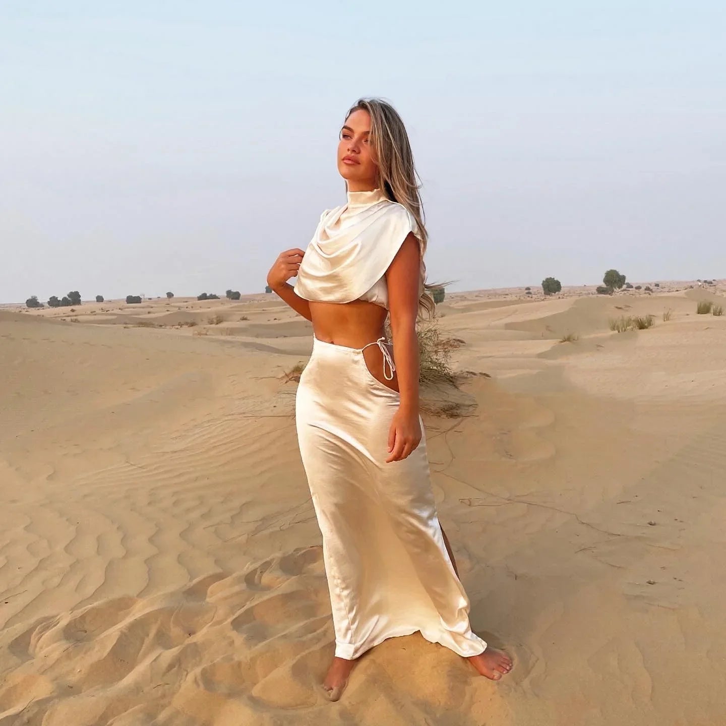 The co-ord of dreams! 'FAYE' our satin two-piece and an adjustable tie-up at the waist skirt, cut-out hips and an added thigh-to-floor leg slit. This skirt comes paired with a shoulder-to-shoulder drape, high-neck and cropped blouse.