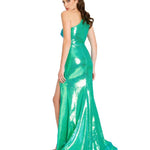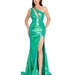 Turn heads in this one-shoulder gown featuring sheer mesh and sequin fabric. The one-shoulder design and shimmering sequins create a captivating look, while the sheer mesh adds a touch of allure and elegance, perfect for a standout appearance at any event.