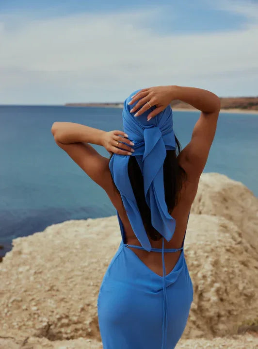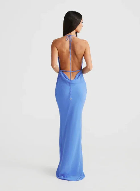 The Lopez dress is a MELANI The Label design made from lightweight, ethereal chiffon with a bias cut for a smooth, flattering silhouette. It features a timeless, plunging cowl neckline at the front and a dramatic, open backless design. The fully lined, midi-length dress is designed for a sophisticated and elegant look, capturing a blend of classic allure and modern style, often incorporating features like self-tie strings for the back or adjustable strap.