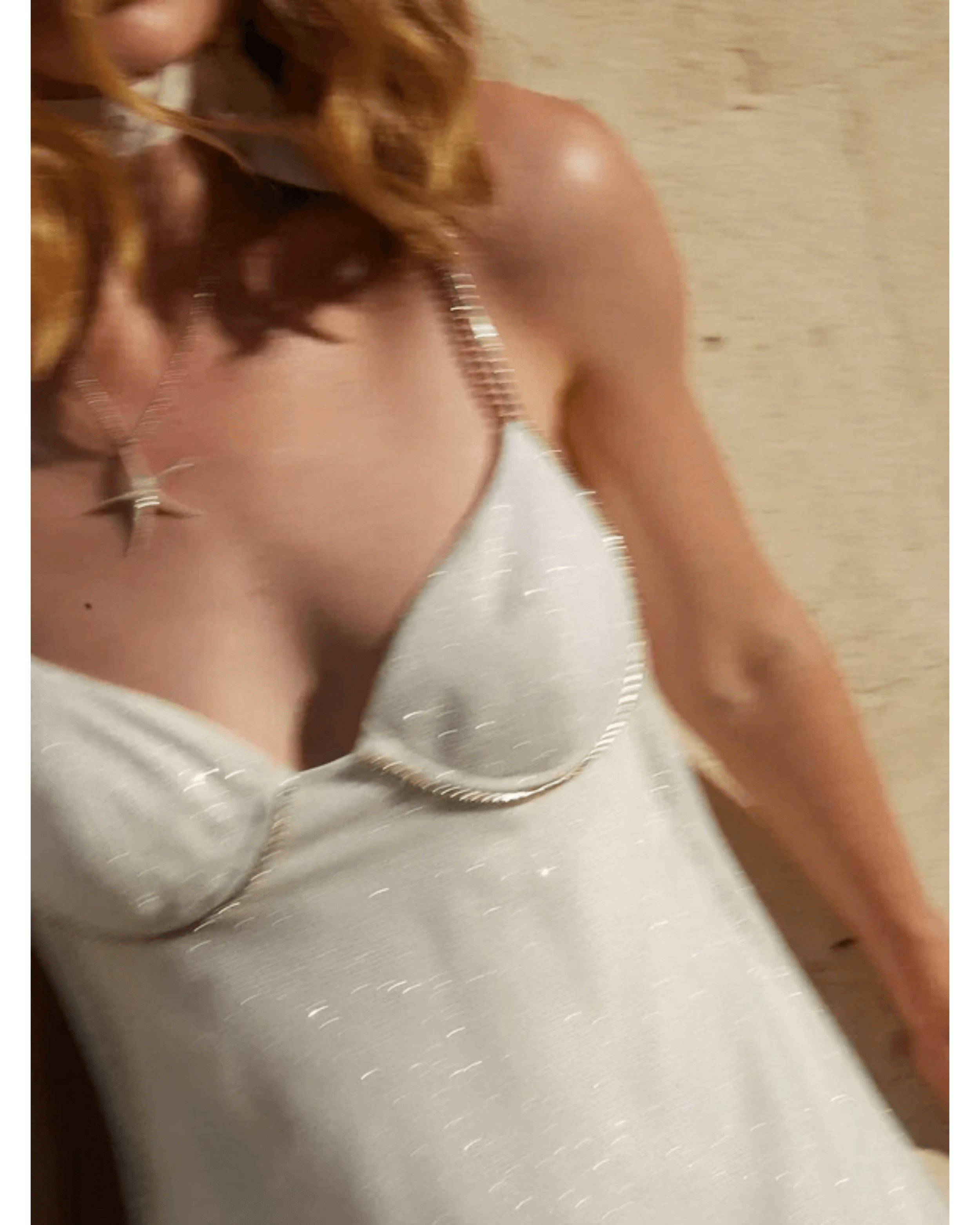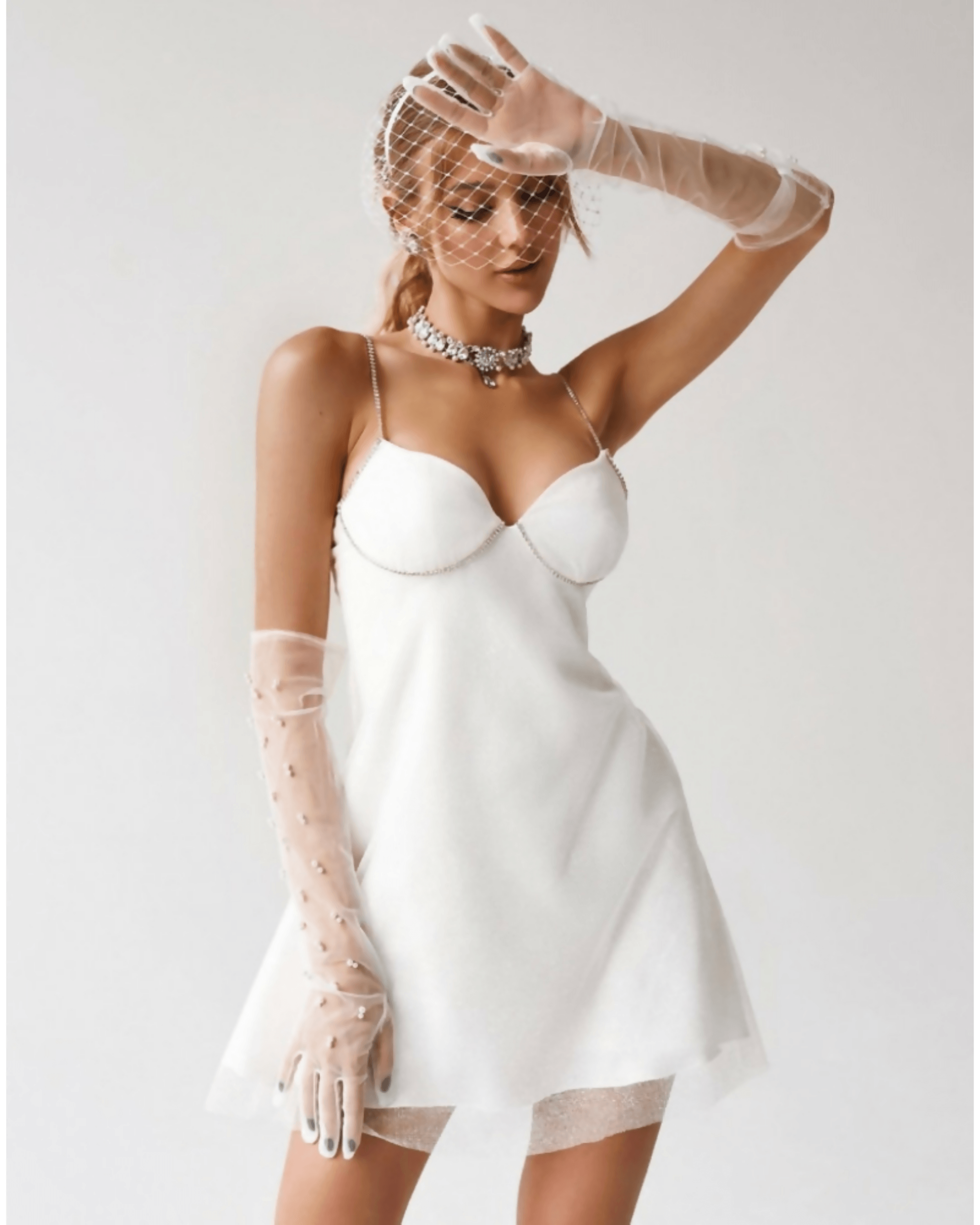 A double-layer dress with delicate cutouts and beaded straps. The inner layer is a silk dress, and the top layer is a glitter tulle.