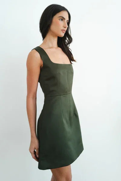 Our Monica Dress, a refined structured mini dress designed to flatter. With its tailored silhouette, it cinches the waist while allowing ease through the hips and thighs. The square neckline and fused bodice create clean lines and gentle shape, balanced by the soft A-line skirt. Crafted from smooth satin, this satin mini dress is fully lined in 100% cotton for lasting comfort and breathability.