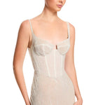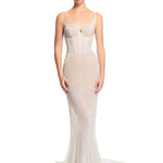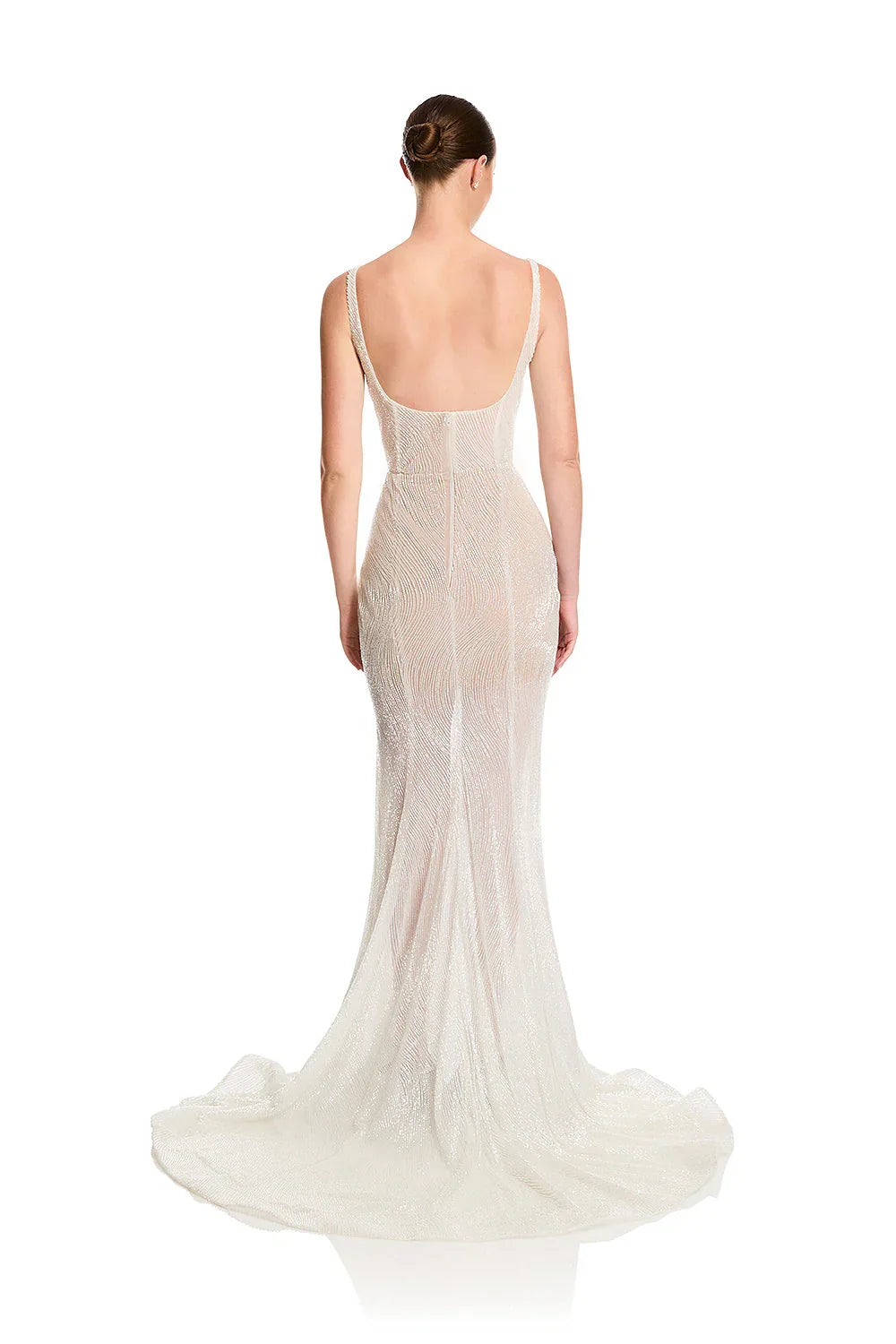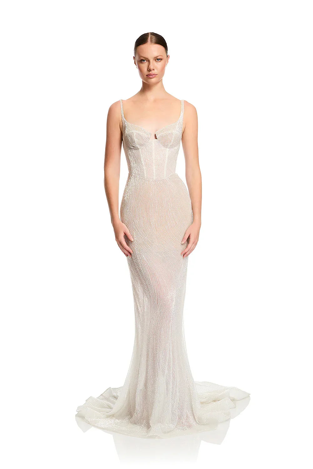 Every hour is golden hour in Nile. Nile shines thanks to its bespoke Chosen by KYHA lineal beading, a structured, corseted bodice with cut away detail and dipped waist. Complete with fit and flare skirt, Nile is a modern icon in the making.