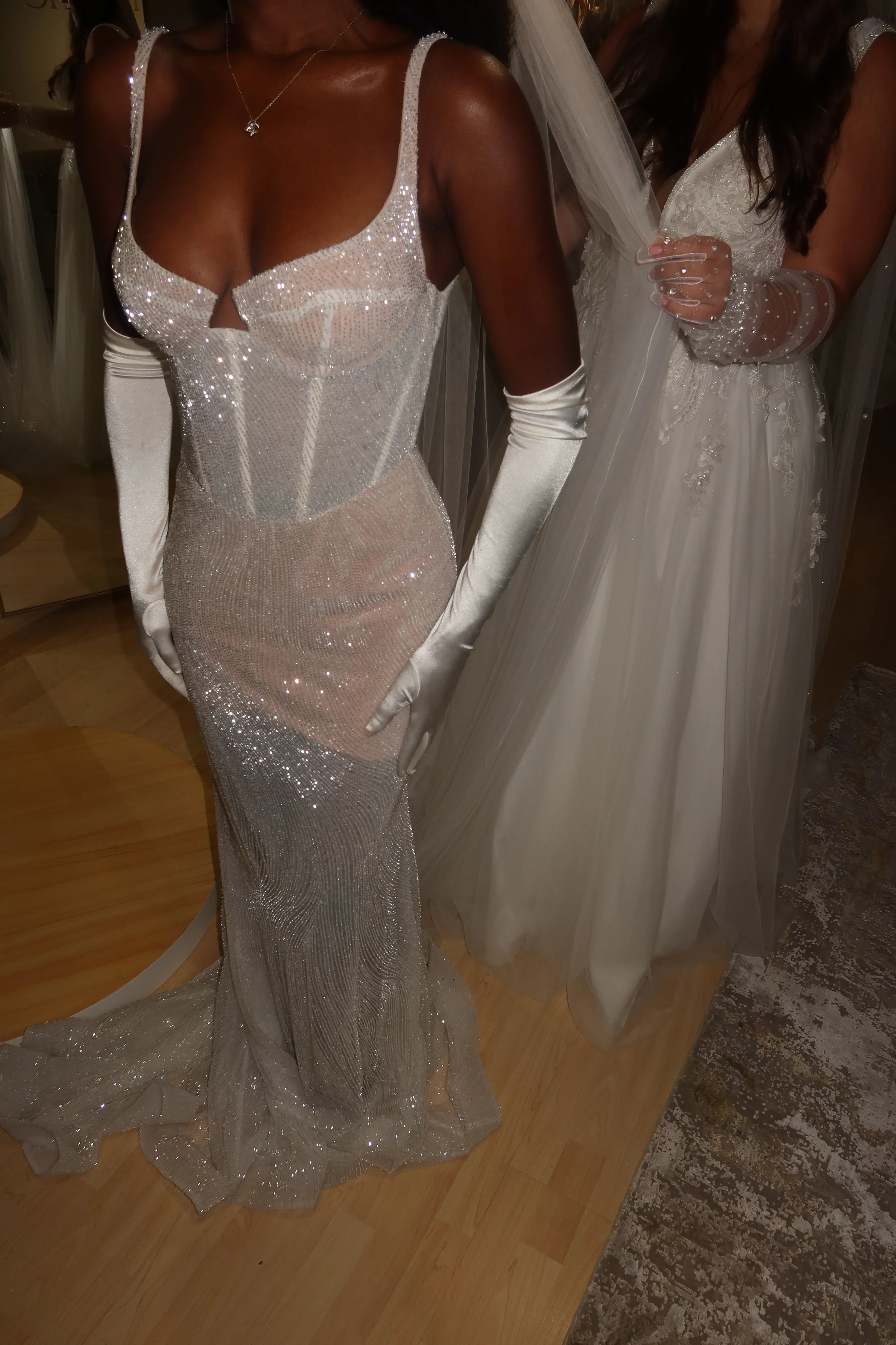 This item can be tried on by appointment only at the Ilume Bridal store in JLT. Please contact Ilume directly to arrange https://www.ilumebridal.ae/contact-us.