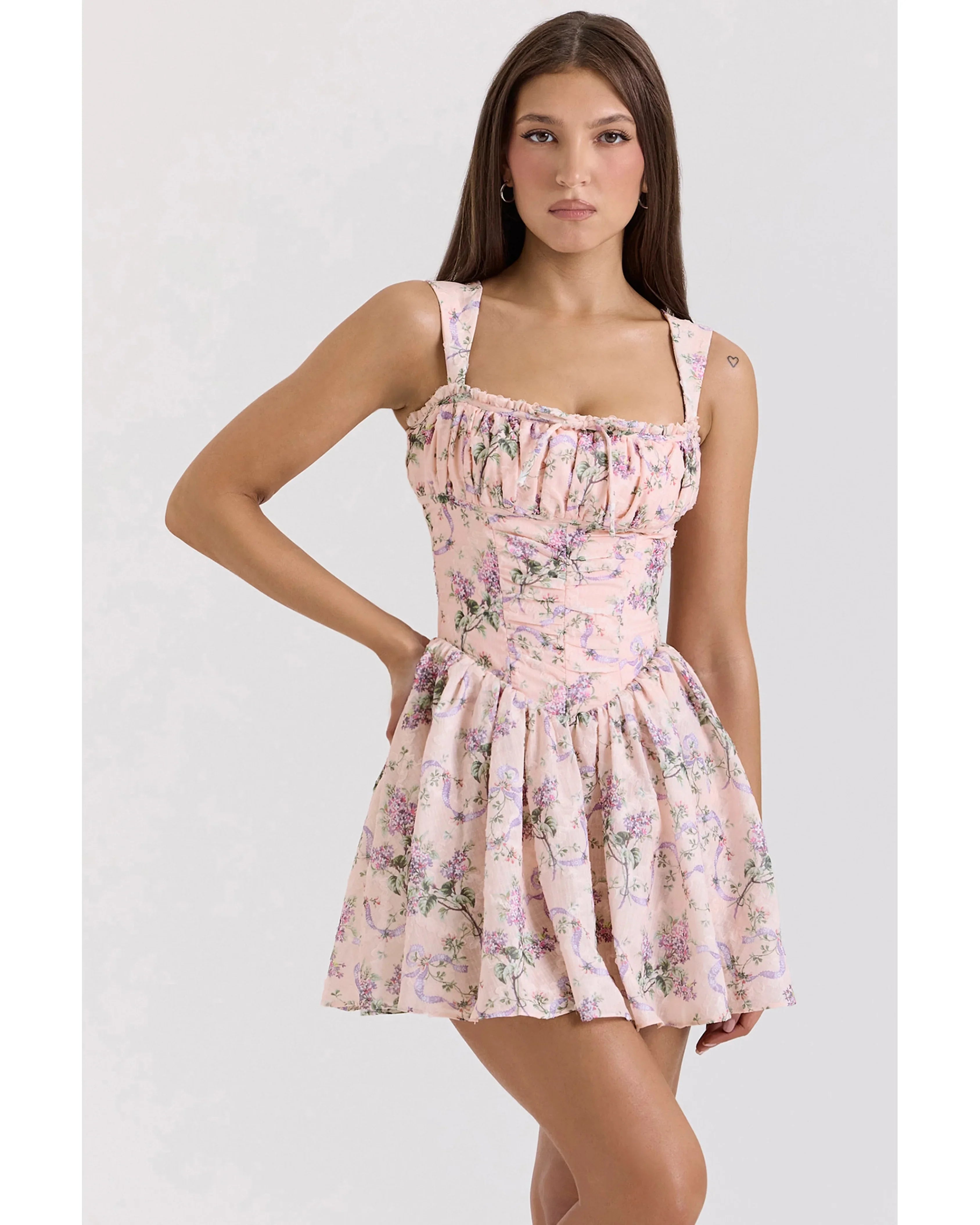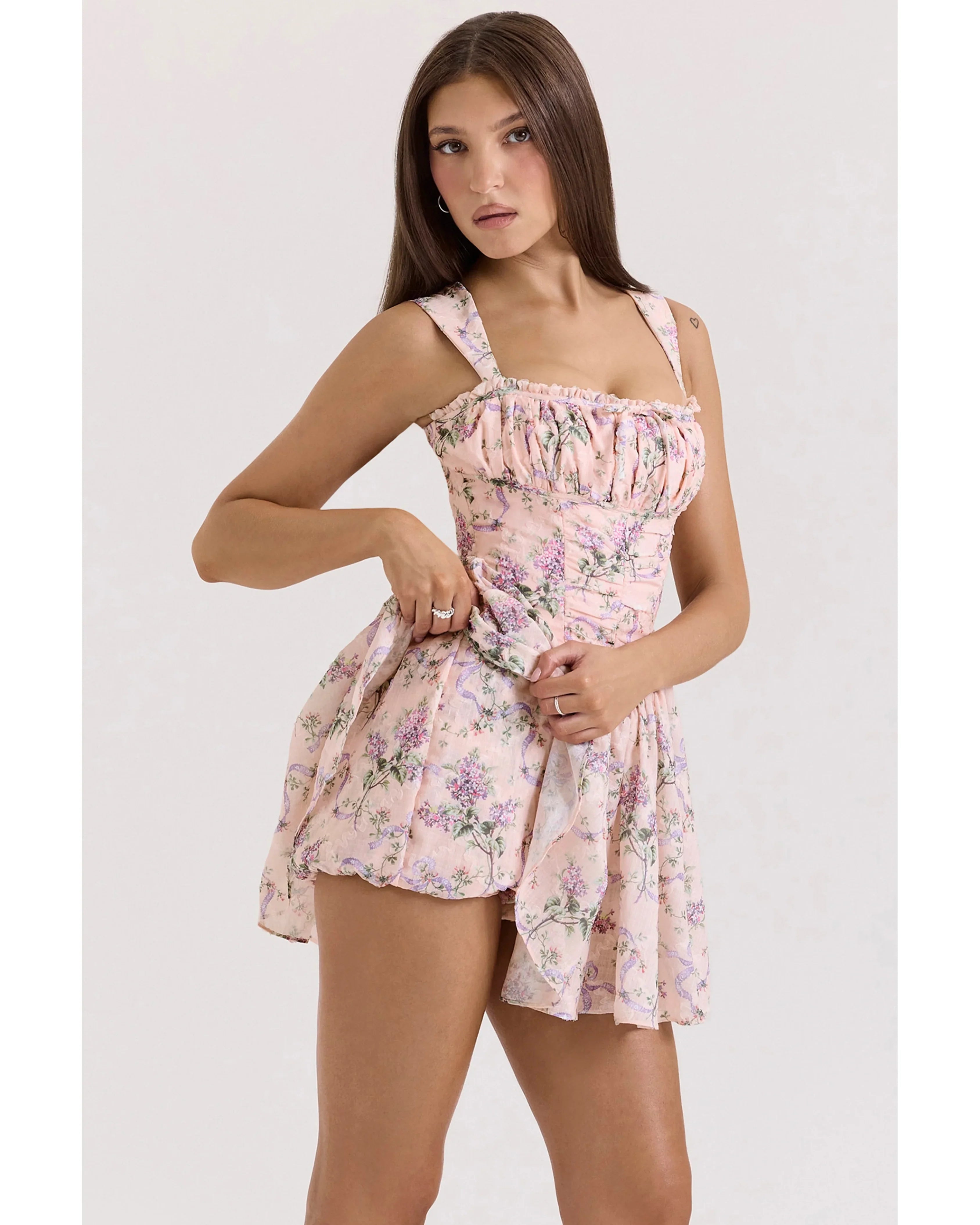 No matter what the dress code, florals are always a good idea. The 'Ophelia' Mini Dress is fun, feminine, and totally flattering. It's crafted from chiffon fabric that's lined for a smooth finish and printed with soft florals. The silhouette takes its cues from our corsetry know-how - the bodice is boned to expertly hug the waistline with an easy zip at the back, while a delicate bow tie finishes the square bustline. Now for the fun part, the voluminous skirt skims over the hips and features built-in but hidden bloomer shorts - they're elasticated around the leg for a comfortable option that still looks dressed up.