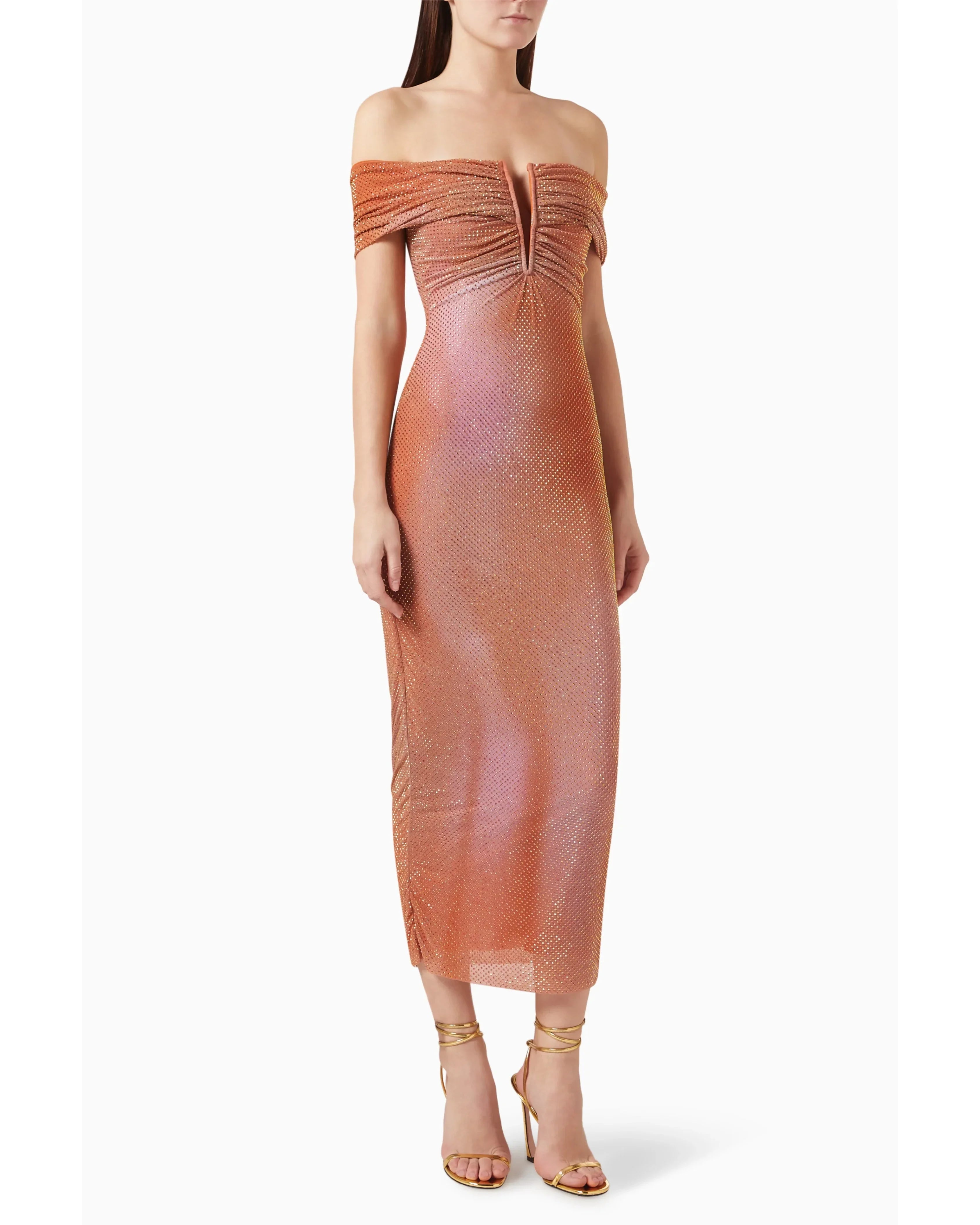 Rhinestones take center stage in Self-Portrait's newest collection, infusing each design with an extra touch of femininity. Combining all-over embellishments with another hallmark of the label, this ethereal mesh maxi dress showcases an off-the-shoulder neckline gracefully cascading into a fitted silhouette.