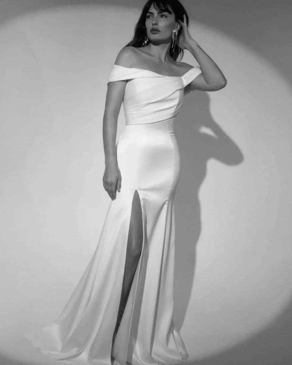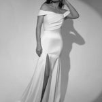 Off-the-shoulder gown with draped bodice and slit skirt.
