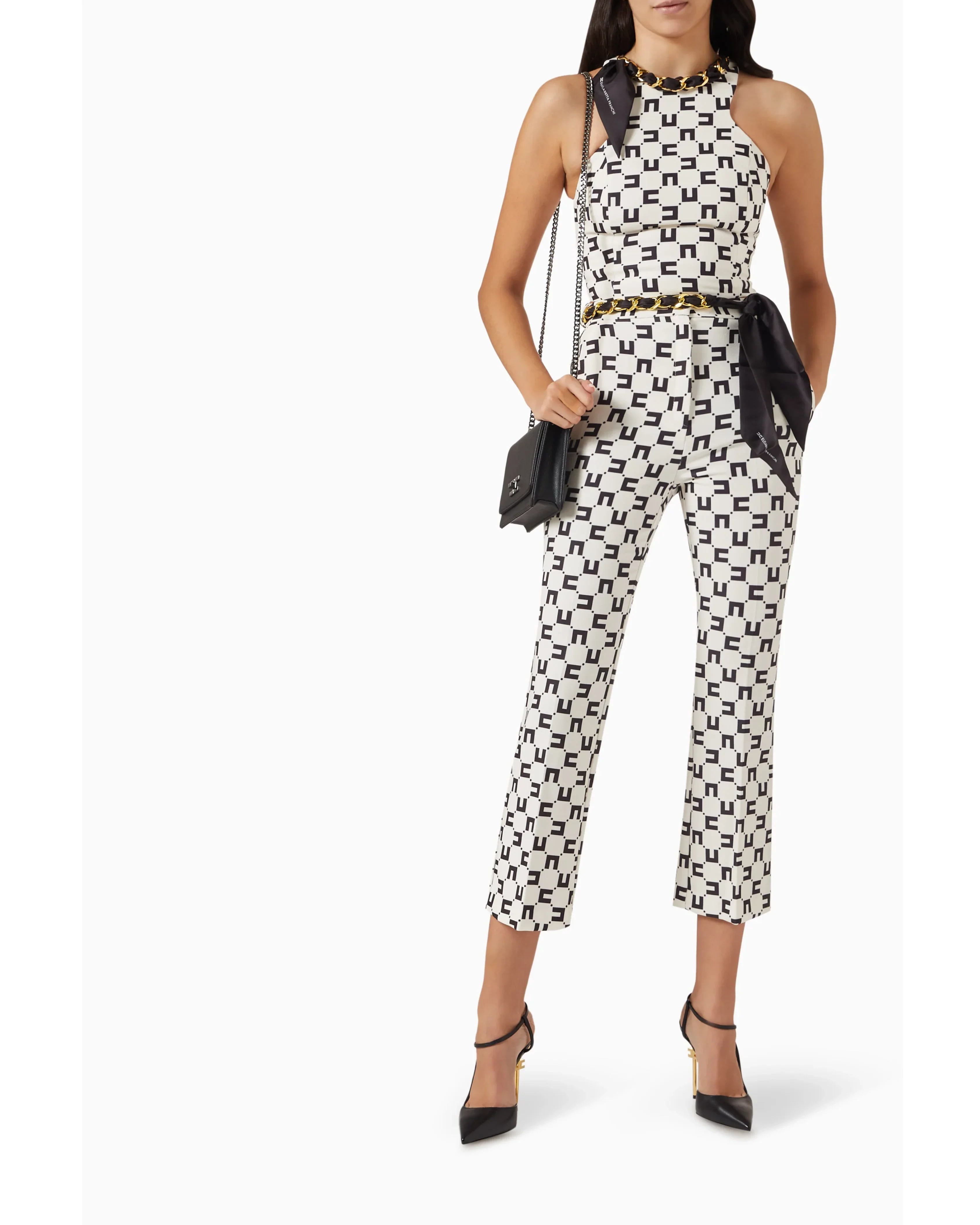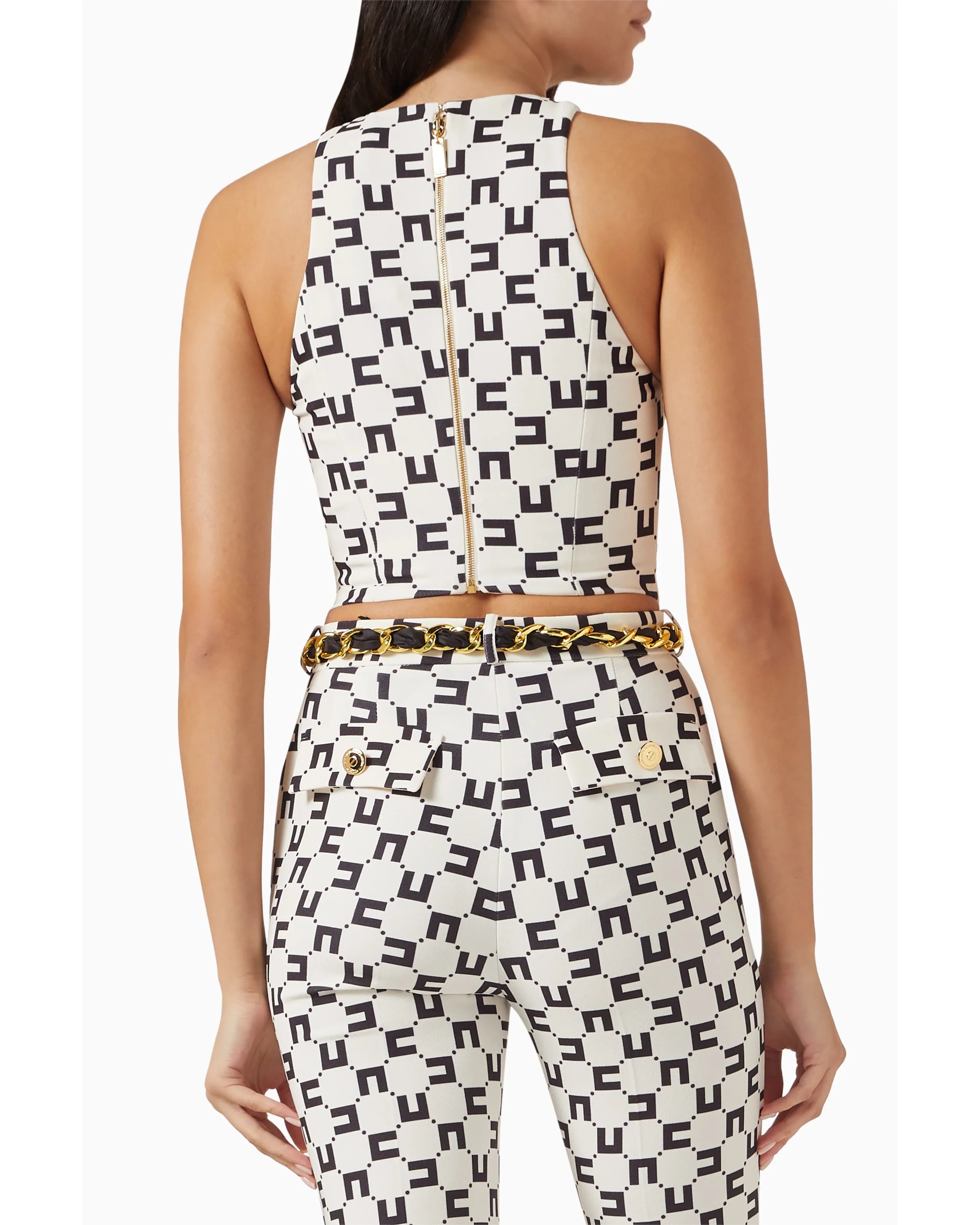 Ushering in Elisabetta Franchi's defining elegance, this slim-fit crop top is a wardrobe classic reimagined. Adorned with all-over monogram jacquard, its layered stretch-crepe makes a glamorous statement, embraced by the chain-detailed foulard neckline.