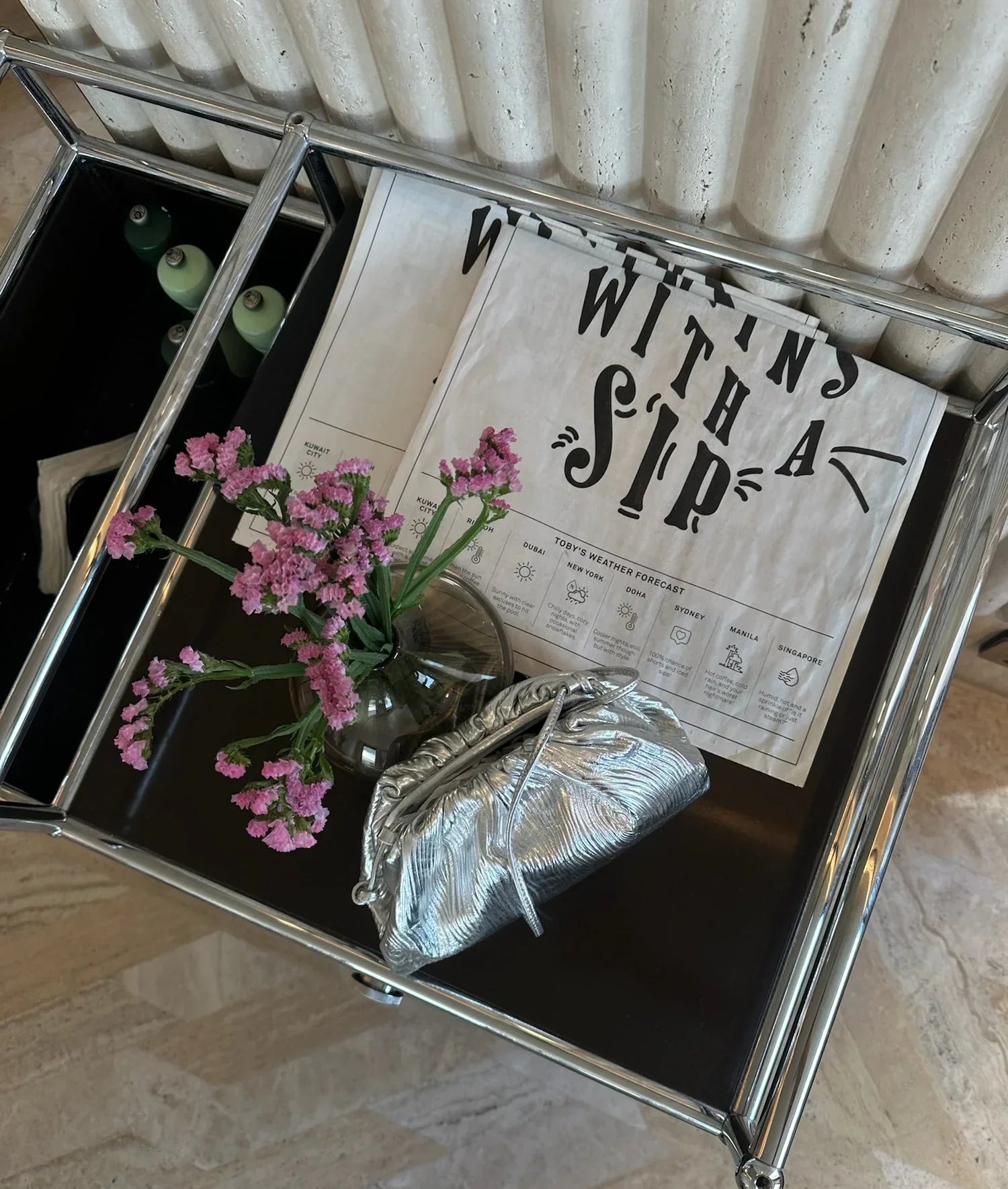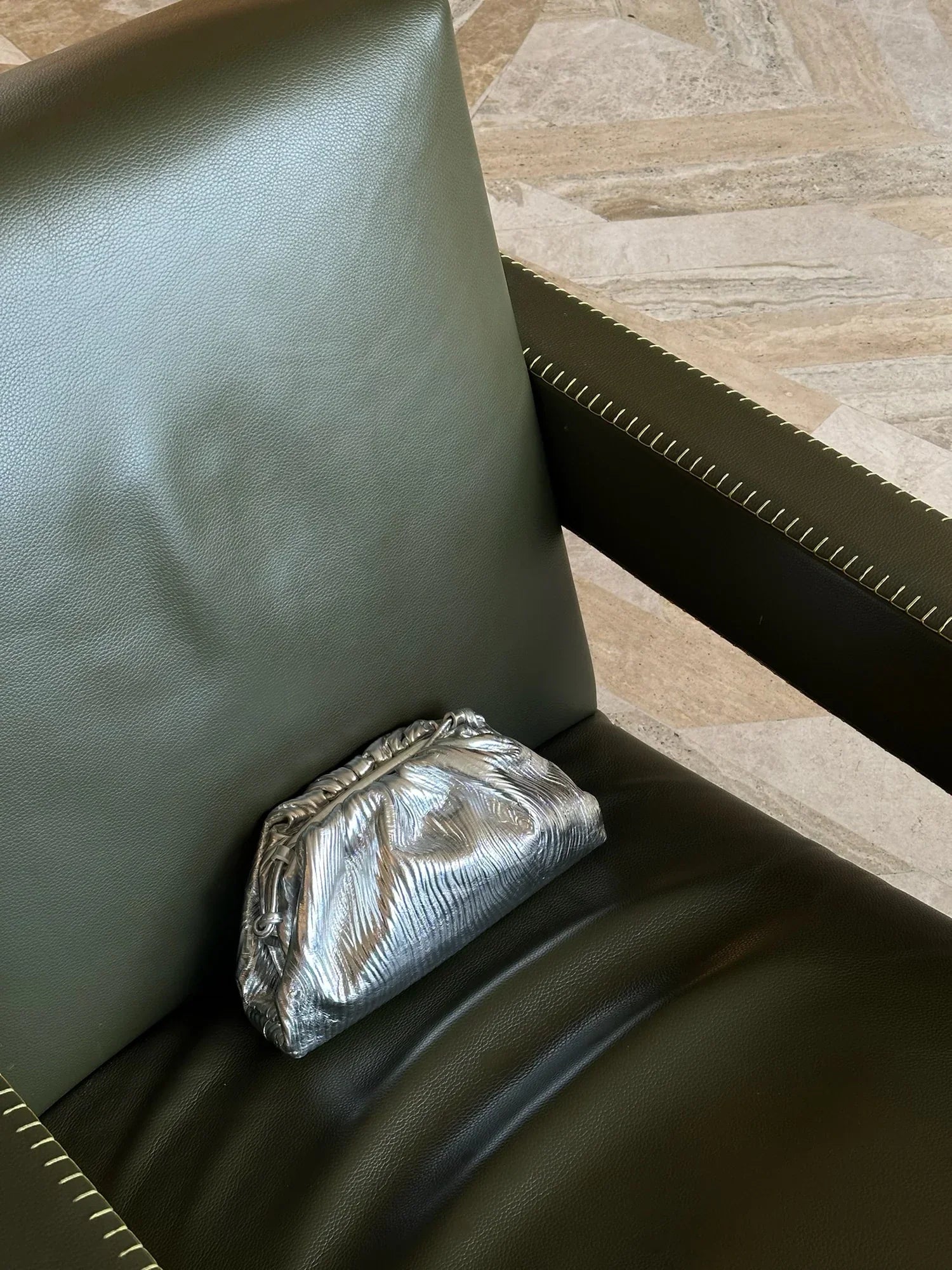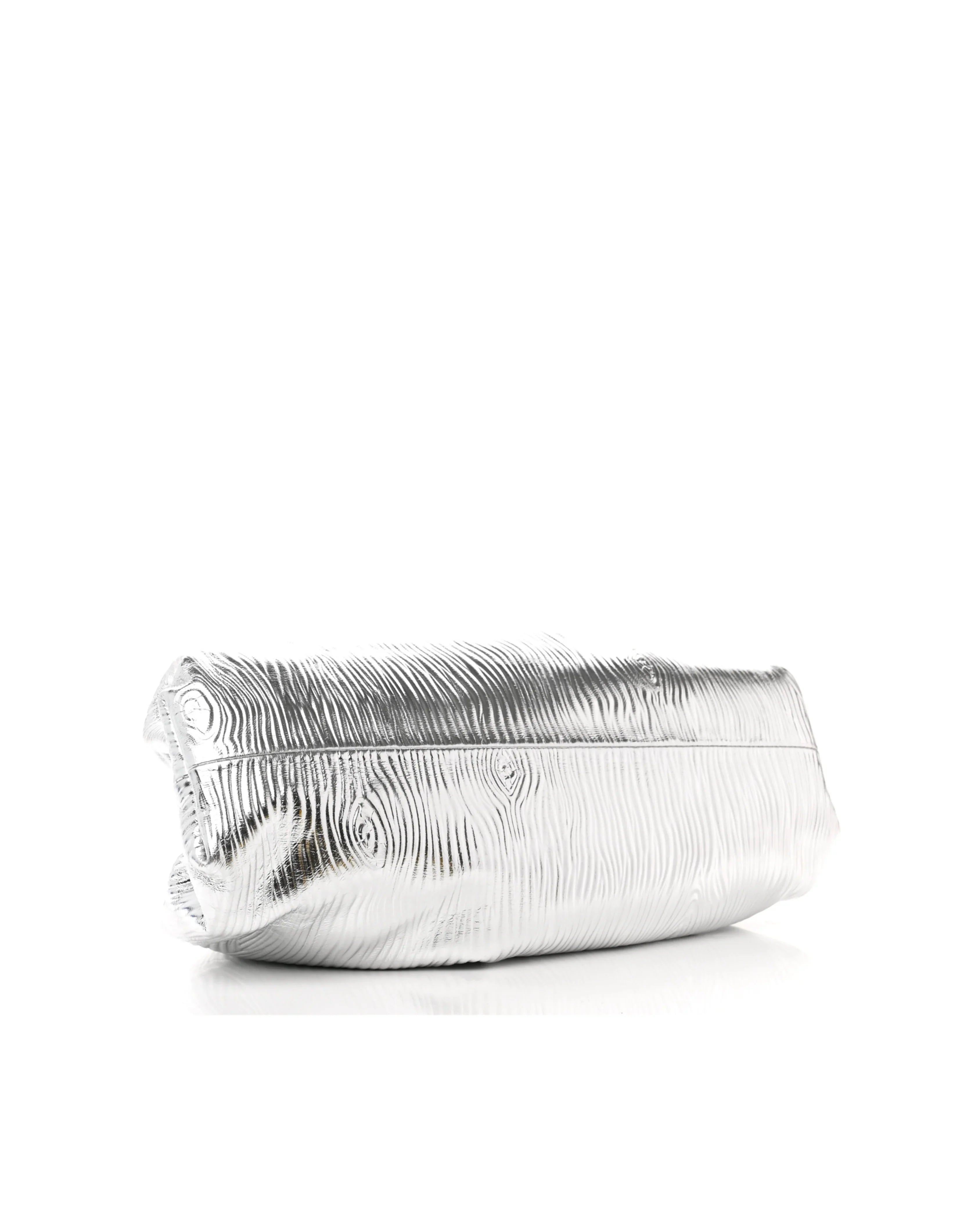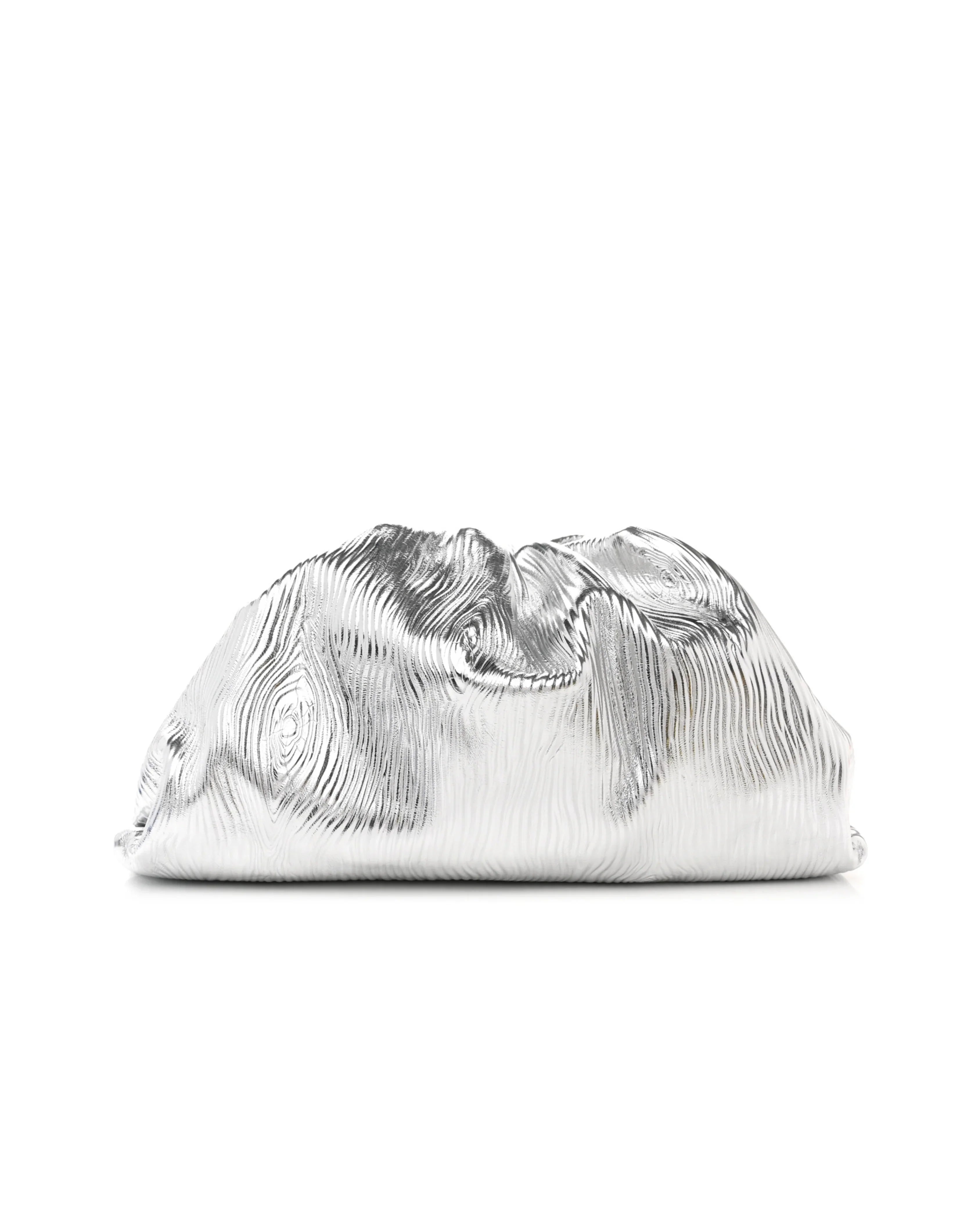 Indulge in luxury with Bottega Veneta's Silver Mini Pouch. Made in Italy, the shimmering intrecciato lambskin leather gives this pouch a signature look while its compact size is perfect for carrying just the essentials. Make a statement with this stunning accessory.