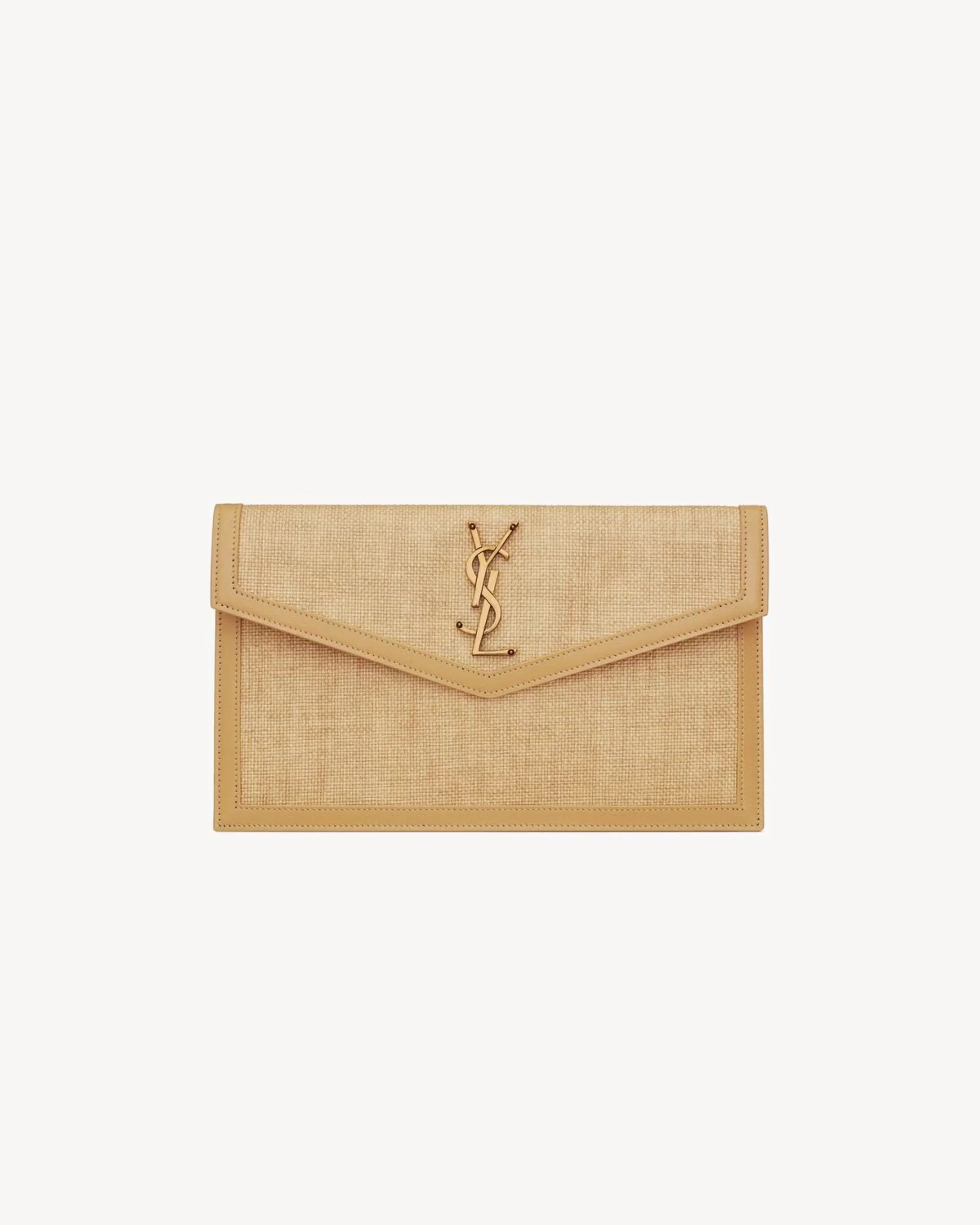 Experience refined elegance with the Saint Laurent Uptown pouch in micro raffia. This exquisite piece combines a delicate, textured exterior with a sleek silhouette, offering a sophisticated accessory that enhances any ensemble. Ideal for those who appreciate subtle luxury, it provides a compact yet stylish solution for carrying essentials.