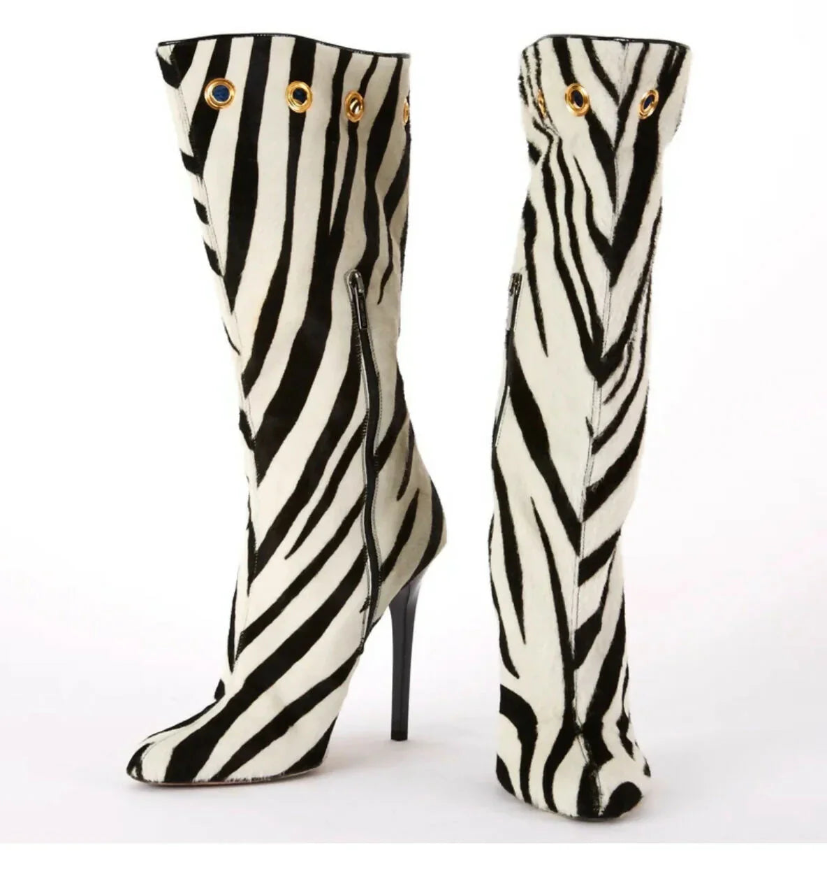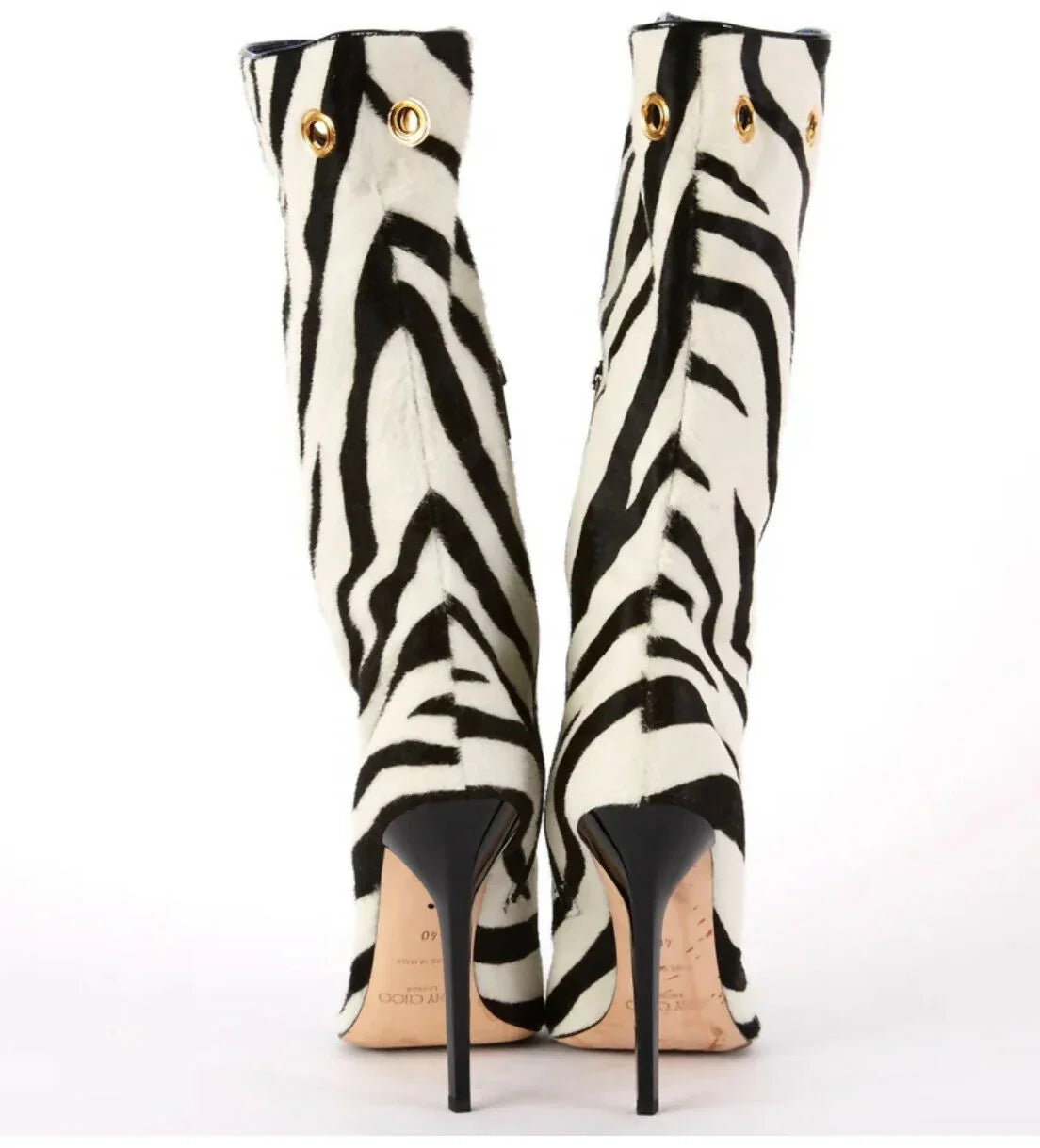 Zebra Pony Hair Stiletto Boots (Blue Snakeskin Cuff)