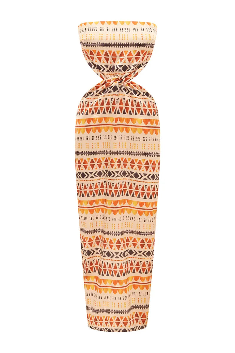 Elevate your style with this chic midi dress featuring a strapless neckline and sophisticated twist detail with cut-outs at the waist. Designed for a flattering silhouette, the garment includes an adjustable hook and eye closure and an invisible zipper for ease of wear. Made with a lightweight fabric blend, it offers comfort without stretch. Perfect for evening events or special occasions, it combines elegance with a modern edge.