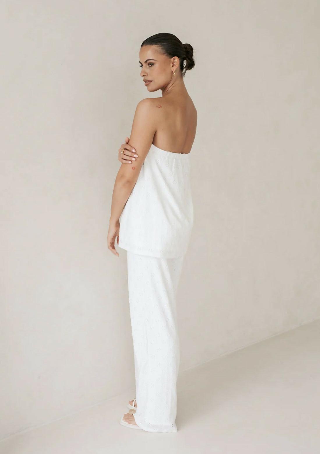 A comfy, chic set that will be on high rotation! It is made from a textured lightweight fabric with a floral broderie design. It is a strapless style featuring an elasticated neckline and relaxed longline babydoll bodice.