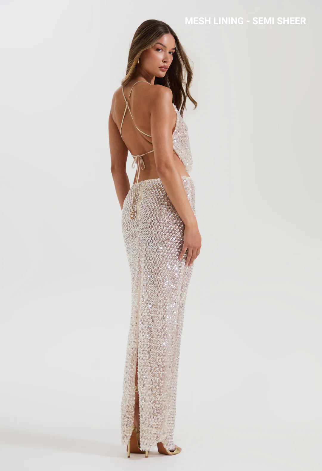 A statement piece designed to dazzle. The Quartz skirt in Champagne is crafted from our signature embellished fabric, intricately detailed with sequins and beads that shimmer with every movement. Available in two linings — satin for added coverage or mesh for a lighter, semi-sheer effect — it can be styled low on the hips or higher on the waist for a versatile fit. Finished with a discreet back zip and knee-high split for ease and comfort, it’s made to turn heads at any occasion.