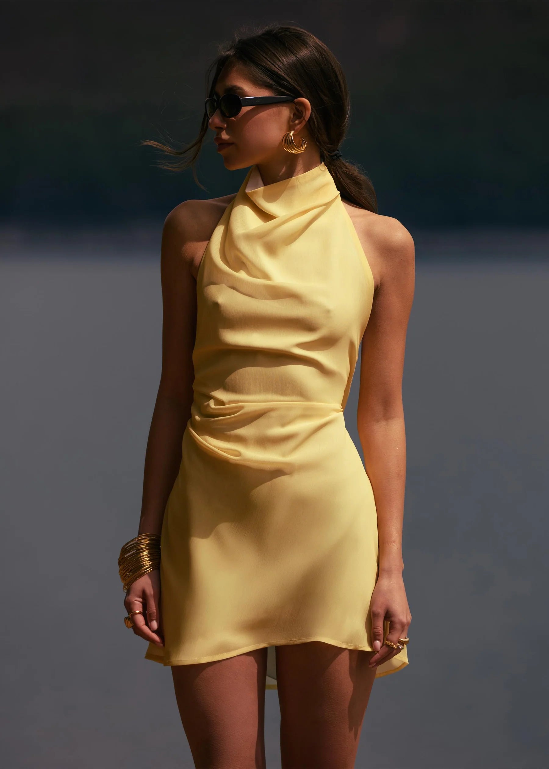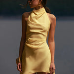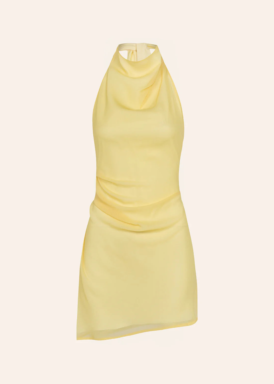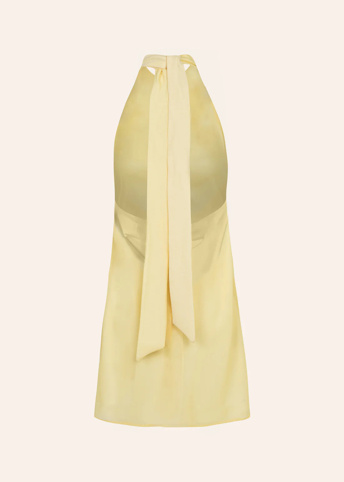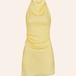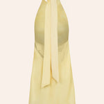 Light chiffon mini dress with facing, featuring a high neckline that ties at the back with long strands that highlight the open back. Designed in a soft butter yellow shade, it’s the perfect choice for effortless summer looks.