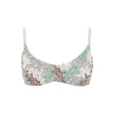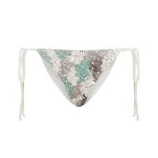 Sequin bralette bikini top featuring silver, mint and champagne tones. Designed with thin adjustable straps and a soft sculpted shape. A statement swim piece with a shimmer finish. Sequin tie-side bikini bottoms in silver, mint and champagne tones. Finished with adjustable side ties and a flattering minimal silhouette.