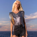 Cowl-neck chainmail top with structured shoulders.