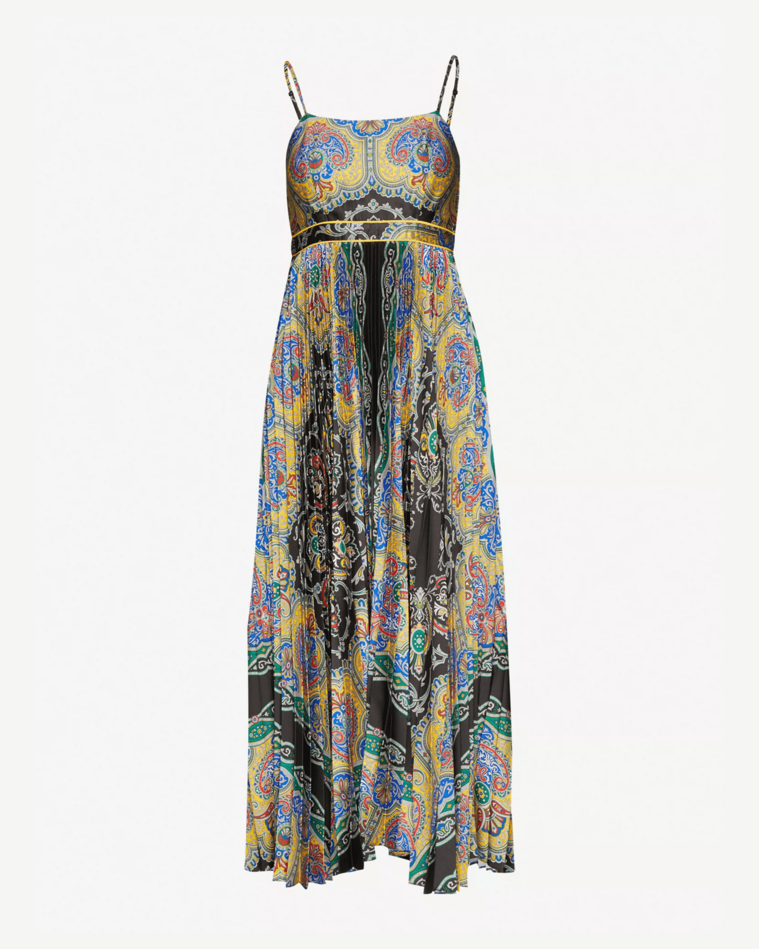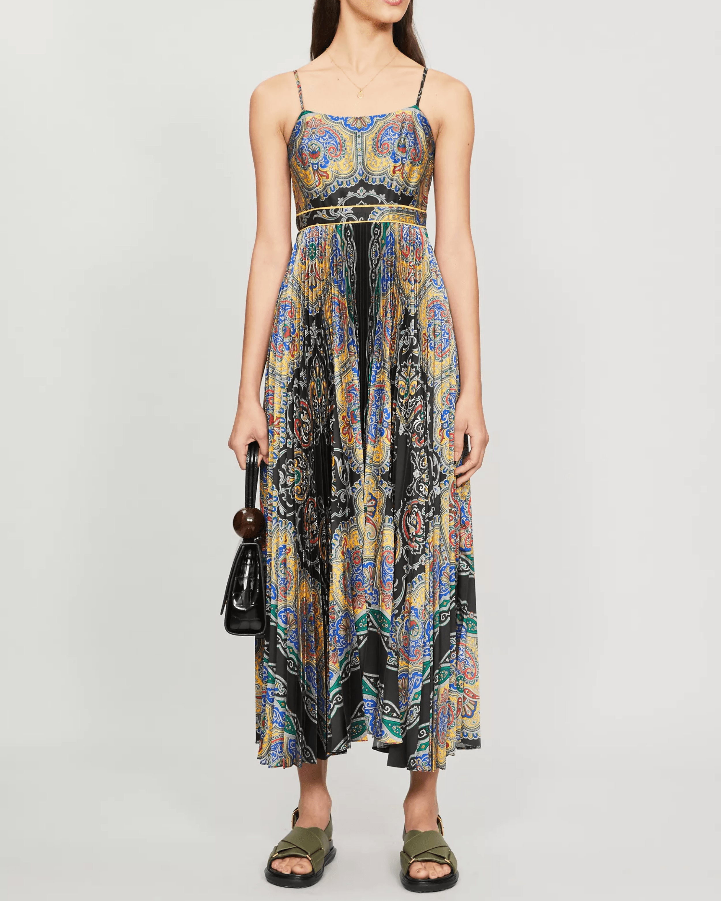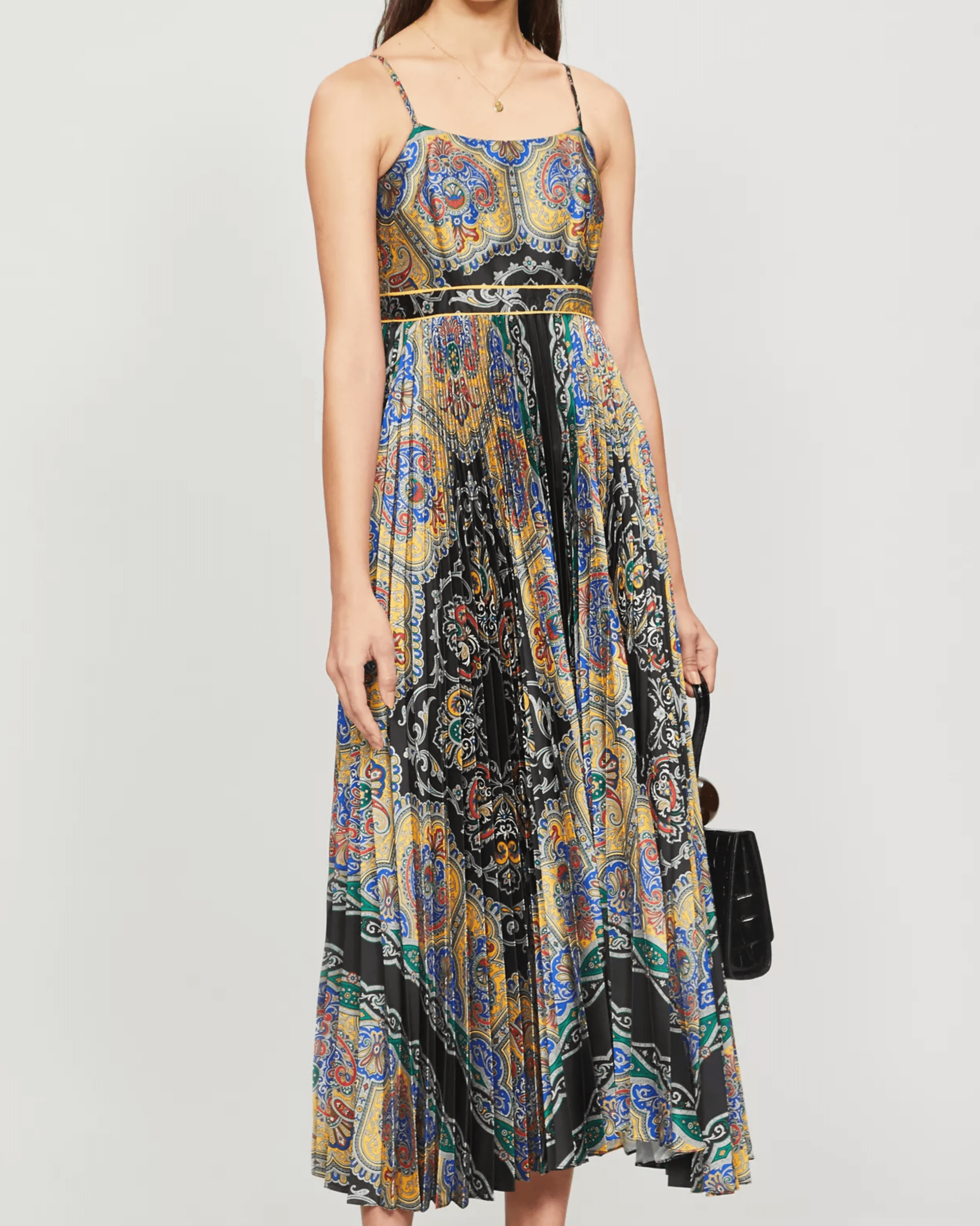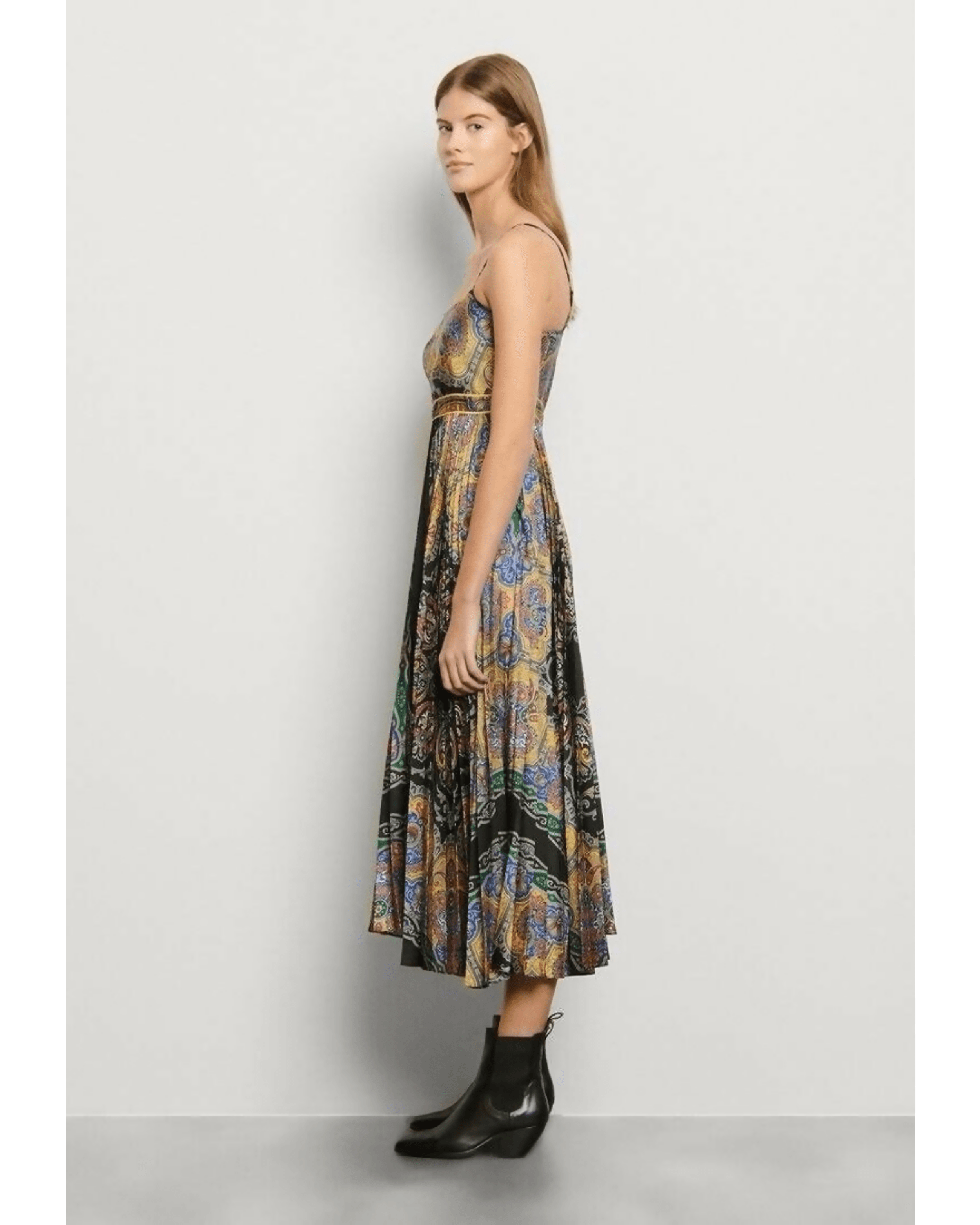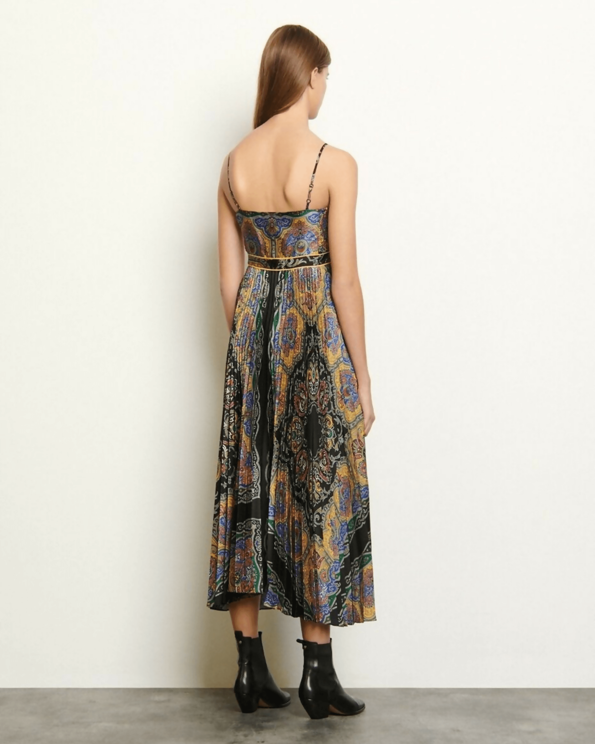 Evelyn Cheterie, founder and designer at cult French label Sandro travelled the globe to find inspiration for this season's collection. Unfortunately we didn't manage to get a copy of the itinerary but you can (almost) track her movements on this Riana sleeveless satin dress. A vibrant paisley style is piecedtogether with the daring V-neck that swoops down to a romantically draped handkerchief hem.